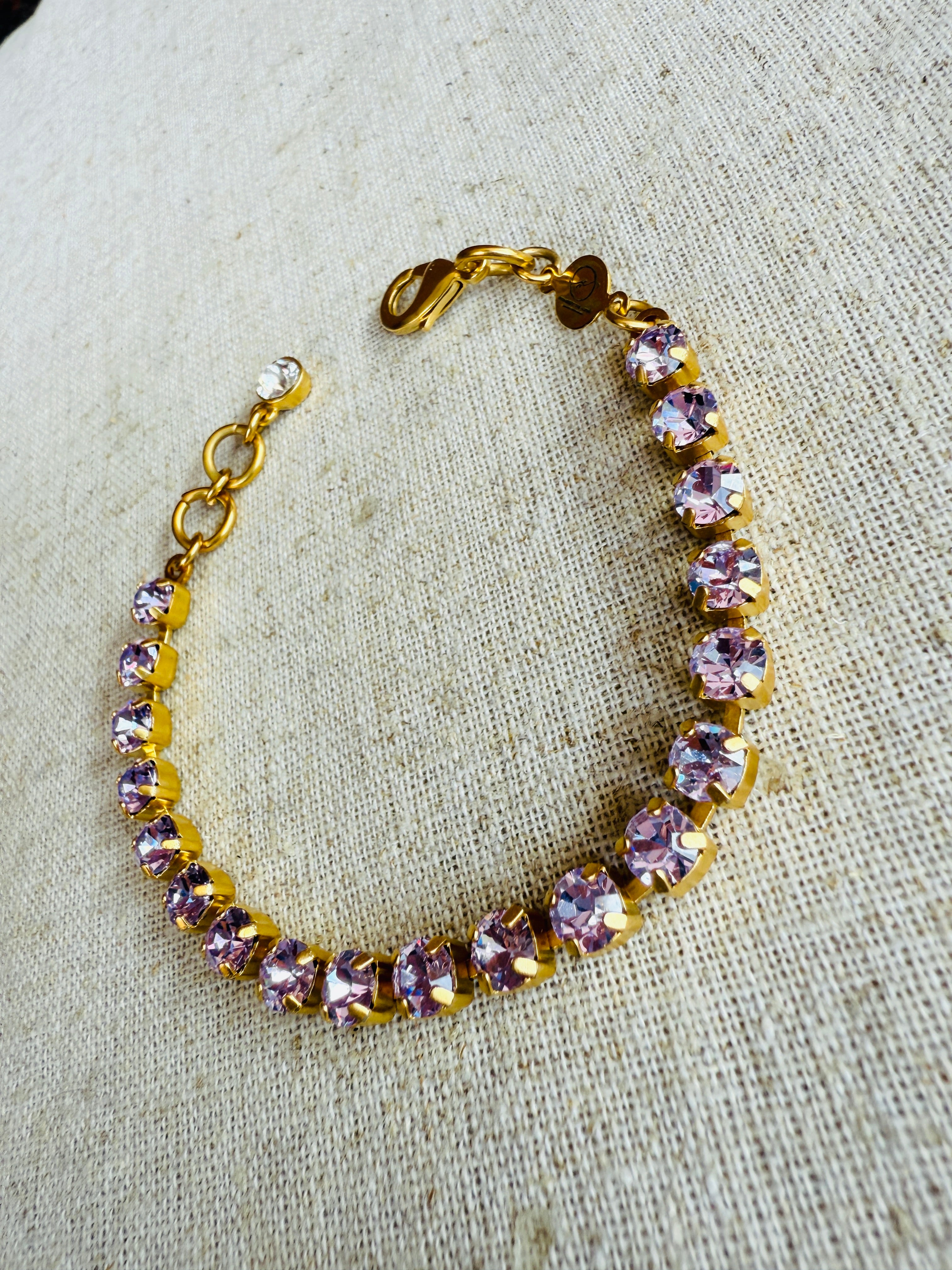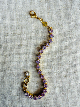 The Clara crystal tennis bracelet embodies a minimalist style while maximizing shine with 19 (5mm) high quality crystals precisely aligned for optimal sparkle. It features a matte gold finish, a lobster claw clasp, a logo disc, a crystal end charm, and adjustable sizing for a perfect fit. Want to see a different color? Send us a message.