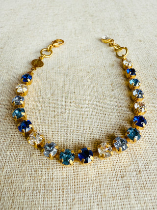 Avery is every shade of blue your heart desires, set in a gold finish. Highest quality Australian crystals, 5mm size. Adjustable sizing between 7"-7.5", extender chain, logo disc, lobster clasp closure, and crystal end charm.