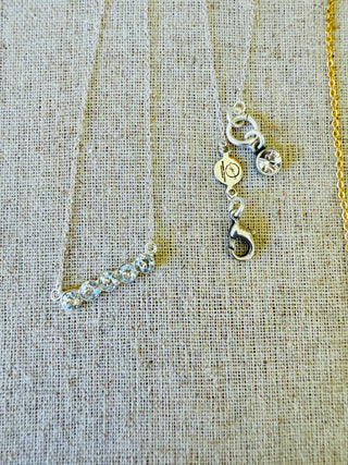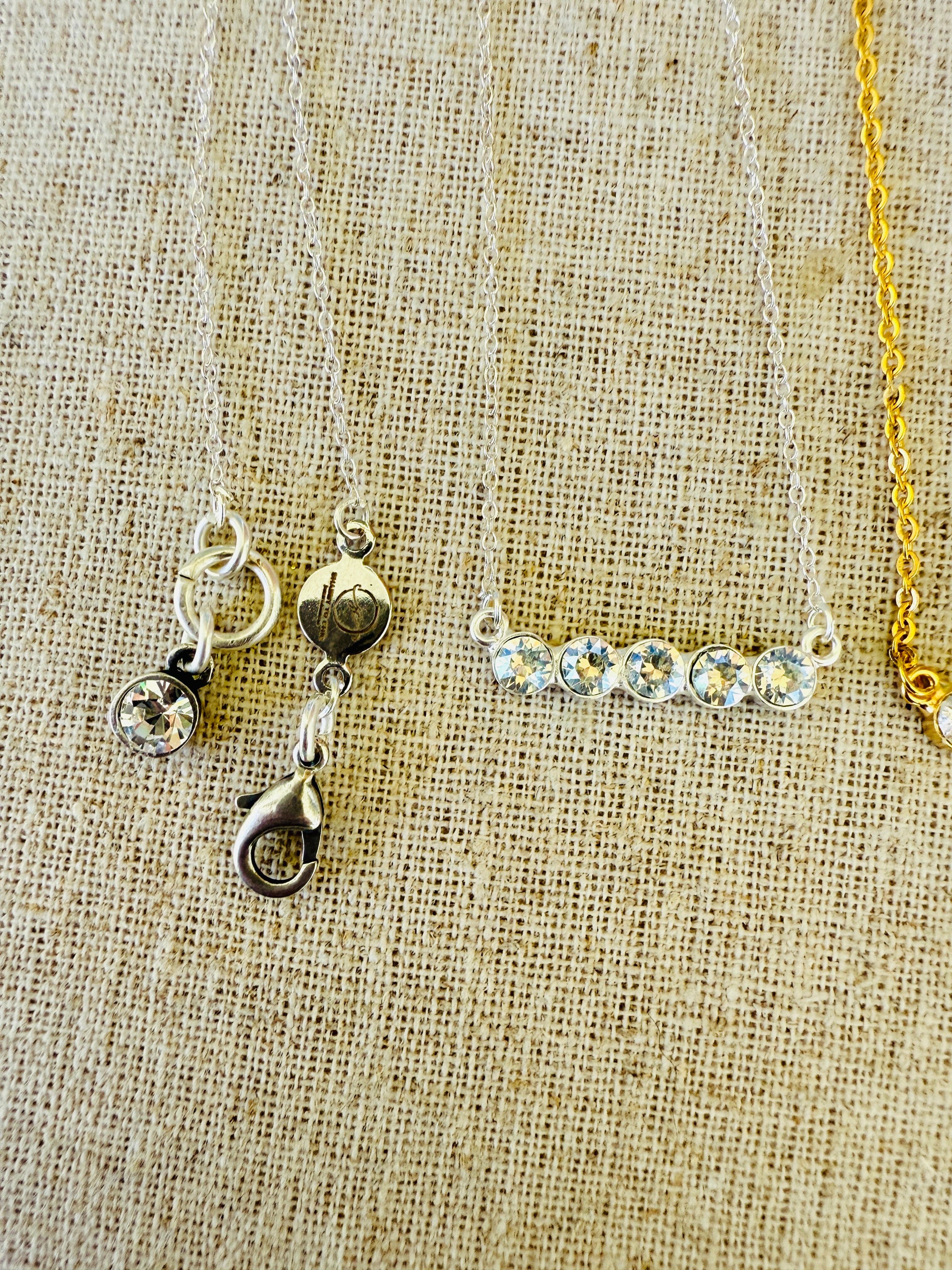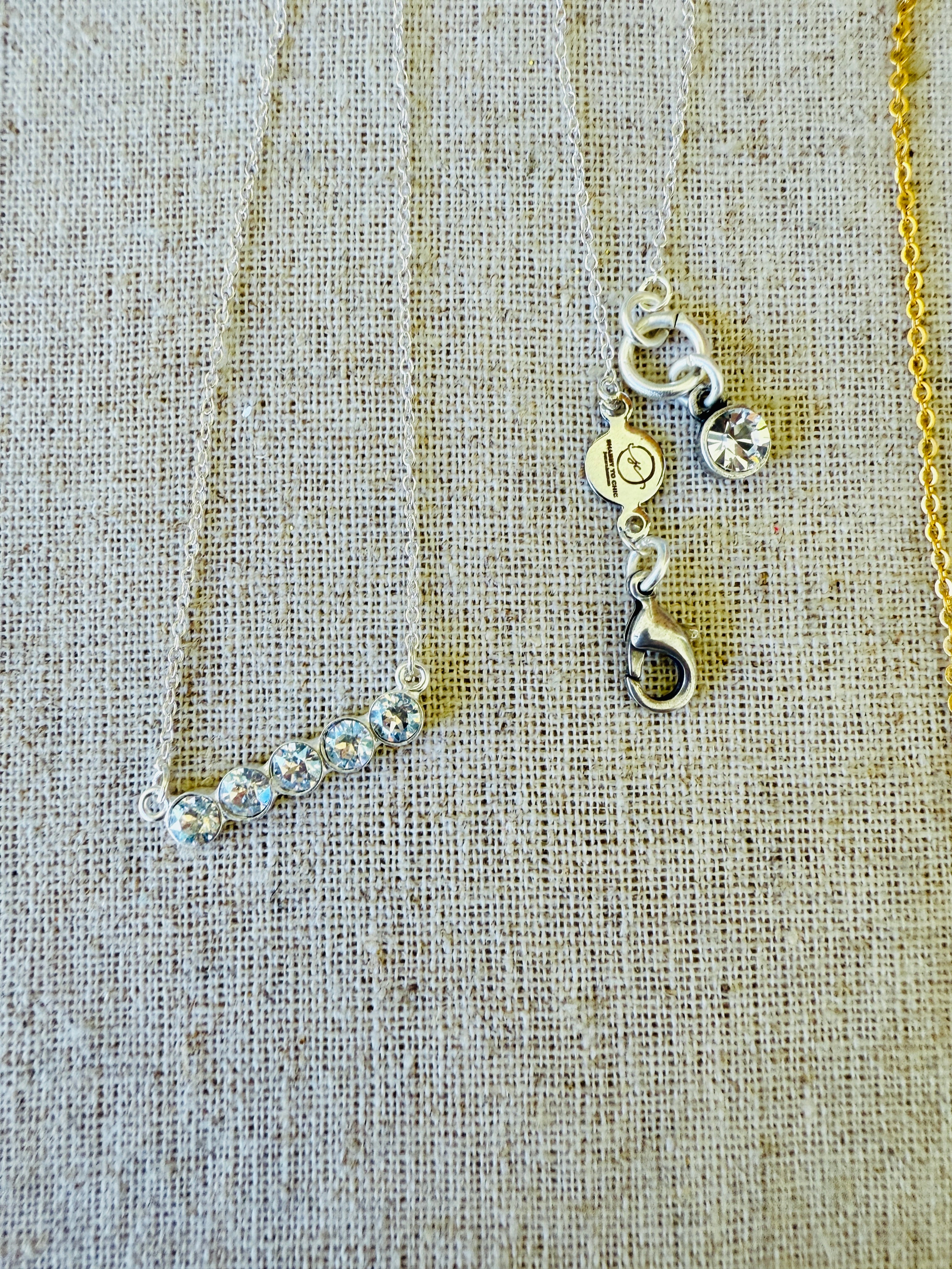Lilly is her name, sparkle is her game! Five dazzling high quality crystals perfectly aligned in a sleek bar style setting, catching the light with every movement. Delicate yet modern, this necklace layers beautifully or shines all on its own. Adjustable chain with lobster clasp. Lead and nickel free.