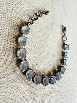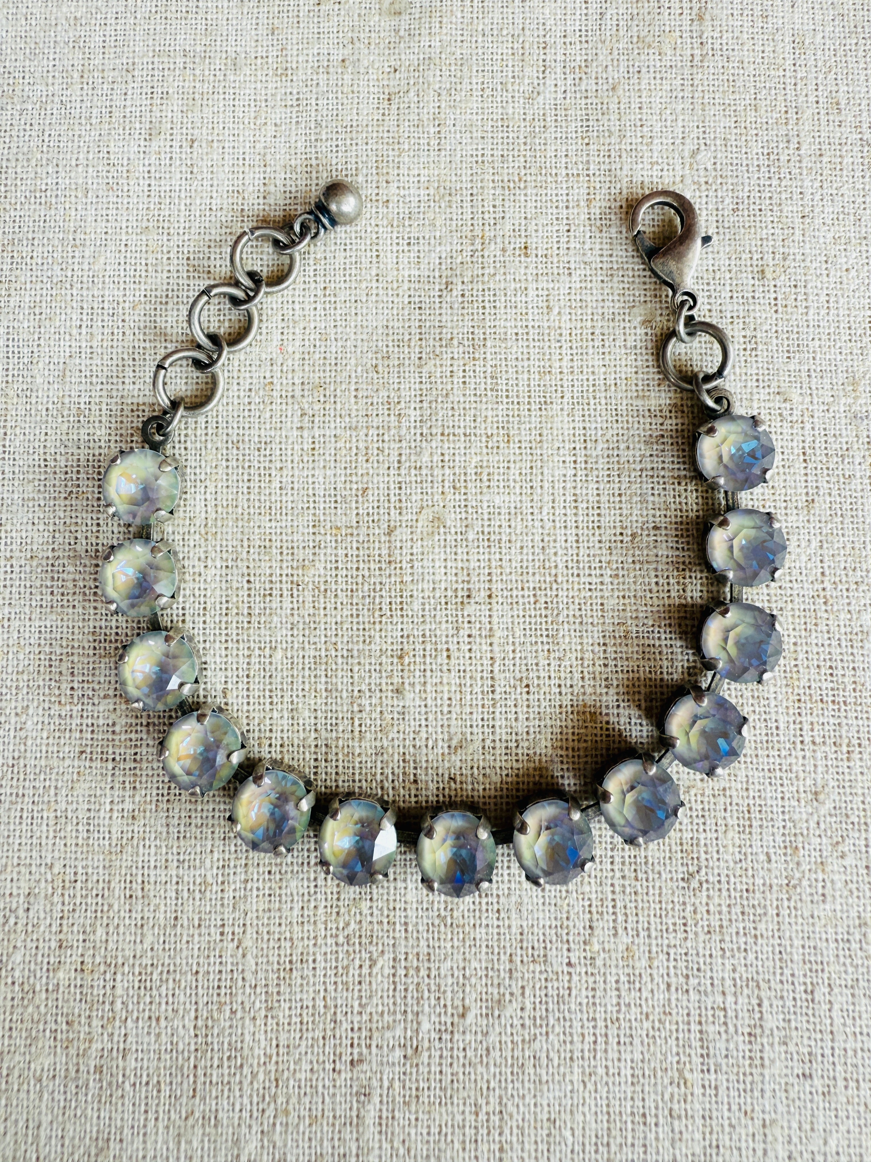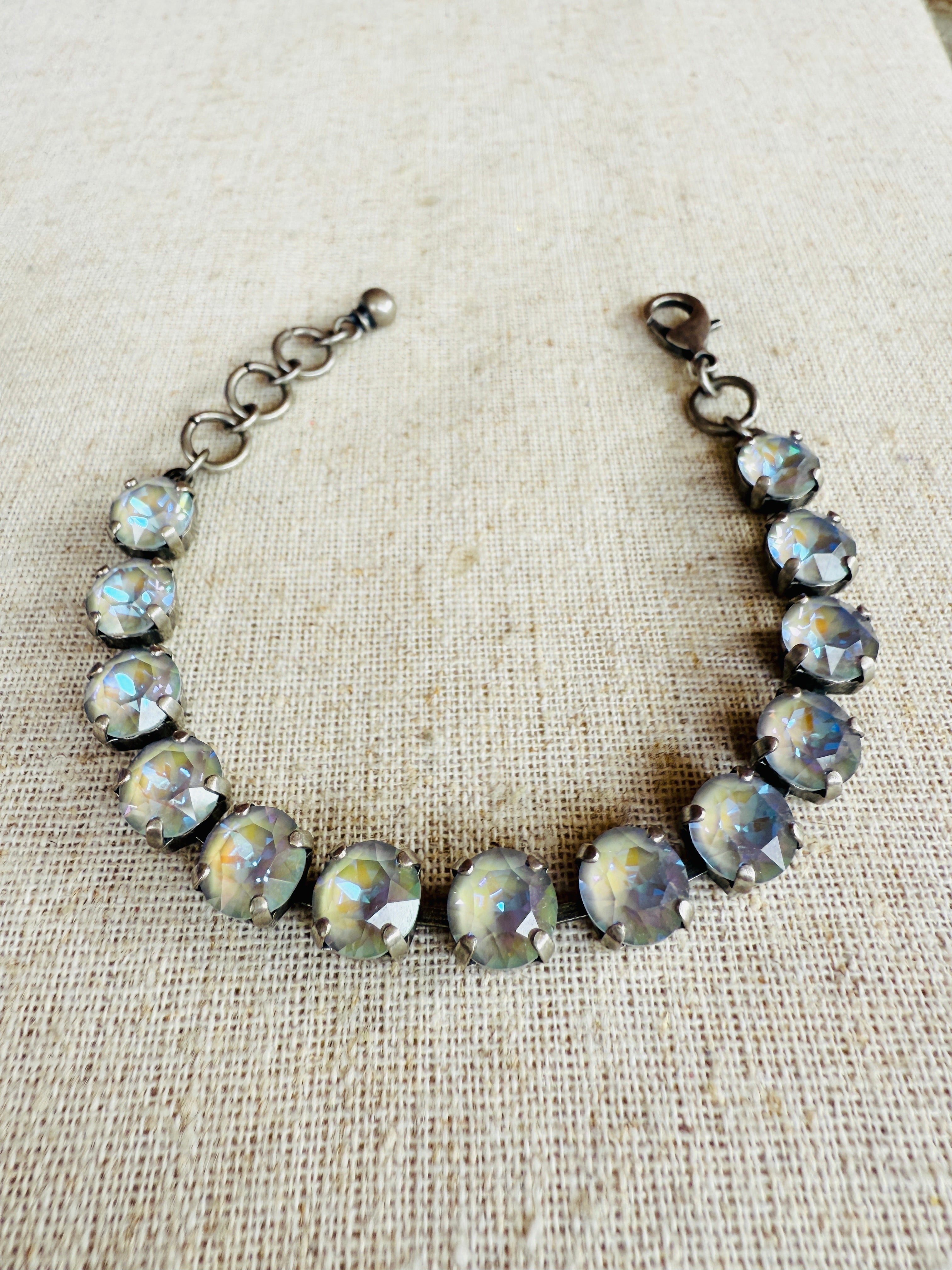 Taylor is subtle but packs lots of sparkle! High quality crystals that have a matte gray base and iridescent finish that highlights every facet. These are the delite series, it's more of a powdery soft sparkle, less intense than traditional crystals. We like to call it creamy sparkle. Set in an antique silver setting with a convenient lobster clasp, extender chain for custom sizing, and end charm.