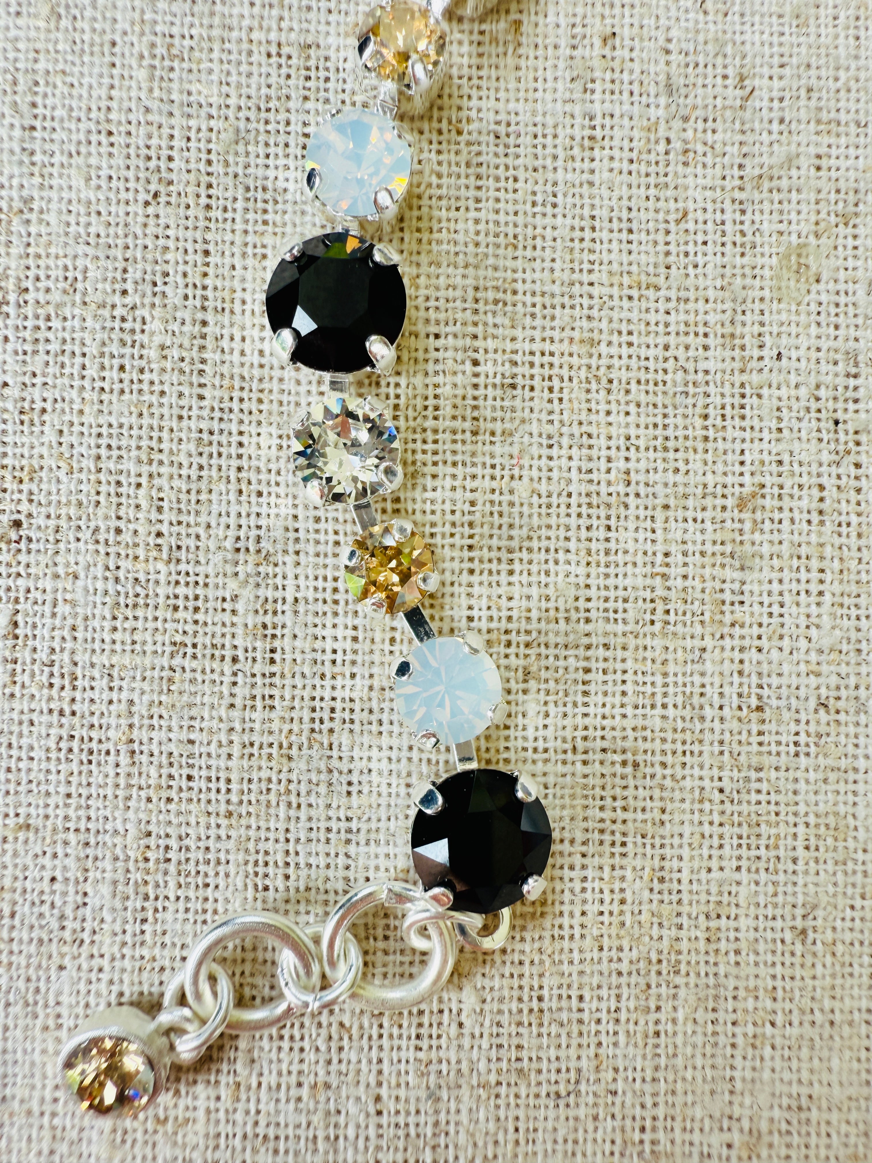 New Style! Our 3 most popular sizes in one sleek design. 8mm, 6mm, and 4mm in alternating neutral hues of onyx, white opal, clear, and gold champagne. Highest quality crystals guaranteed to deliver all the sparkle. Set in a bright shiny silver finish. The lobster claw clasp and extender chain provide a secure and adjustable fit, while the crystal end charm adds a touch of extra sparkle. Adjustable from 7”-7.5”
