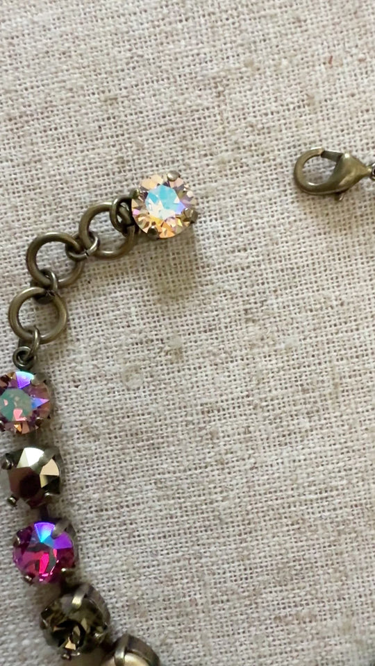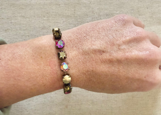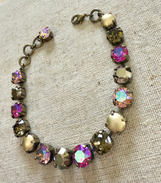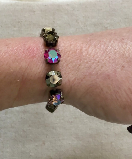 The Amber bracelet has an antique gold setting, with alternating hues of golds, bronze, olive green, and fuchsia. Bracelet is adjustable between 7" and 8". Finish: Antique Gold Crystals: gold, bronze, olive, fuschia (8mm) Shape: Round ...Sale price $33.00Regular price $55.00 -