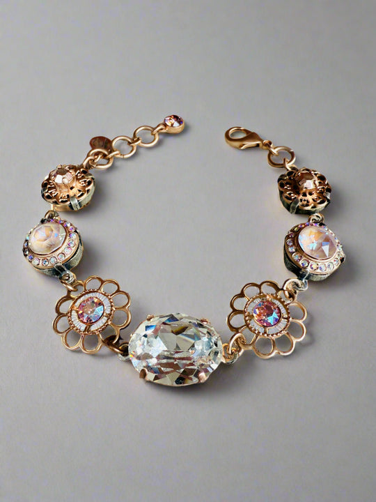 Sandy -neutral hued crystal tennis bracelet of your dreams. 16 settings (6mm) high quality crystals precisely aligned for optimal sparkle. It features a satin gold finish, a lobster claw clasp, a logo disc, a crystal end...Regular price $50.00 -