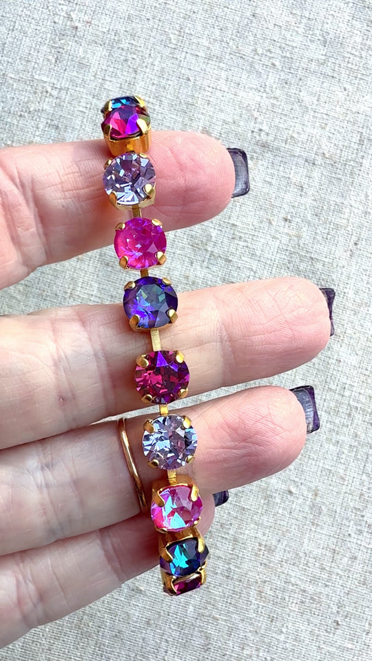 Dreamy pinks, lilacs, and iridescent lavender join together to display a beautiful array of colors. The lighter pink crystals are ever-so-subtly a square shape giving a little edgy flair. Silver matte finish, adjustable sizing between 7"-7.5",...Regular price $65.00 -