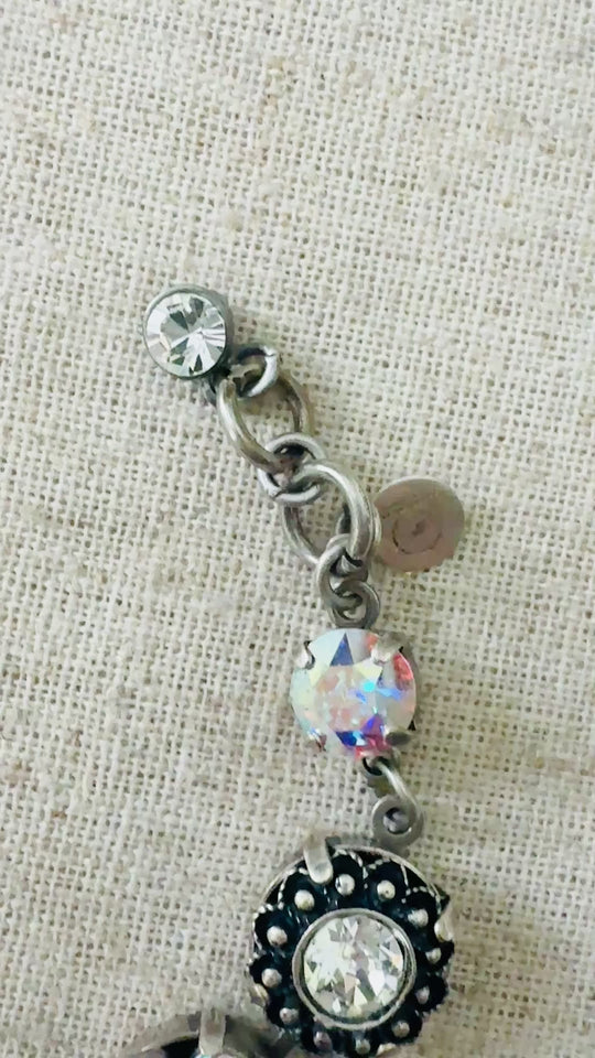This bracelet features an antique silver finish, ornate detailing, and flower-inspired design elements, all accented with sparkling AB crystals. The piece is secured by a lobster clasp and includes an extender chain, along with a logo...Regular price $112.00 -