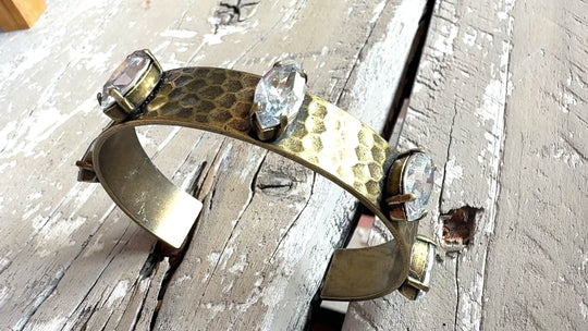 Get ready to stand out with Addison's eye-catching style. The hammered antique gold cuff features Navette shaped crystals in a soft, subtle light blue hue. Effortlessly slip this cuff-style bracelet on and off for a...Regular price $117.00 -