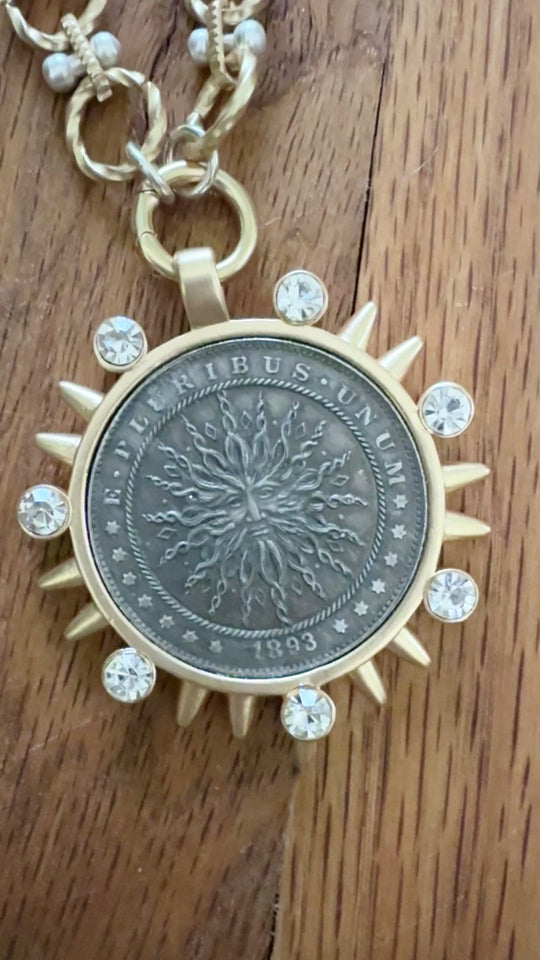 This stunning pendant necklace features a sunburst medallion coin replica in a luxurious matte gold finish. Coordinating chain has matte gold and matte silver finishes. Sparkling clear crystals and delicate spike accents add a touch of...Regular price $114.00 -