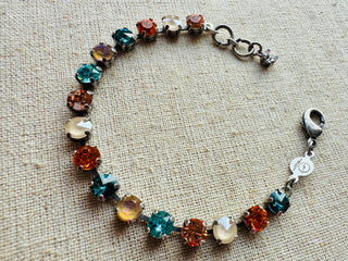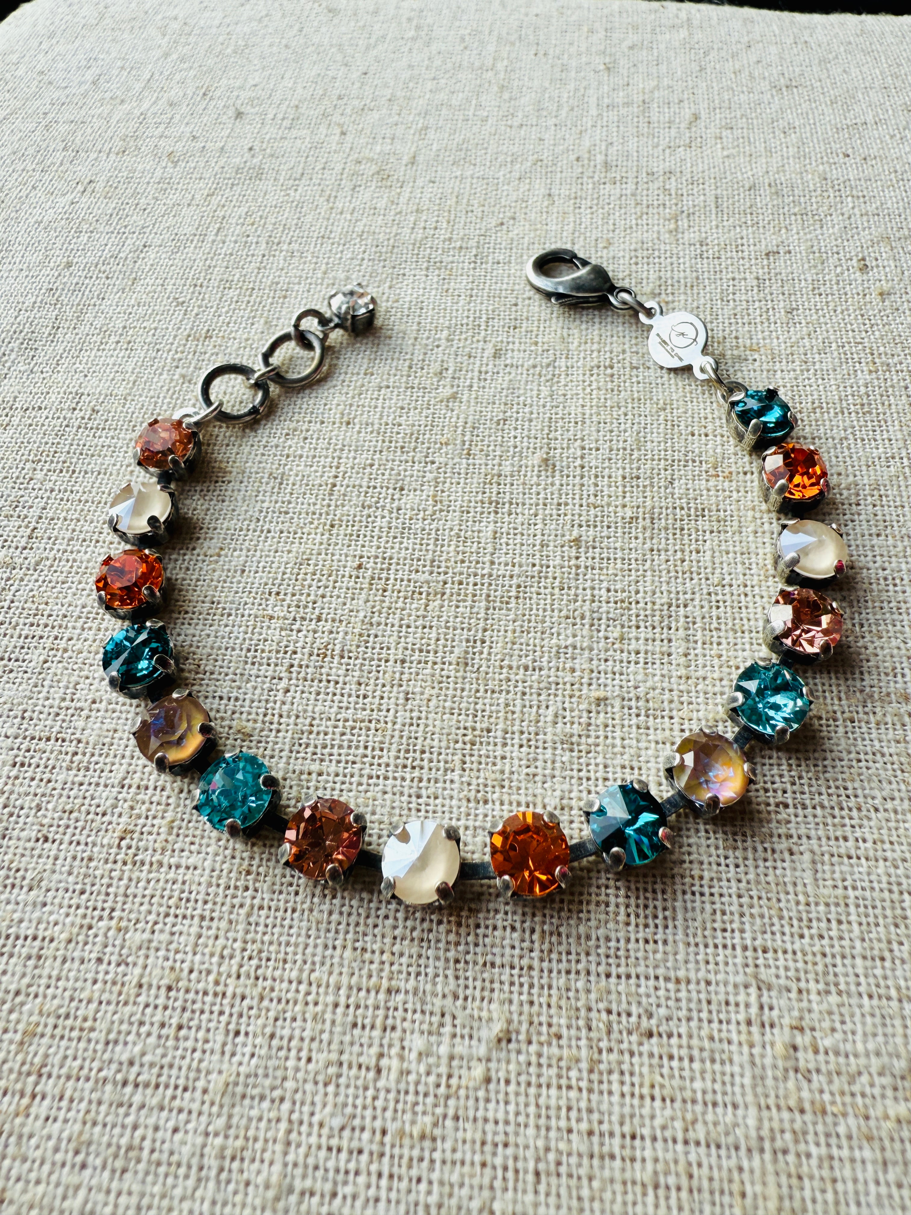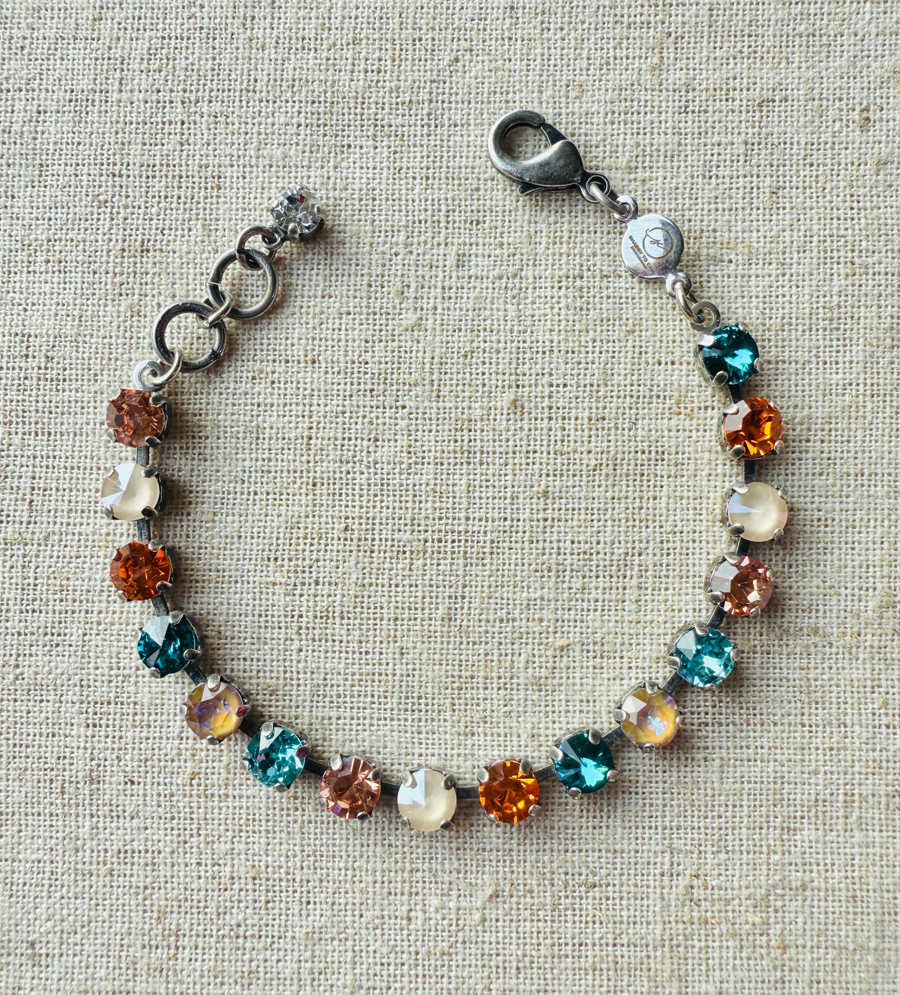 Burnt orange, teal, cream opal, and deep peach make the perfect autumn horizon. Picture this on your wrist with a perfect latte and feel all the cozy autumn vibes. Adjustable length between 7" - 7.5", lobster clasp closure.