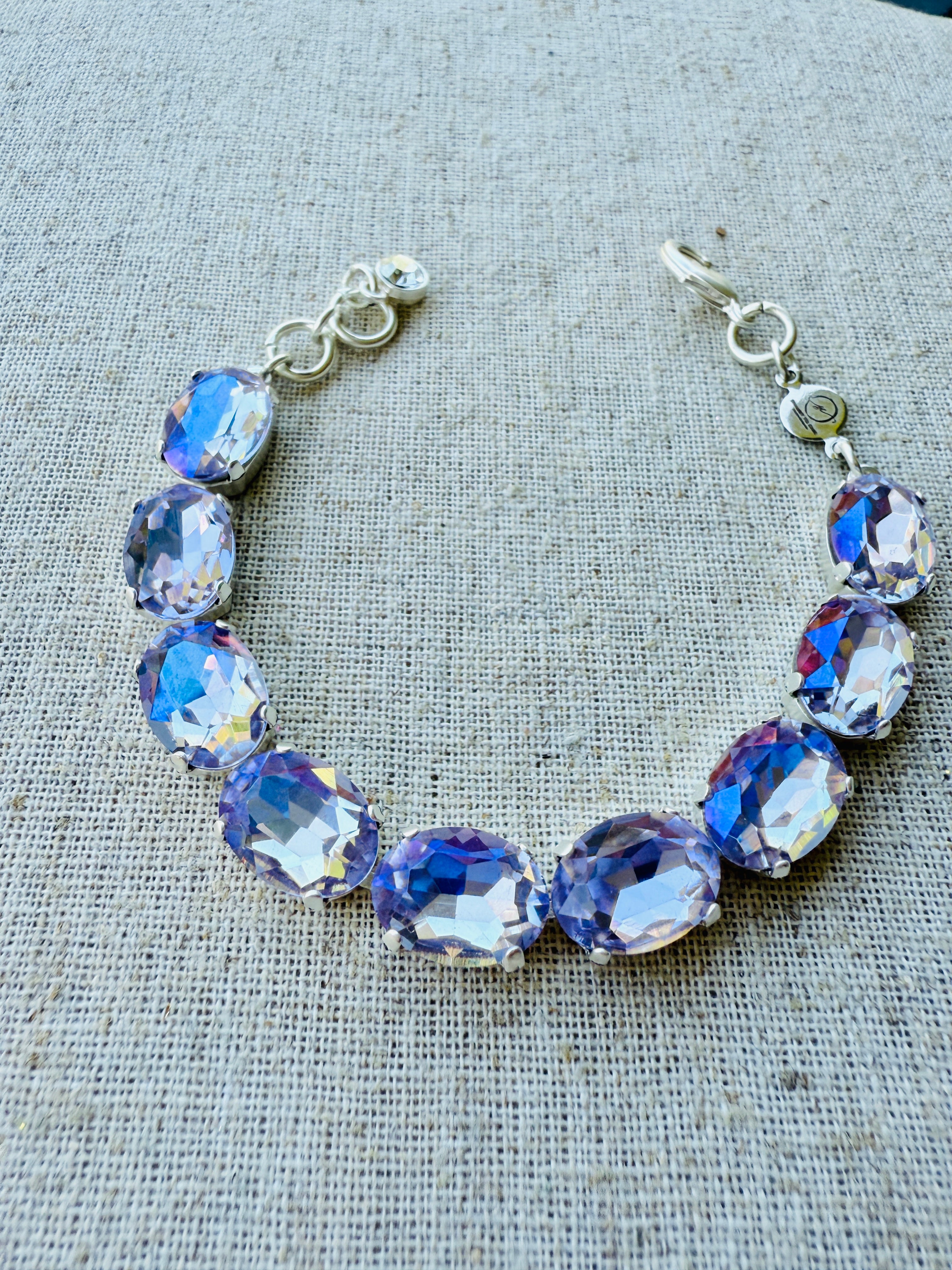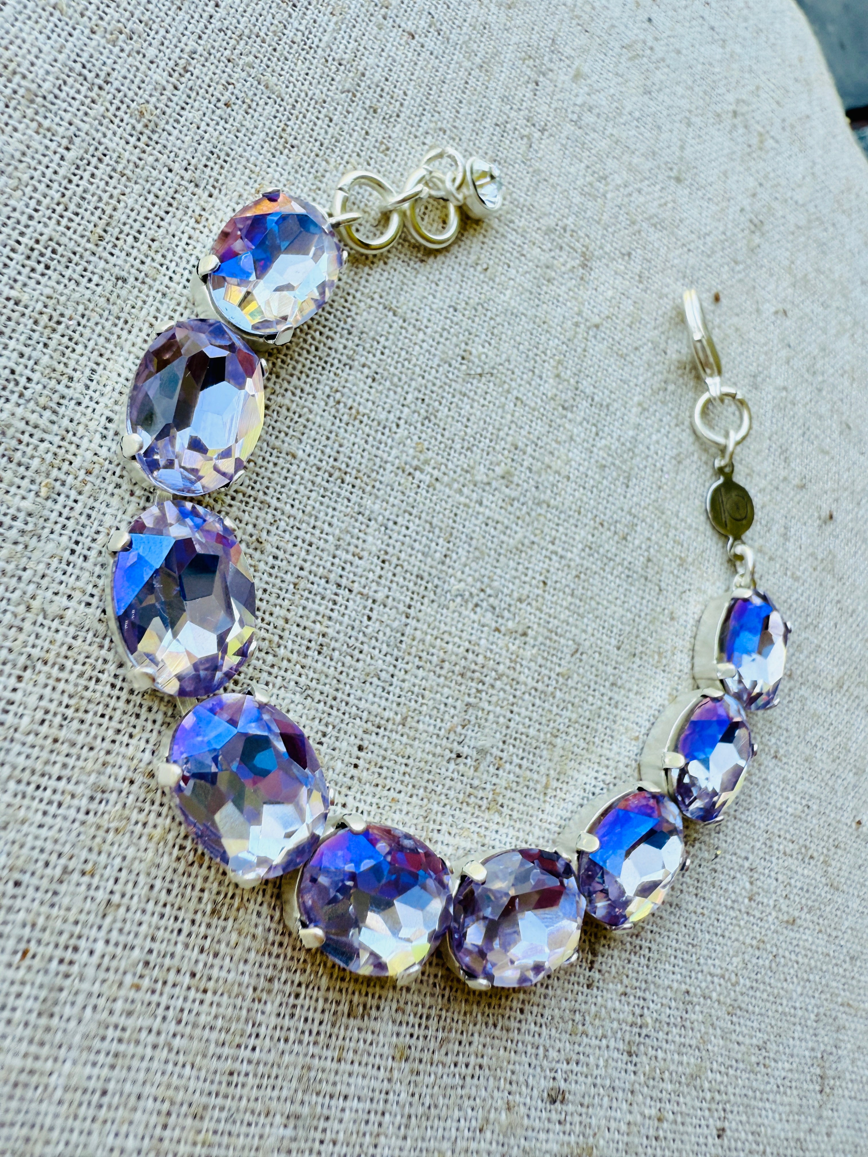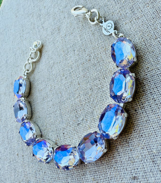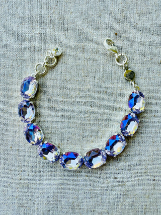 Get ready to sparkle with Christa Lilac Oval Cut Crystal Tennis Bracelet. The faceted crystals bring a pop of brilliant lilac to your wrist, while the oval shape adds a touch of sophistication. Plus, with adjustable sizing, an extender chain, and a logo disc, you'll have a comfortable and secure fit. The matte silver finish and attention to detail make this bracelet a must-have accessory.