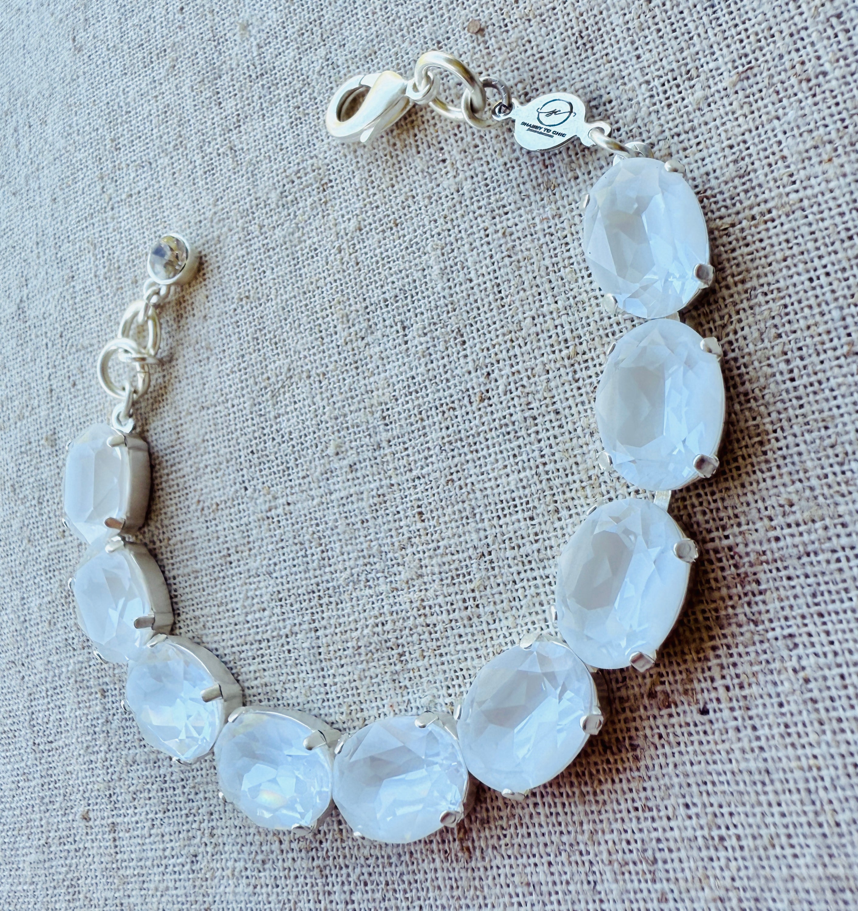 Blanc is next level style! Oval Cut Crystal Tennis Bracelet with faceted crystals bring a pop of brilliant charm to your wrist. Adjustable sizing, an extender chain, and a logo disc, you'll have a comfortable and secure fit. The matte silver finish and attention to detail make this bracelet a must-have accessory.