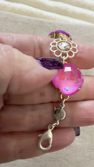 Complete your outfit with this orchid and pink crystal bracelet that features unique flower spacer details. You'll love the adjustable sizing, complete with an extender chain, logo disc, lobster clasp, and end charm. Plus, this crystal bracelet comes with a satisfaction guarantee.