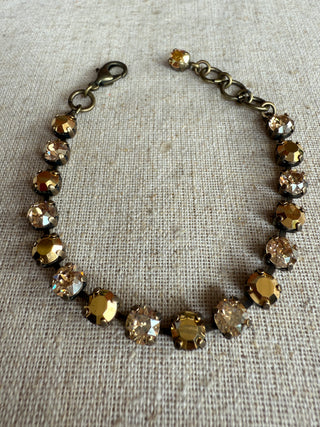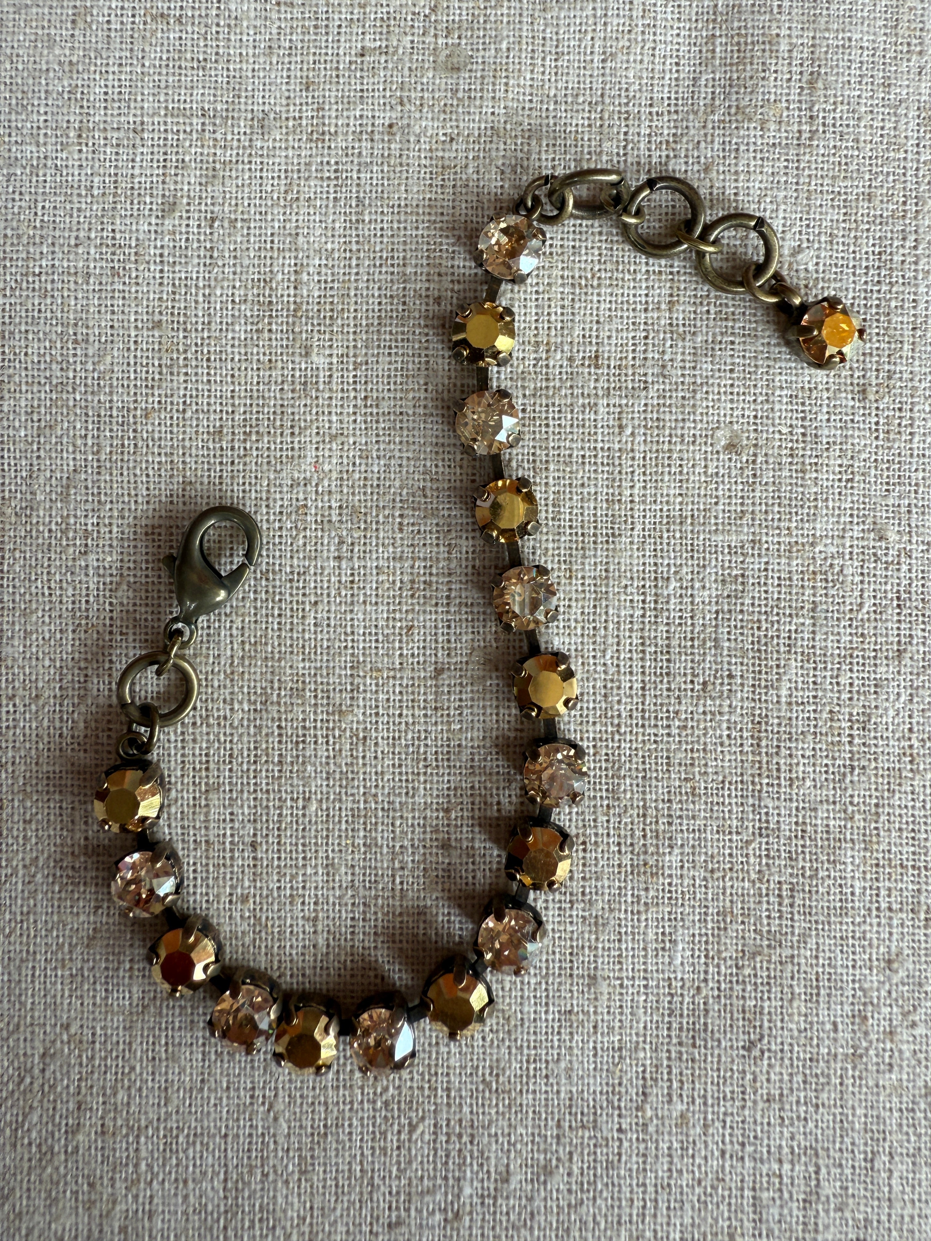 Marissa has all the colors of fall wrapped into one sparkly bracelet. She features a antique gold finish, a lobster claw clasp, a logo disc, a crystal end charm, and adjustable sizing for a perfect fit. Want to see a different color? Send us a message.