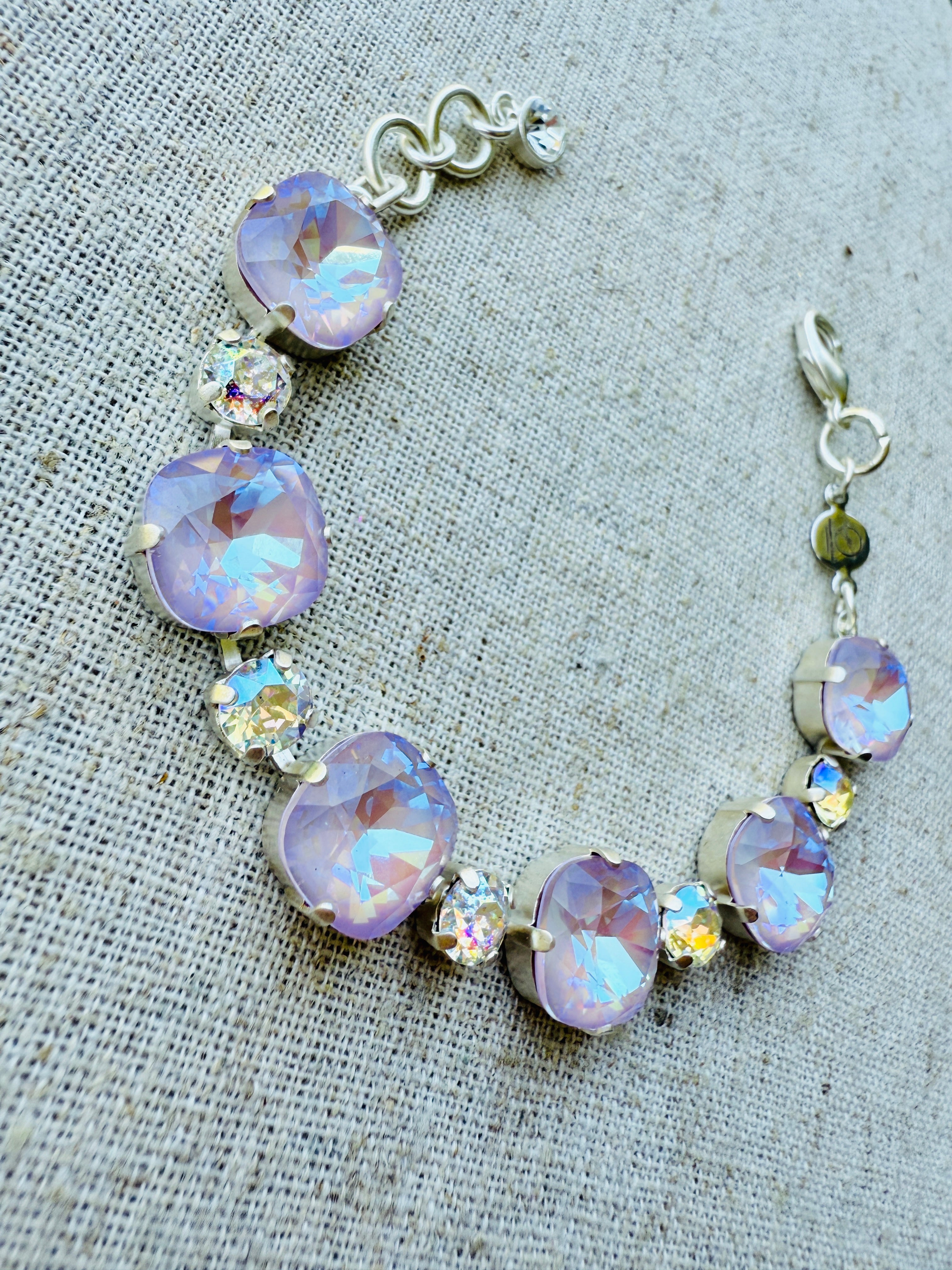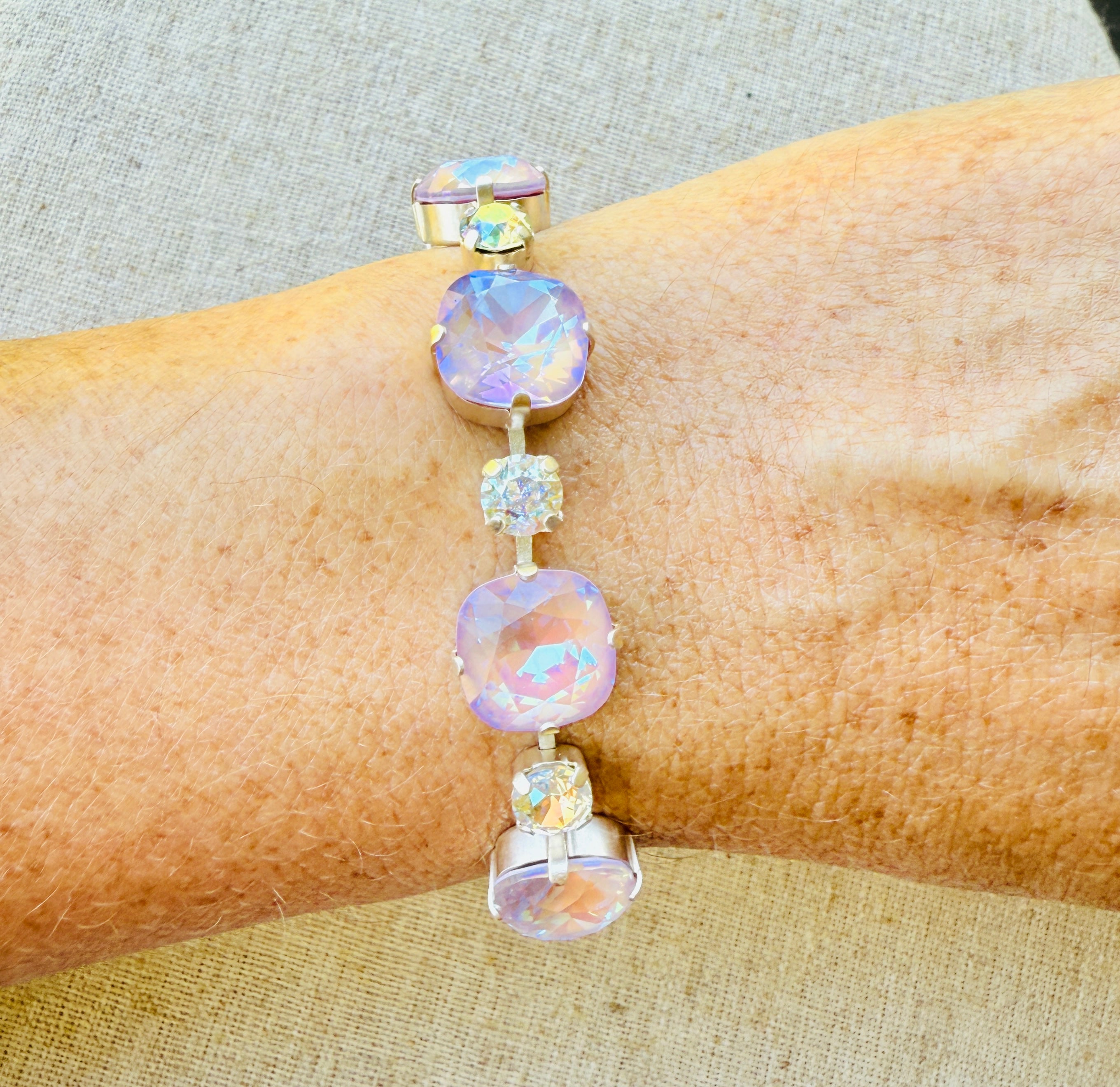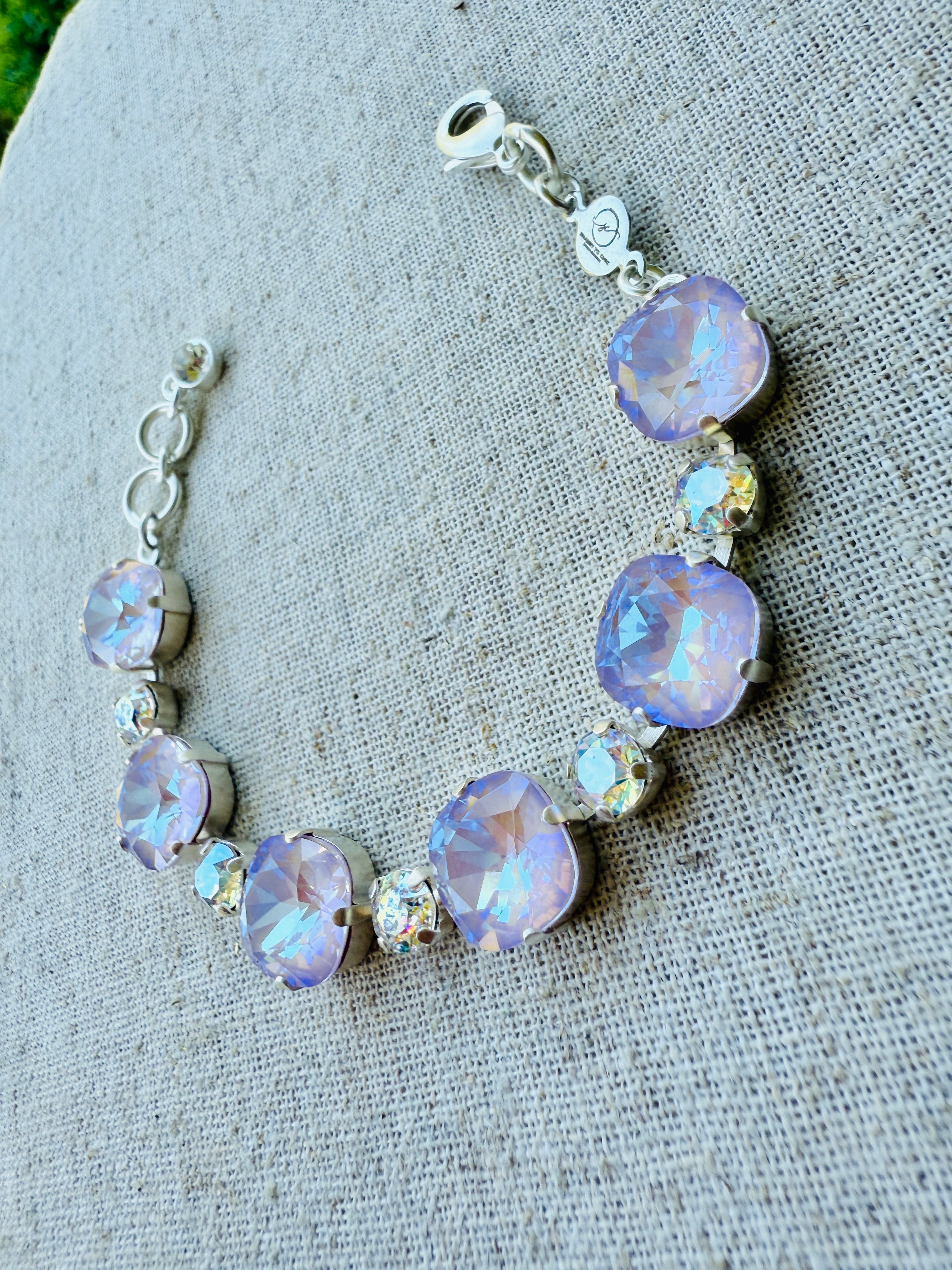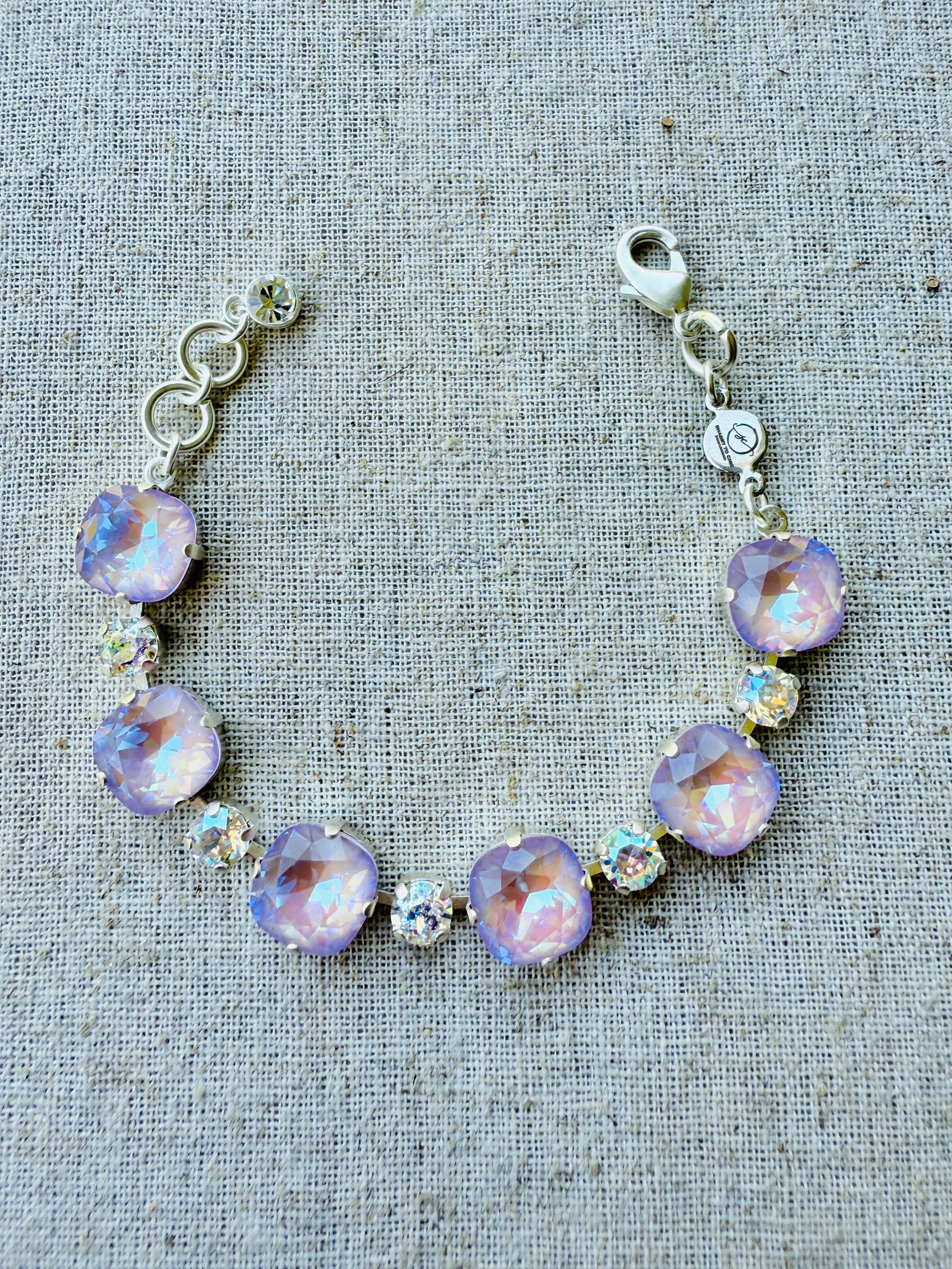 Indulge in the perfect dreamy lilac hue with this bracelet. Adorned with 6mm round crystals, nestled between 12mm soft square crystals, and set in a mesmerizing matte silver. Complete with an adjustable extender chain, logo disc, and a secure lobster clasp. Each bracelet is carefully crafted to fit sizes 7" to 7.5", unless stated otherwise.