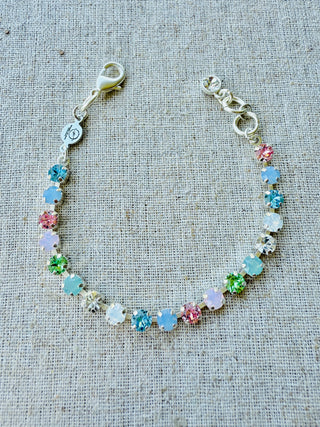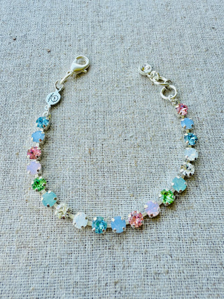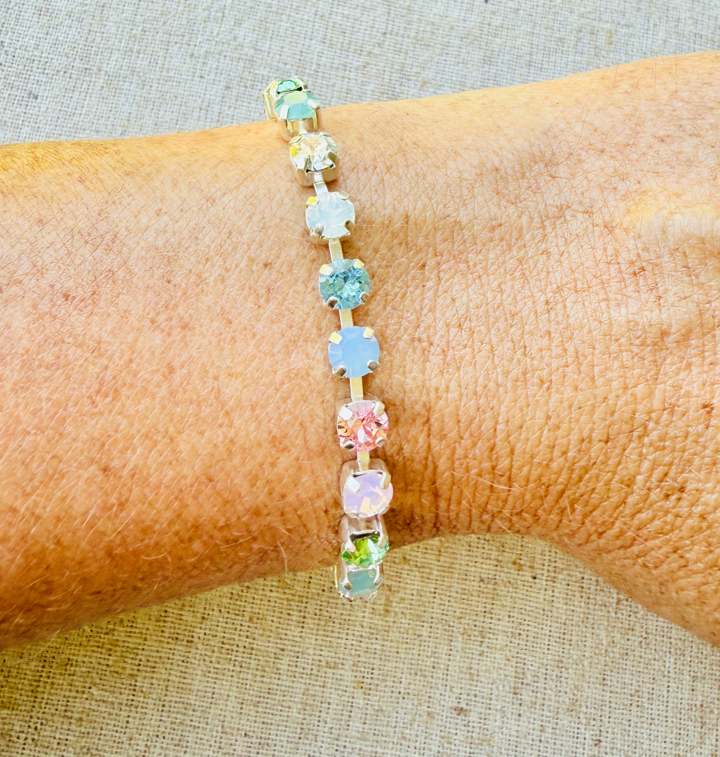 The perfect marriage of the softest colors all together in one bracelet. Matte Silver crystal tennis bracelet embodies a minimalist style while maximizing shine with 19 (5mm) high quality crystals precisely aligned for optimal sparkle. Features varying neutral hues of blues, pinks, yellows, and greens. Lobster claw clasp, a logo disc, a crystal end charm, and adjustable sizing for a perfect fit.