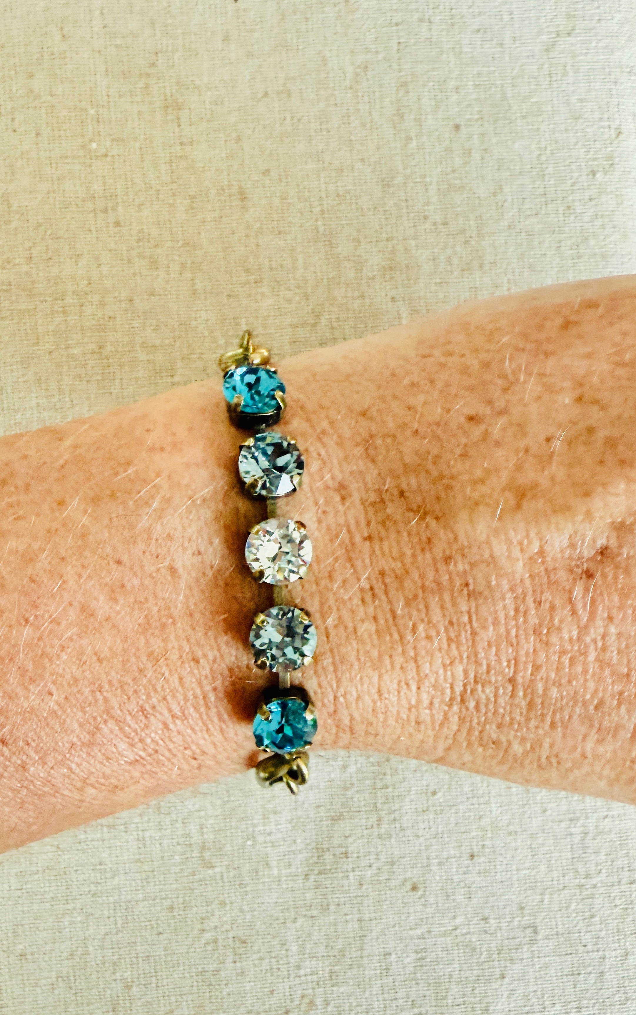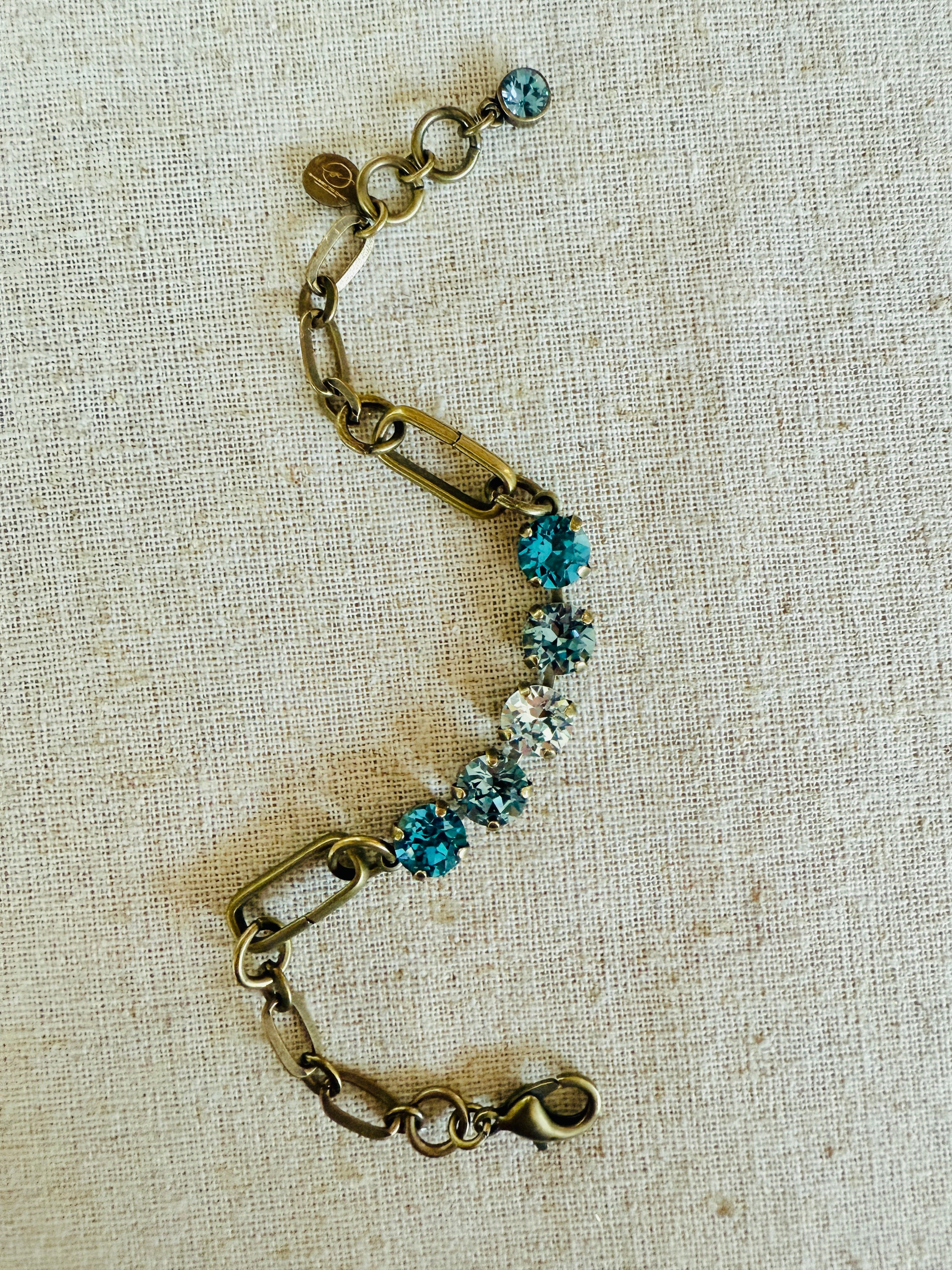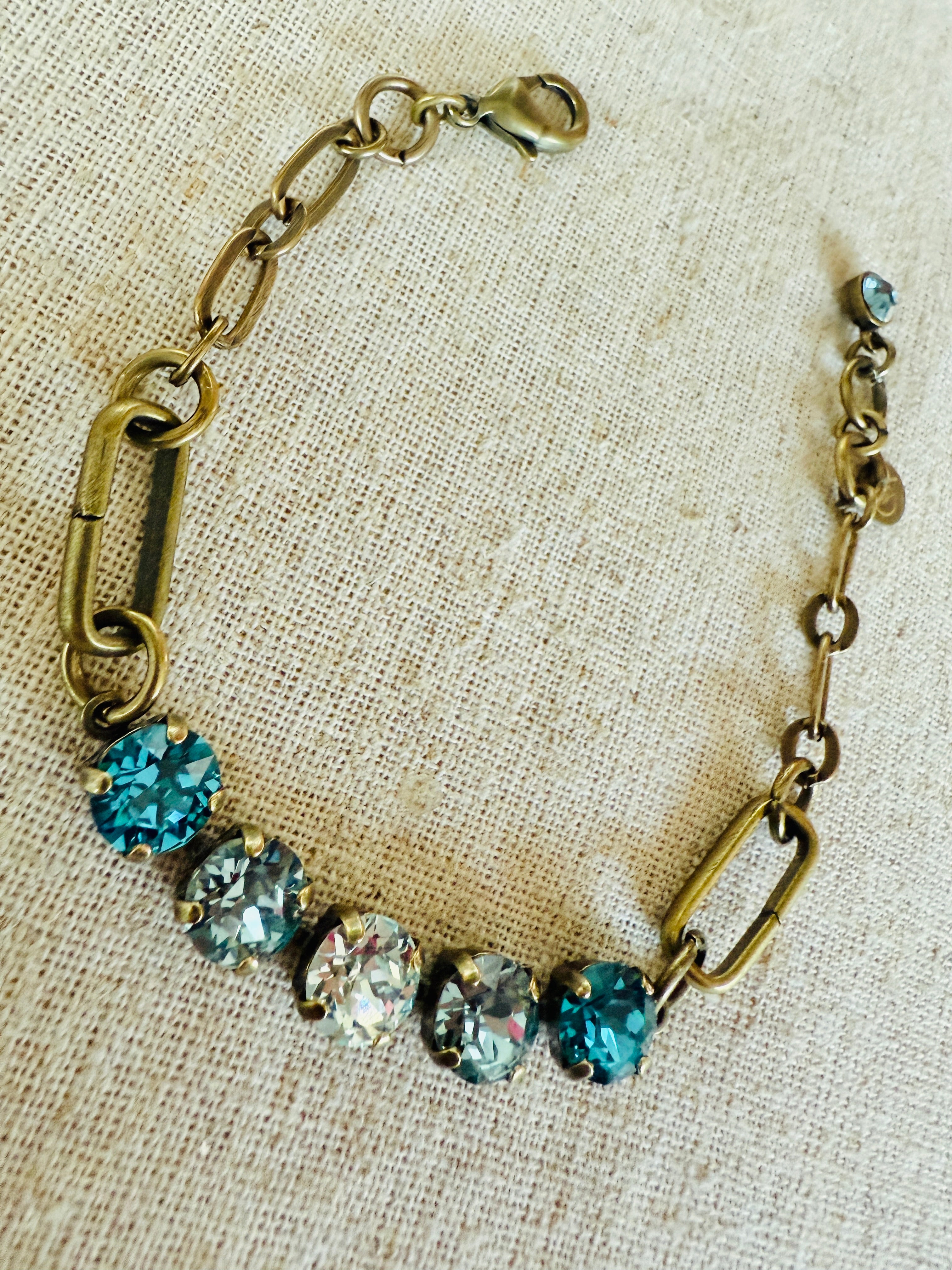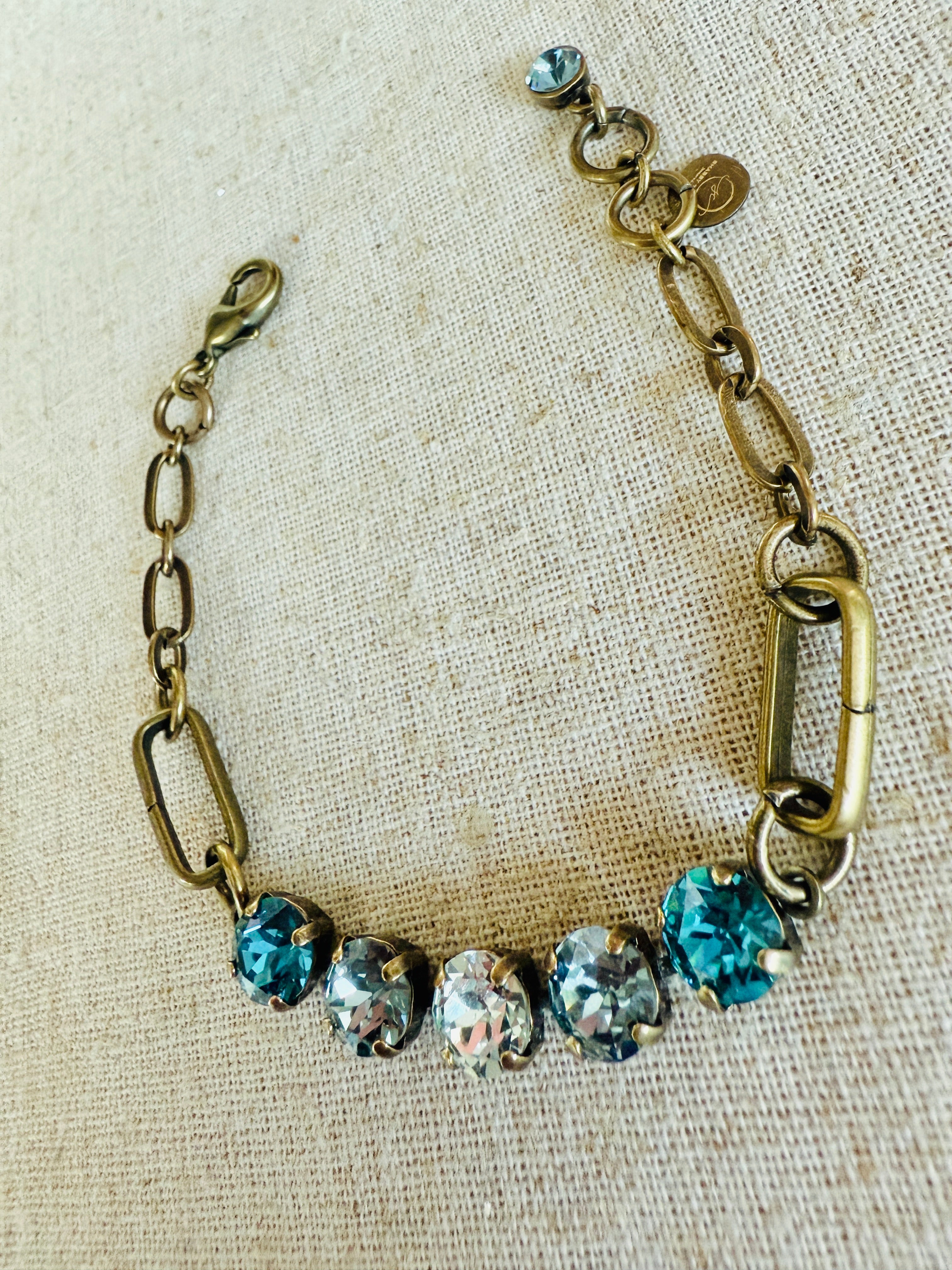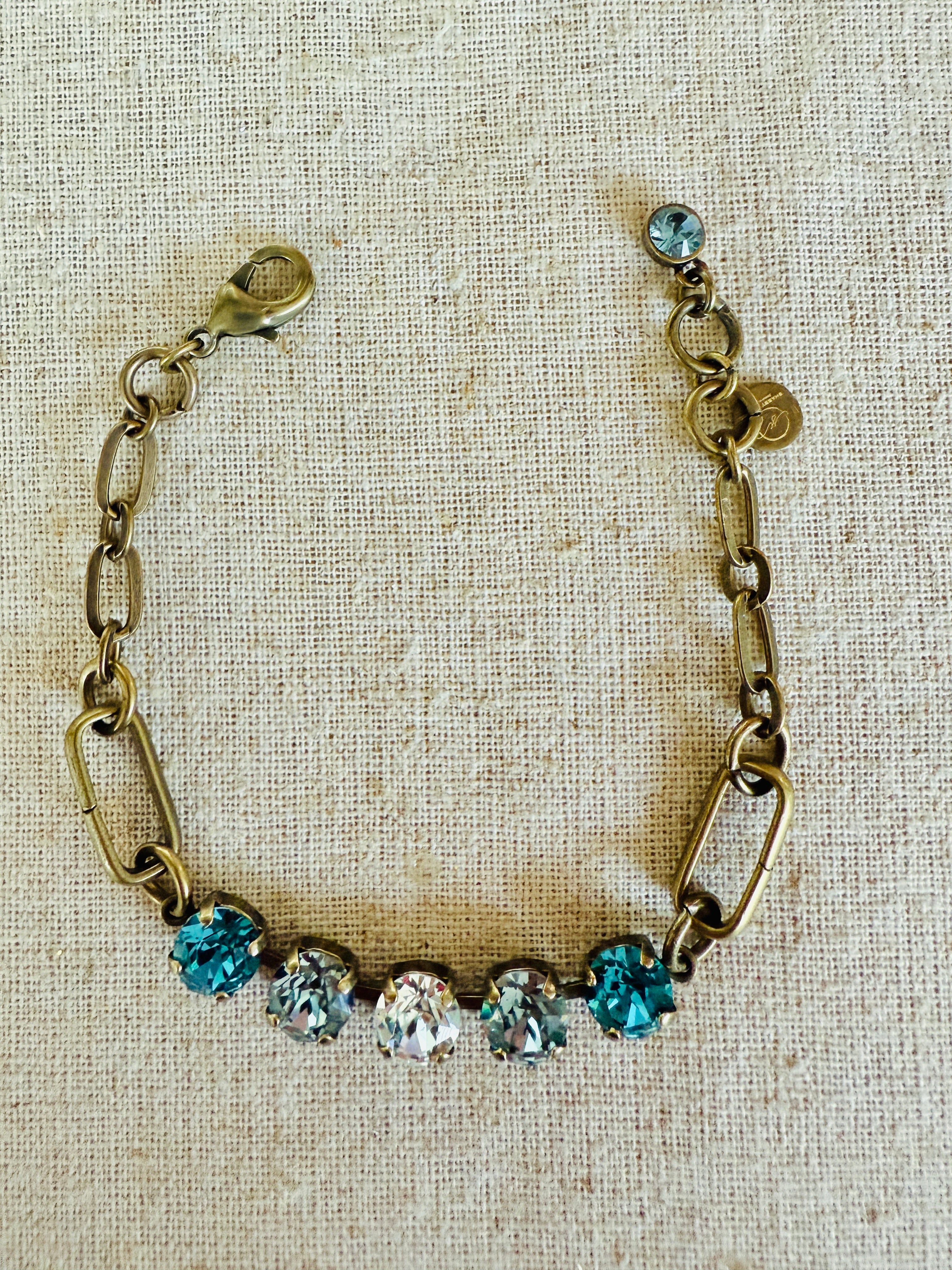 The perfect shades of dusky blues all aligned in one bracelet. Neutral enough to be your favorite piece of autumn themed jewelry. Lobster clasp closure, chain link detail, premium Australian crystals.