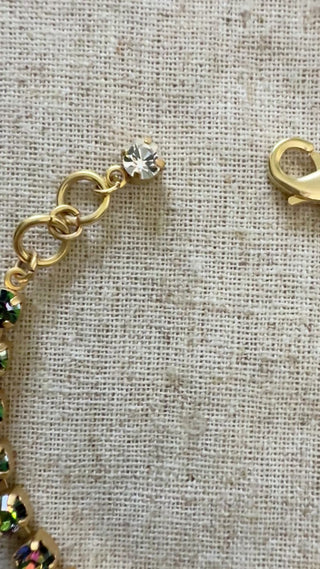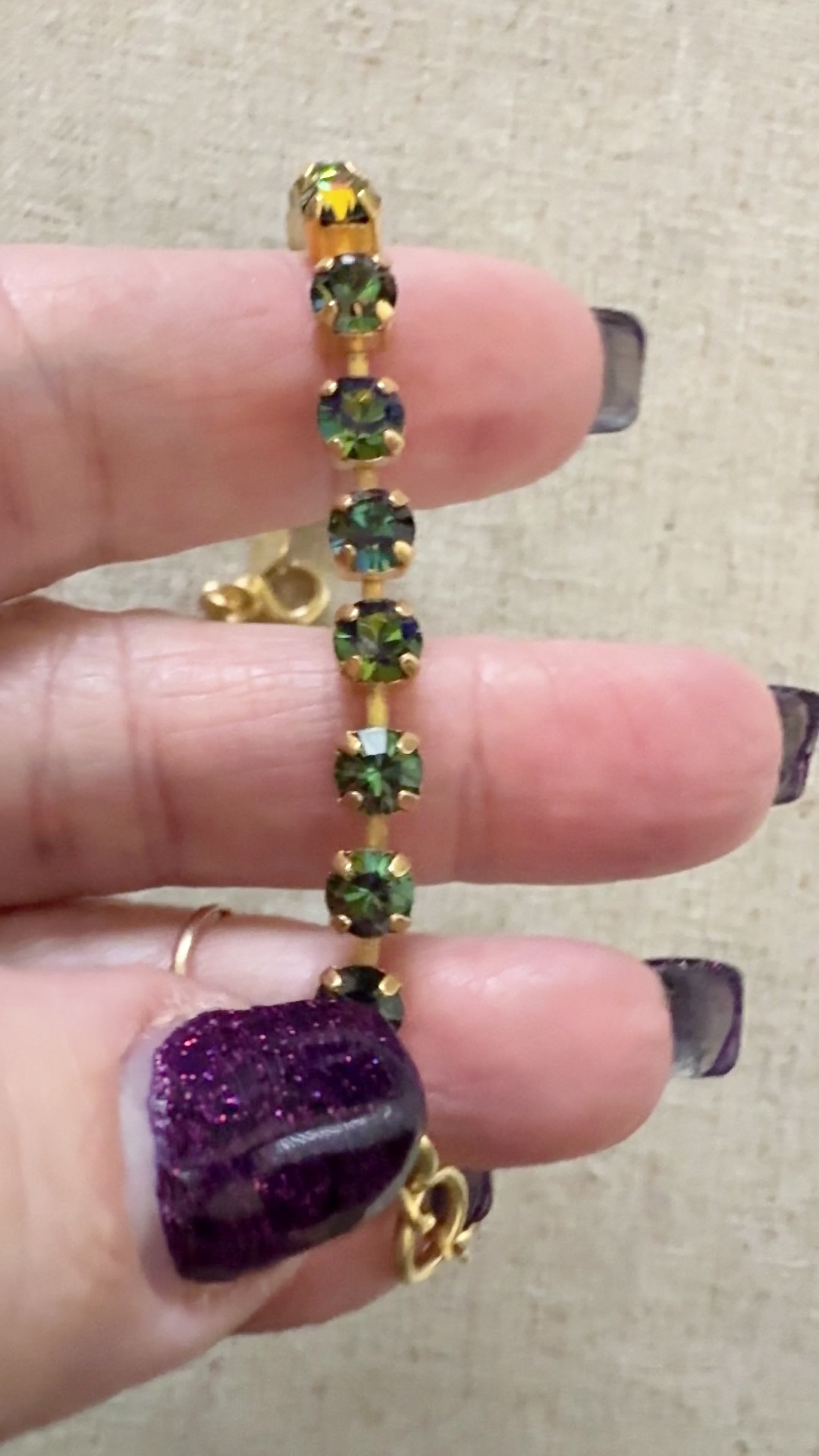 Eleanor: Bright and Shining, Just Like You! This crystal bracelet boasts a stunning color shift, revealing flashes of greens, purples, blues, and amber. It also includes an extender chain, lobster clasp, logo disc, and end charm for a customizable fit between 7"-8". Want a unique size?