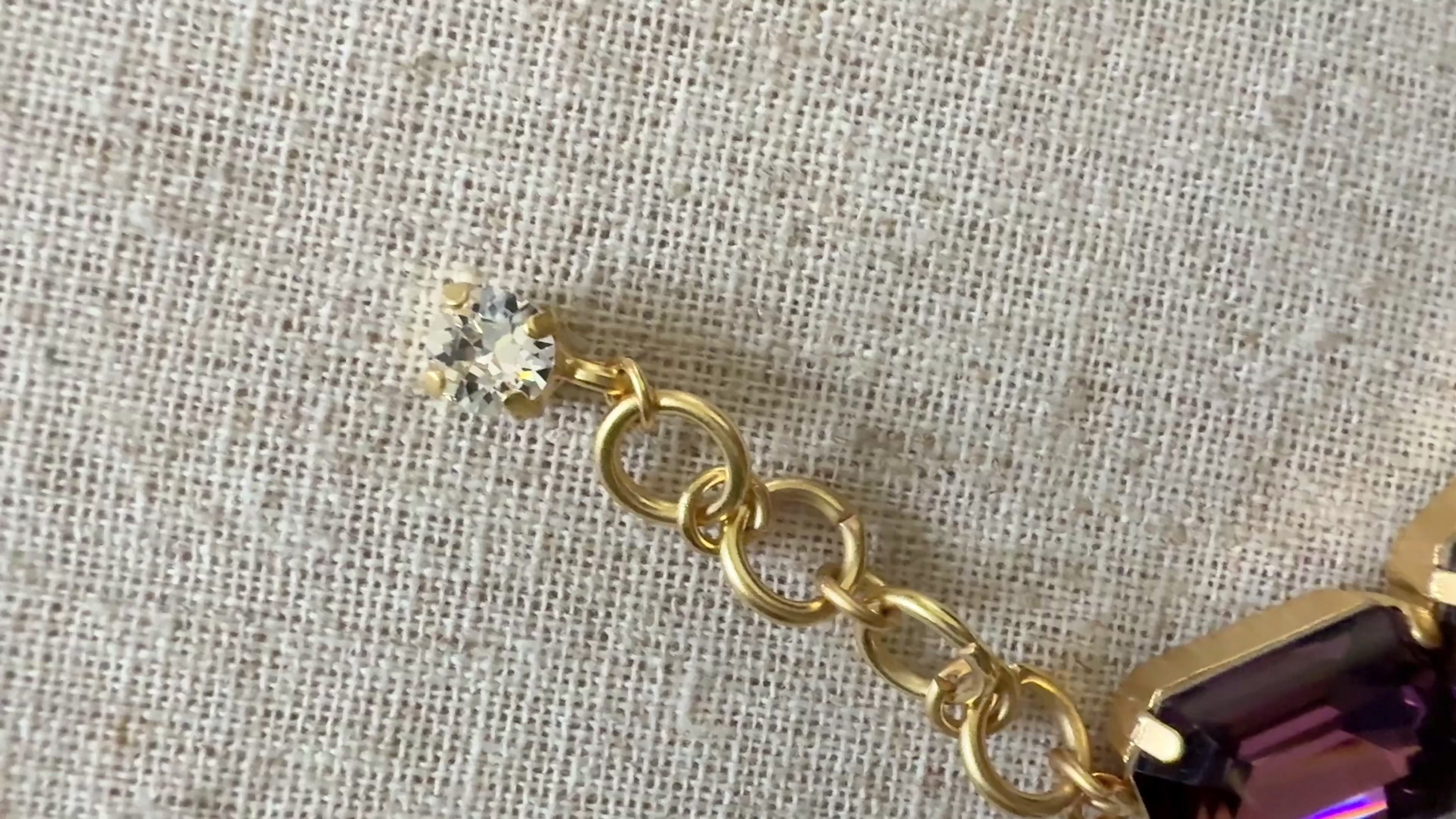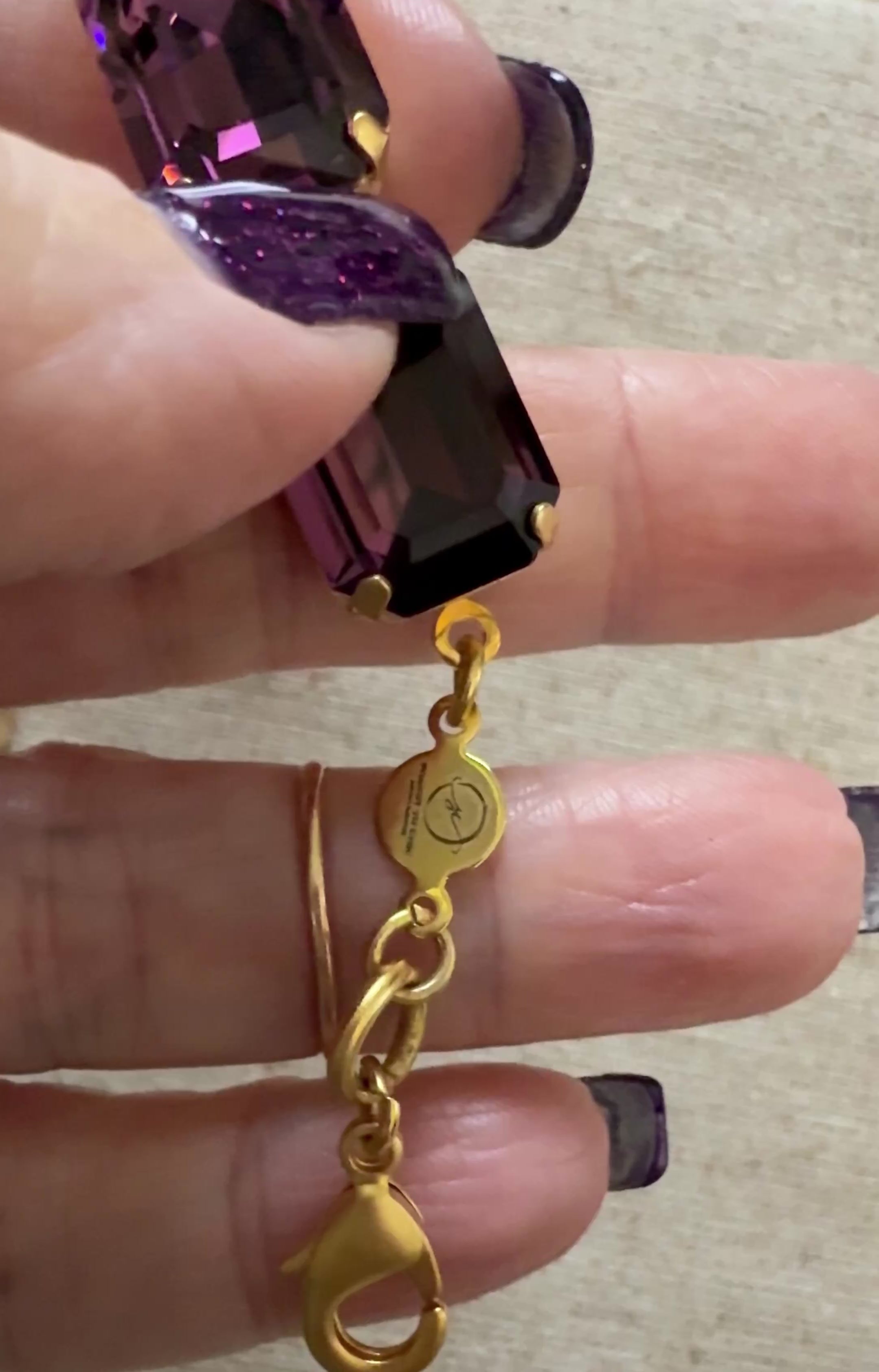 Elizabeth offers a romantic touch of purple with her octagon-shaped crystals. These faceted gems are placed in a luxurious matte gold setting.