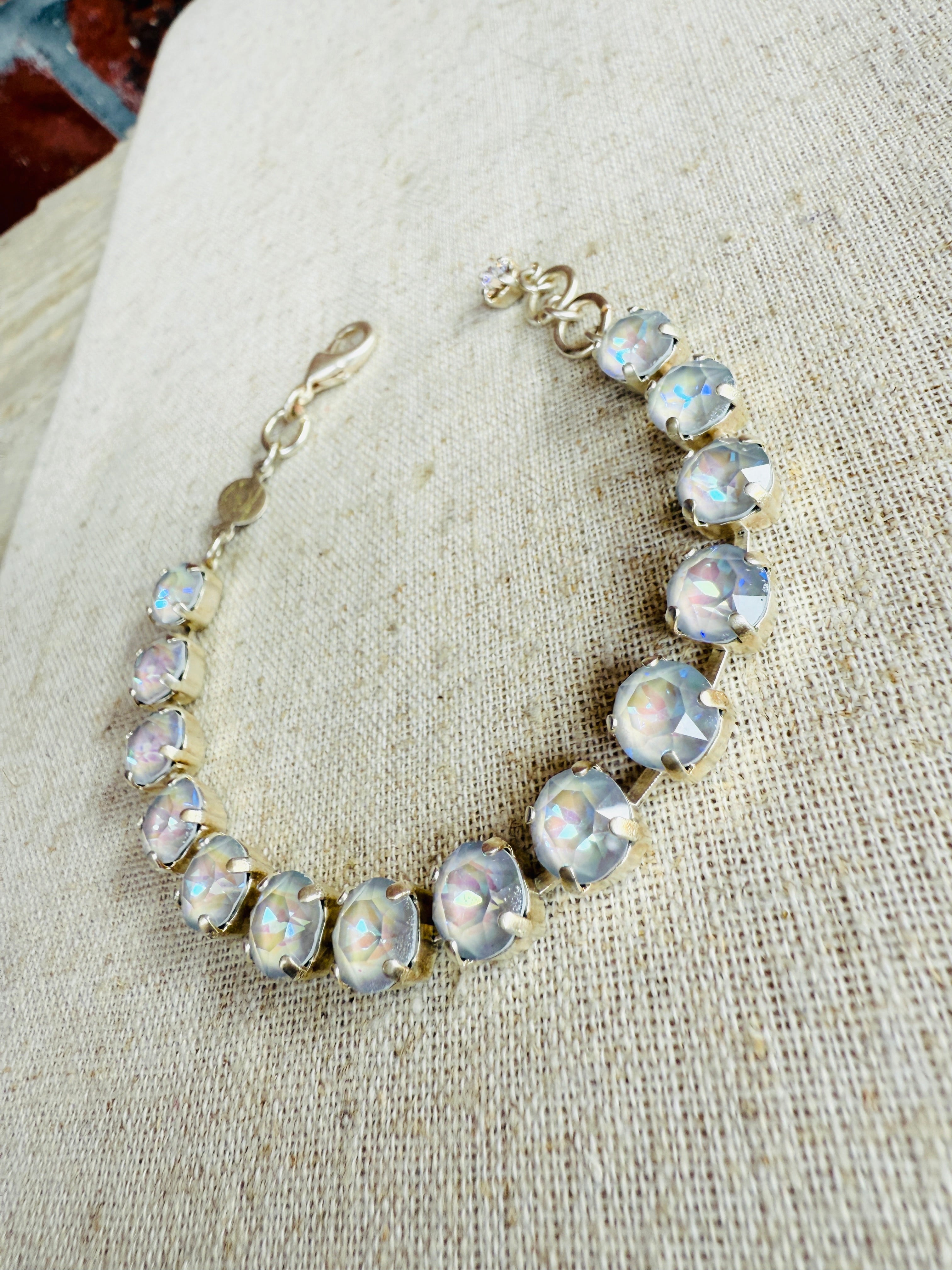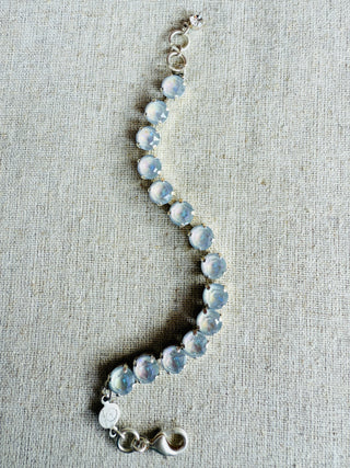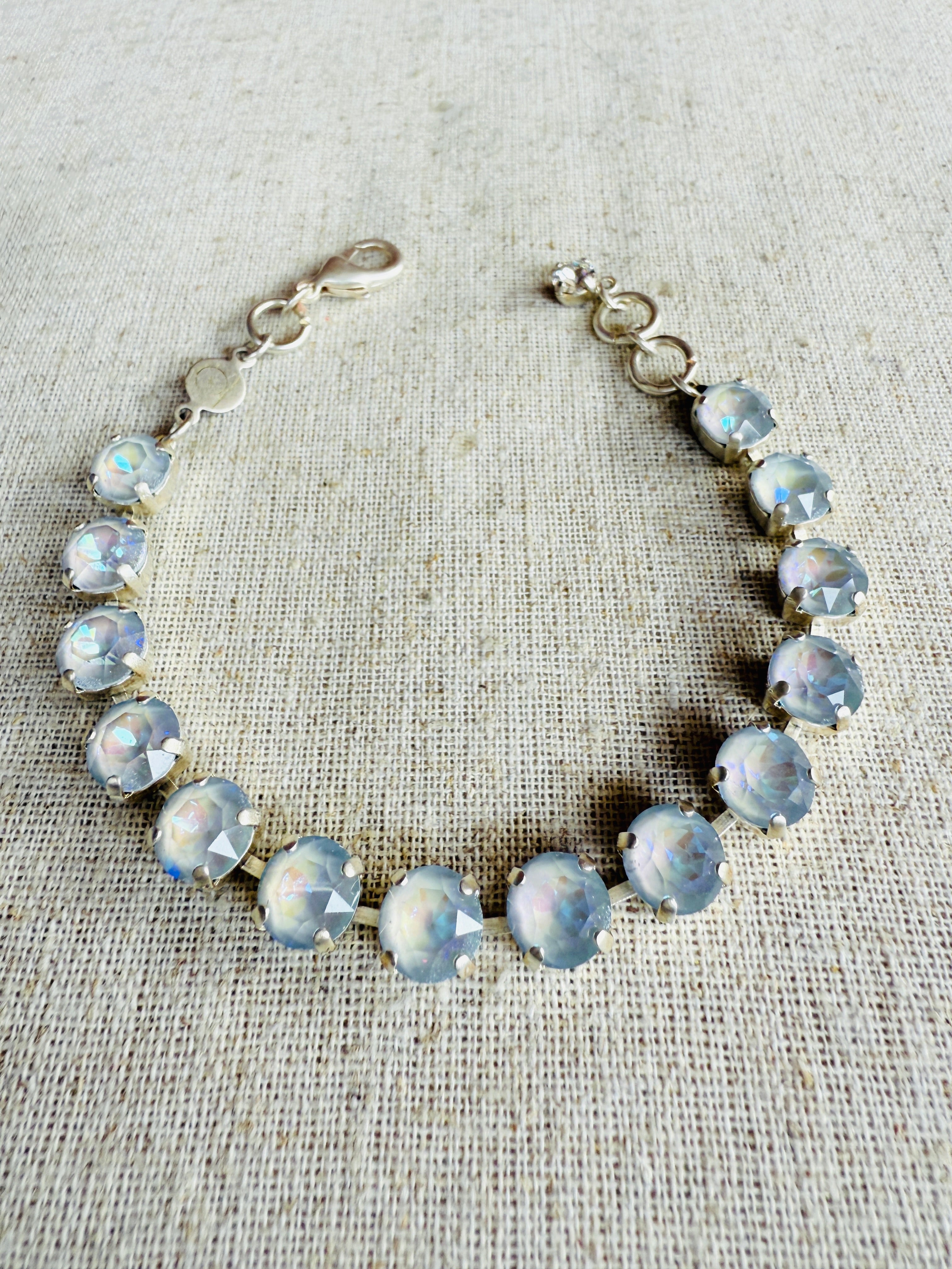 This shade of gray is illuminated with a dazzling iridescent sparkle, showcasing only the highest quality of crystals. The bracelet features a stunning matte silver finish and can be adjusted from 7 inches to 7.5 inches. Complete with an extender chain, logo disc, lobster clasp claw, and end charm.