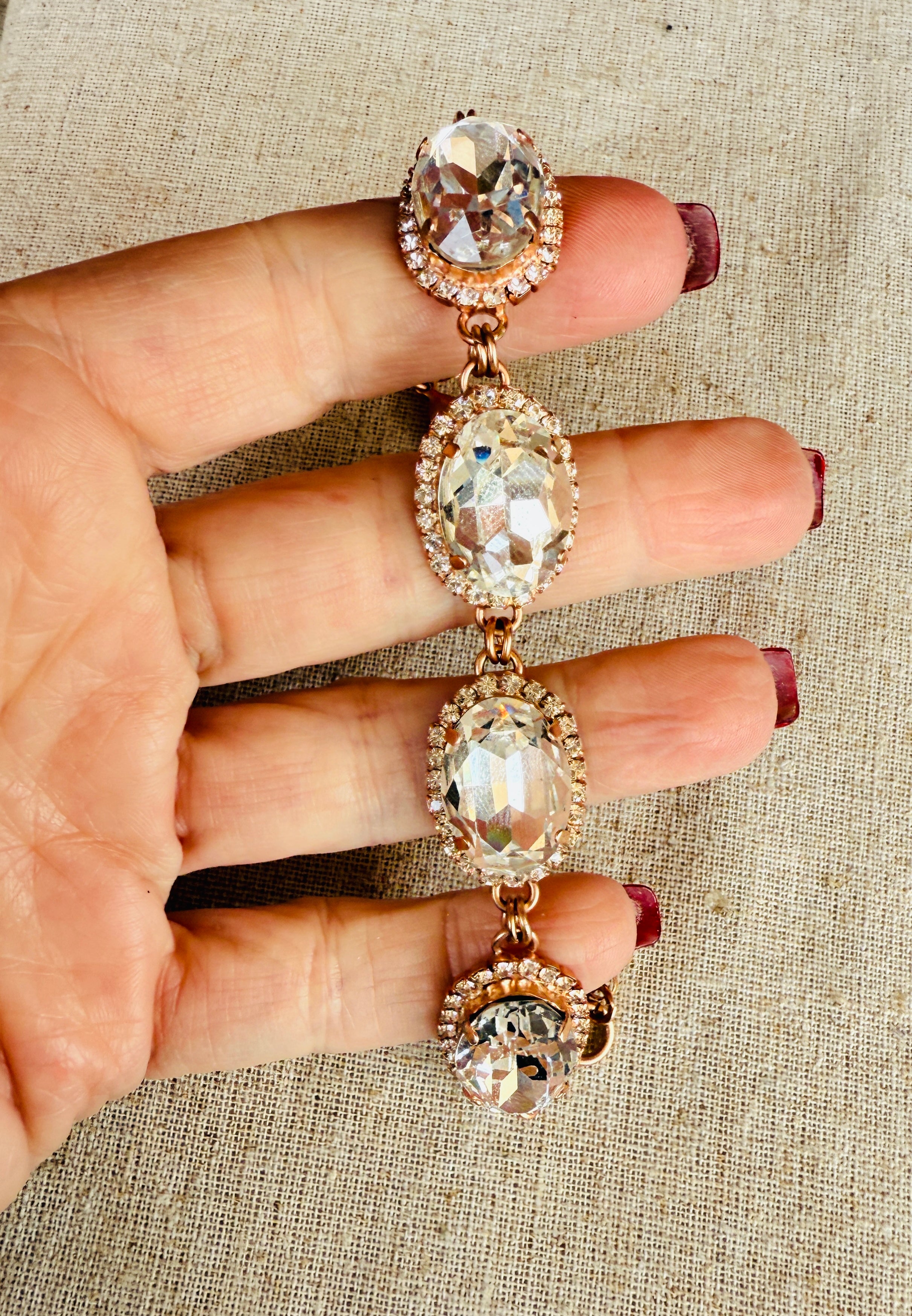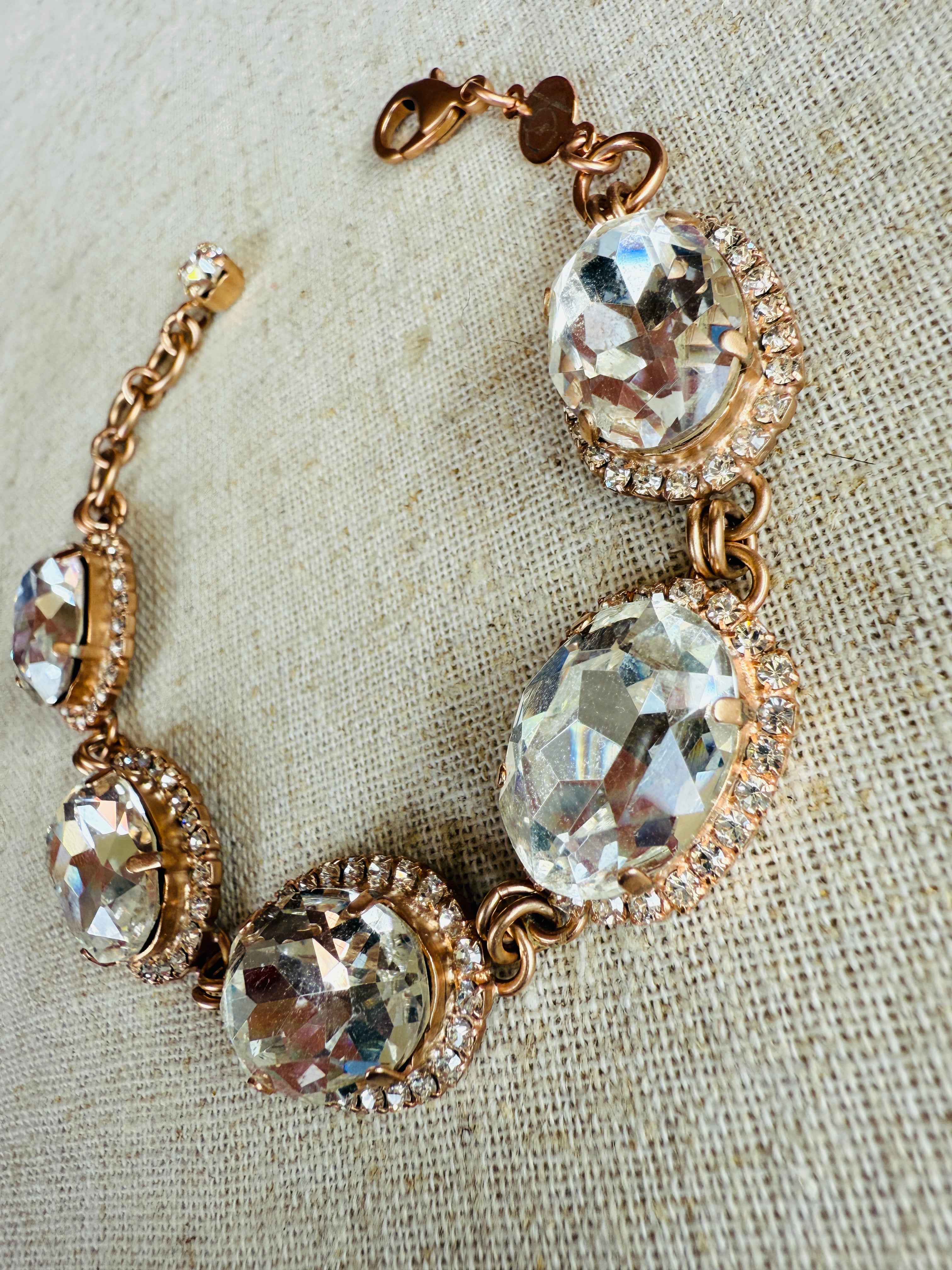 This Karina Rose Gold link bracelet features clear Australian crystals set in a matte rose gold design, accented by a halo of pave style crystals. It has adjustable sizing, a lobster claw clasp, and an extender chain with a crystal end charm. Guaranteed to give you runway-worthy vibes!