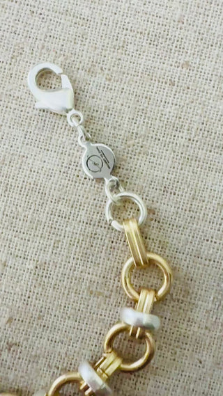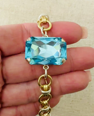 Introducing Leah - This light blue rectangle cut crystal bracelet features a mix of gold and silver finishes, a lobster clasp closure, and a charming chain detail with an end charm and logo disc. Adjustable sizing for the perfect fit. Get ready to show off your unique style with Leah!
