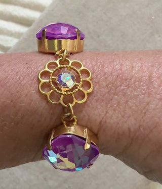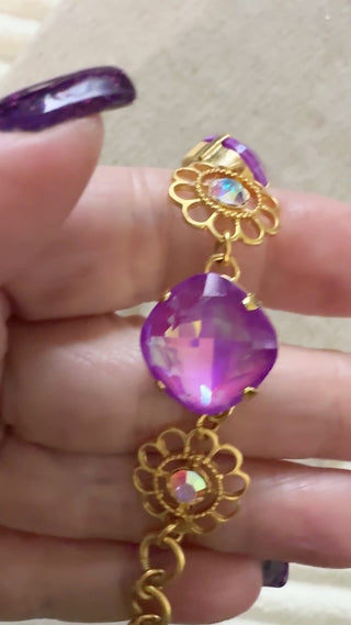 It's a beautiful, luxurious addition to any outfit. Made from orchid colored crystals, this bracelet features carefully-crafted flower spacers to add a delicate touch. And with an adjustable extender chain and lobster clasp, you can ensure a perfect fit every time. The gorgeous logo disc and end charm complete the look, giving you a stunning piece of jewelry that's sure to become a favorite. And with our satisfaction guarantee, you can feel confident in your purchase or return it for a hassle-free experience.