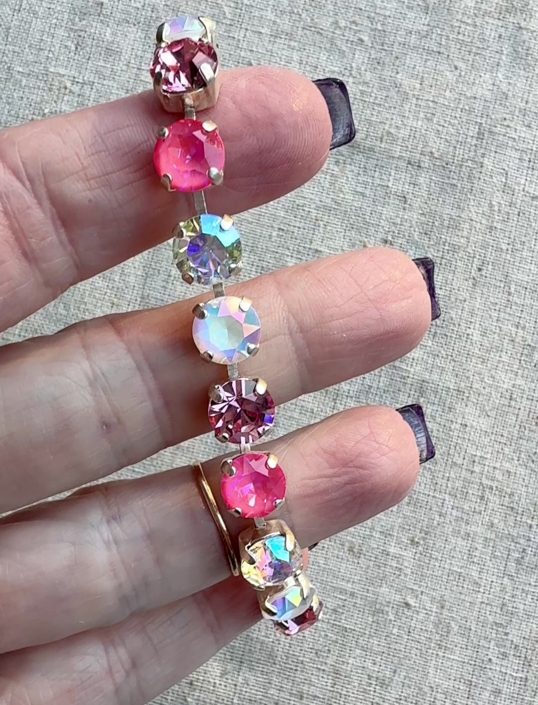 Maddie is the perfectly paired bracelet for your summer wardrobe. Pink, Alabaster, and Iridescent. The setting is matte silver with a full extender chain, elegant crystal dangle charm, logo disc, and secure lobster clasp.