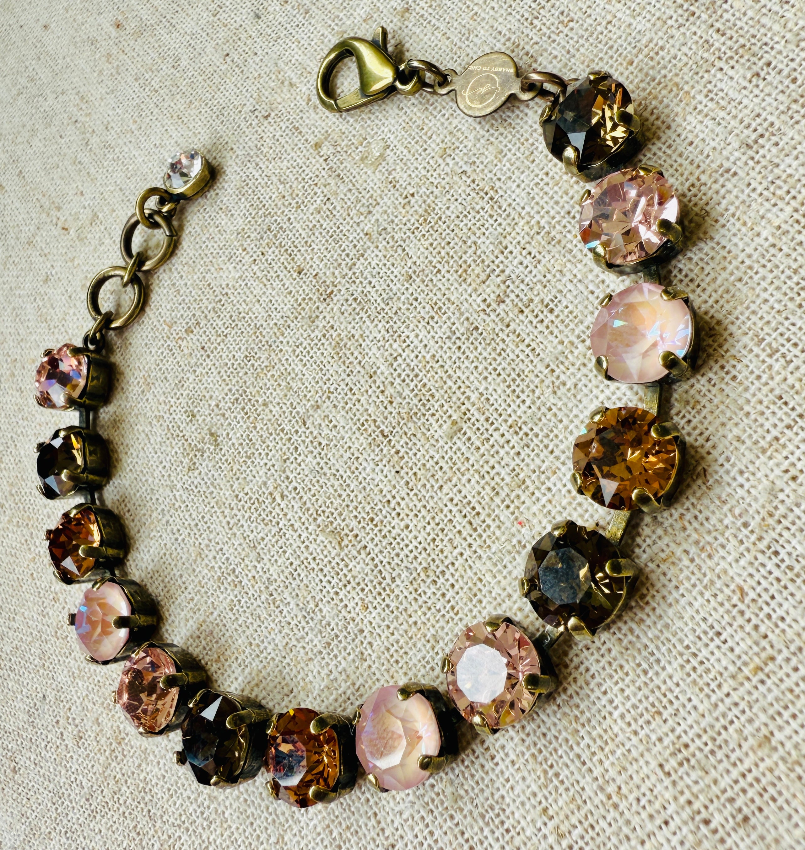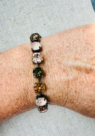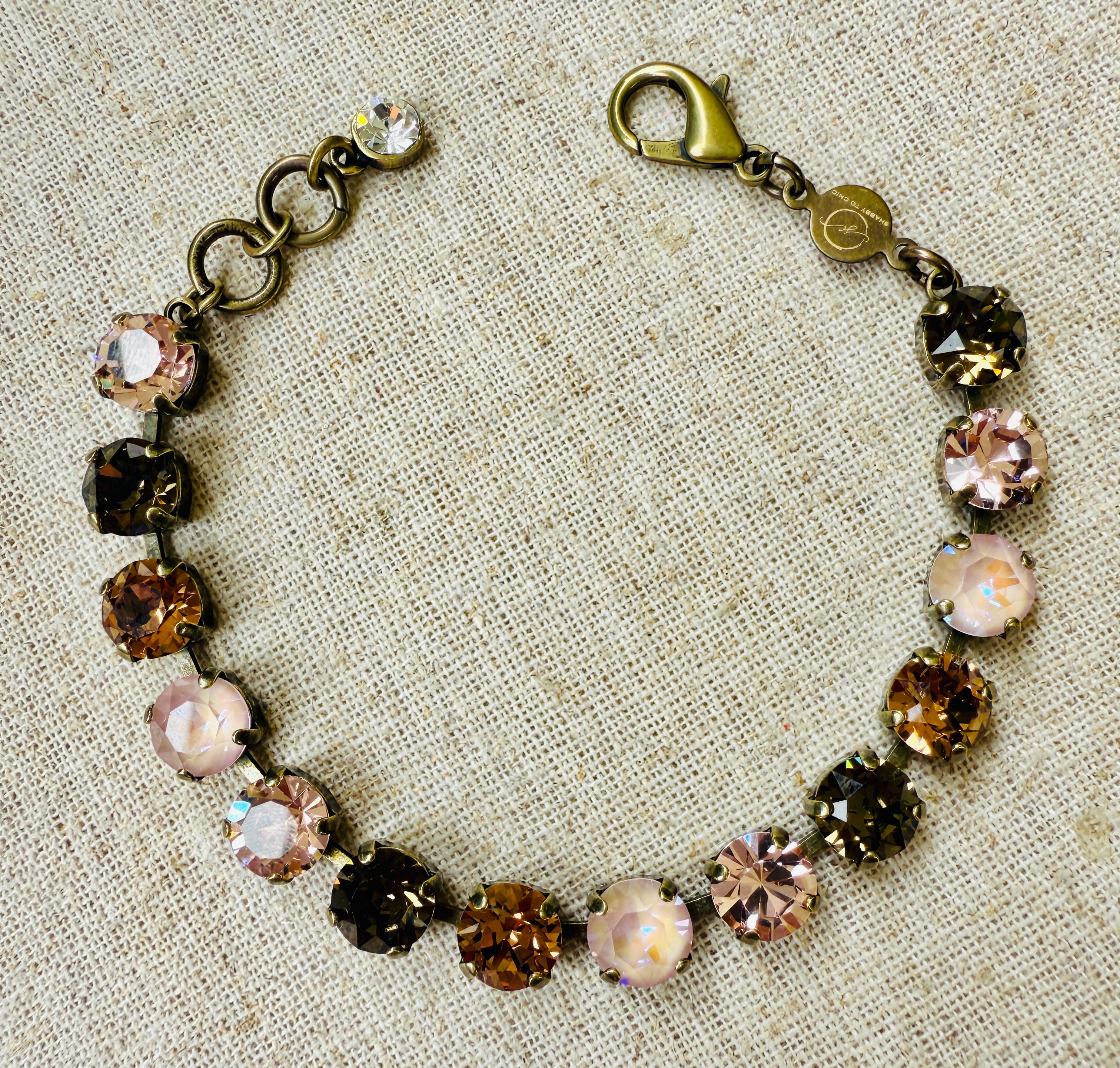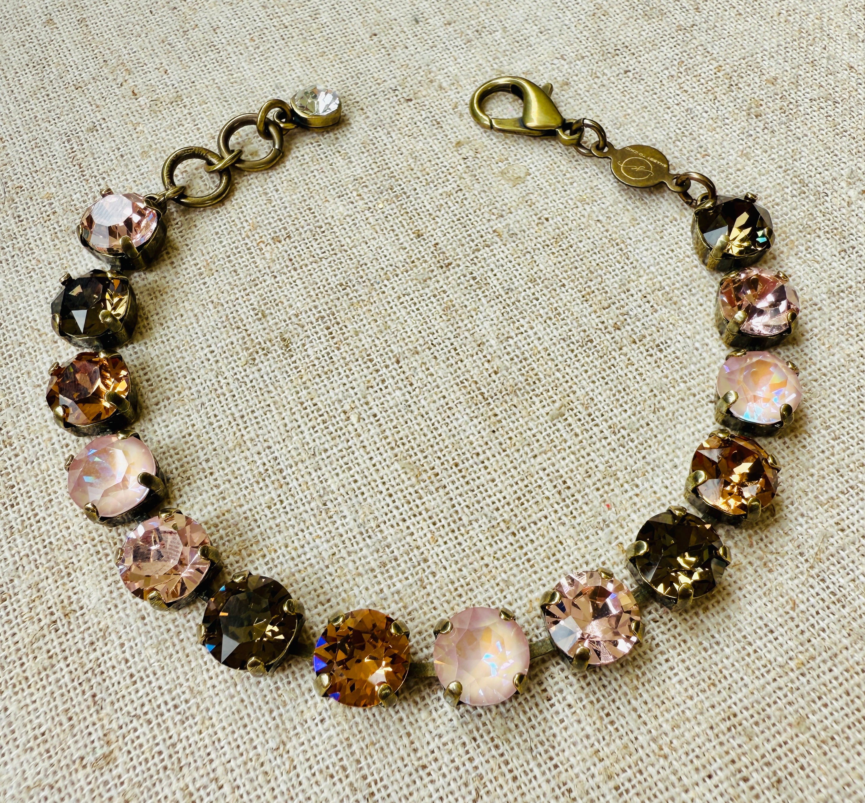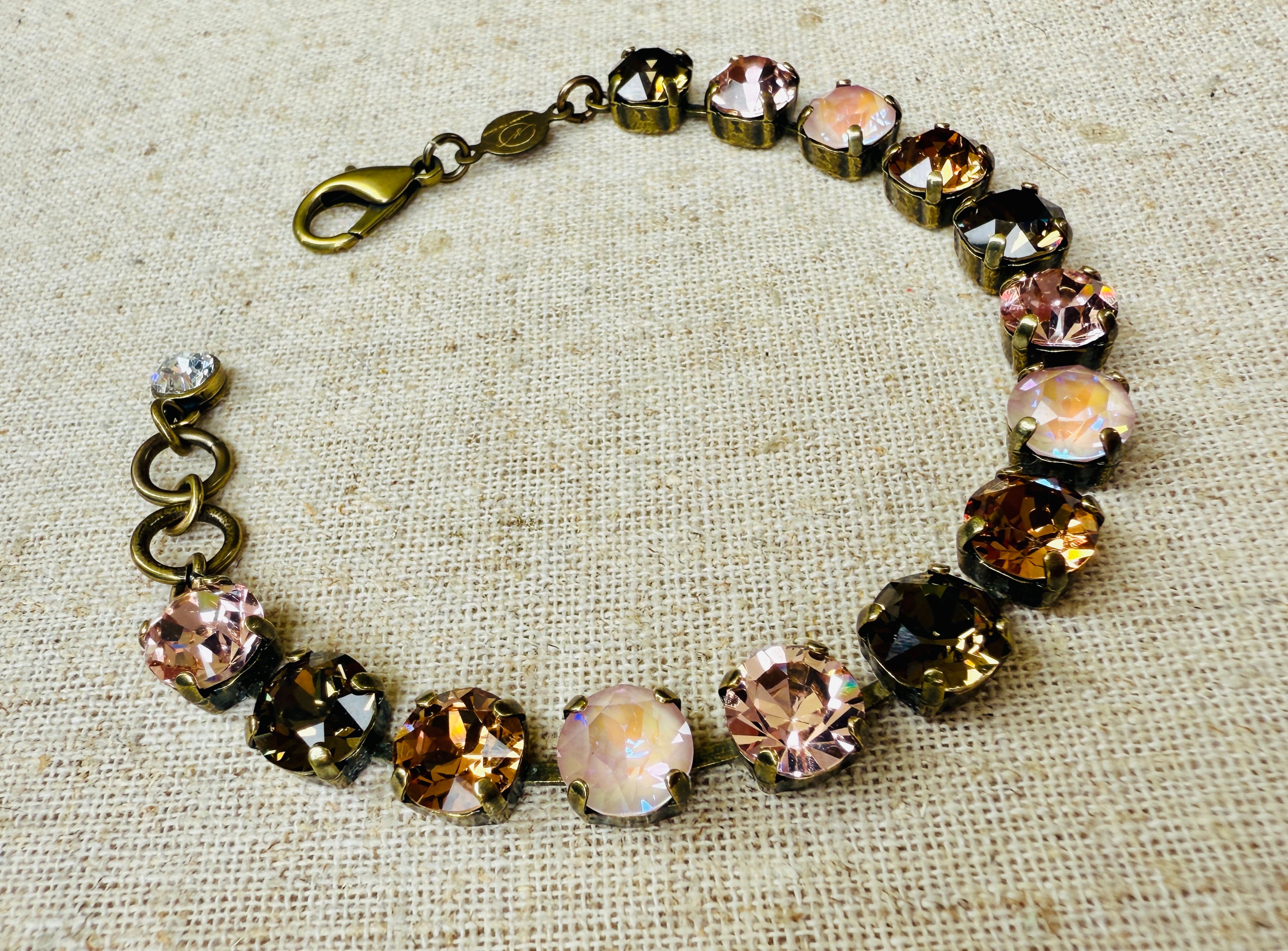Love fall colors? The muted hues in our Meadow crystal tennis bracelet features a beautiful mix of chocolate, warm amber golds, winter white, and light blush pinks in 8mm crystals. Australian crystals set in a antique gold finish. The lobster claw clasp and extender chain provide a secure and adjustable fit, while the crystal end charm adds a touch of extra sparkle. Adjustable from 7”-7.5”