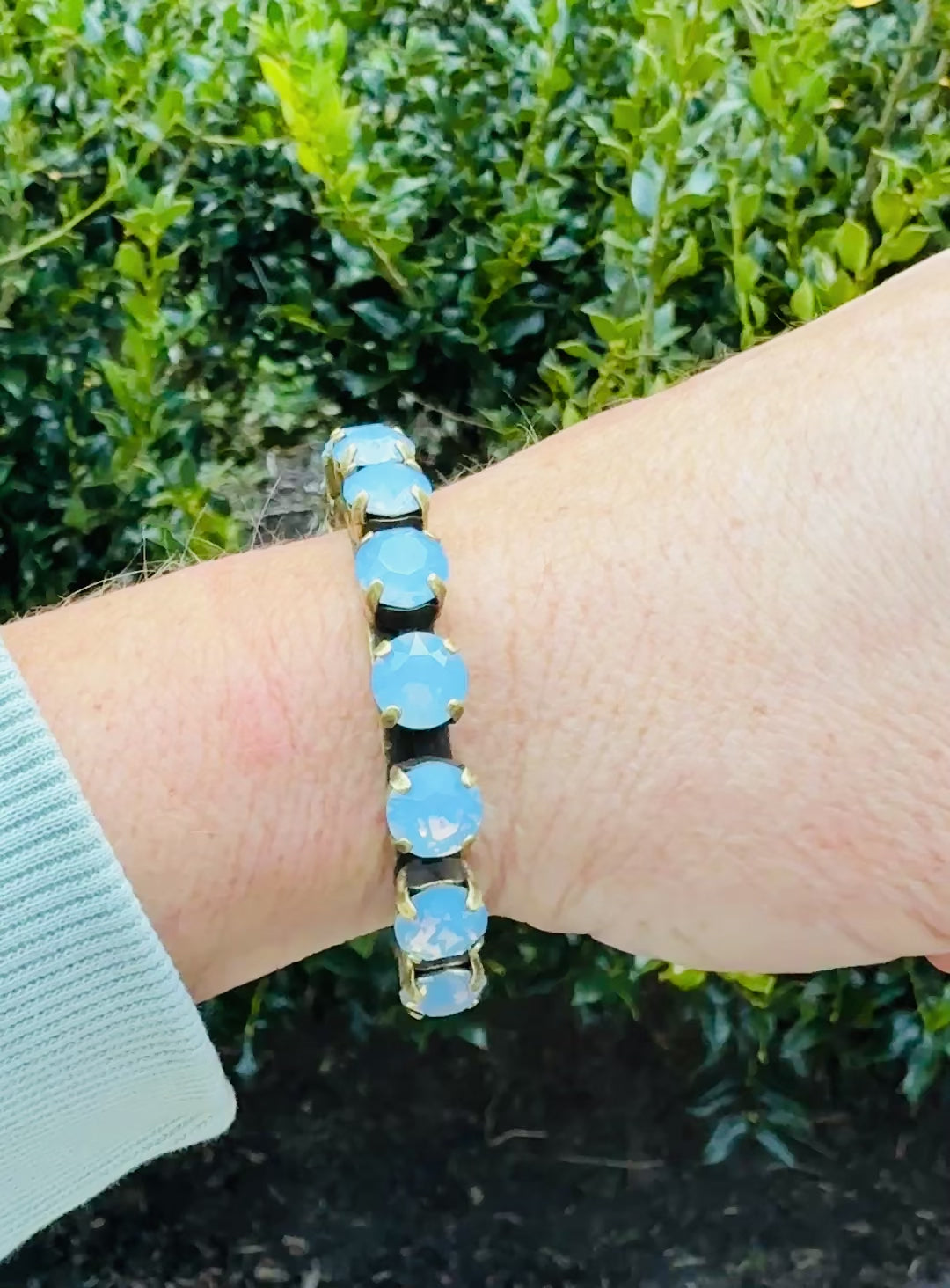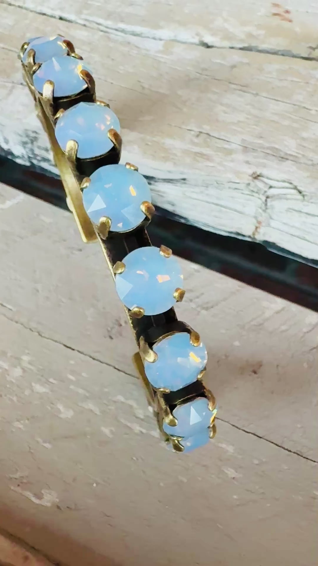 The Mia bracelet is a cuff style bracelet with a antique gold finish. Adorned with Blue opal crystals. Slightly adjustable by squeezing or pulling sides of bracelet. Easy on and off with no clasp to worry about.