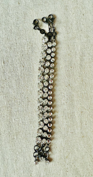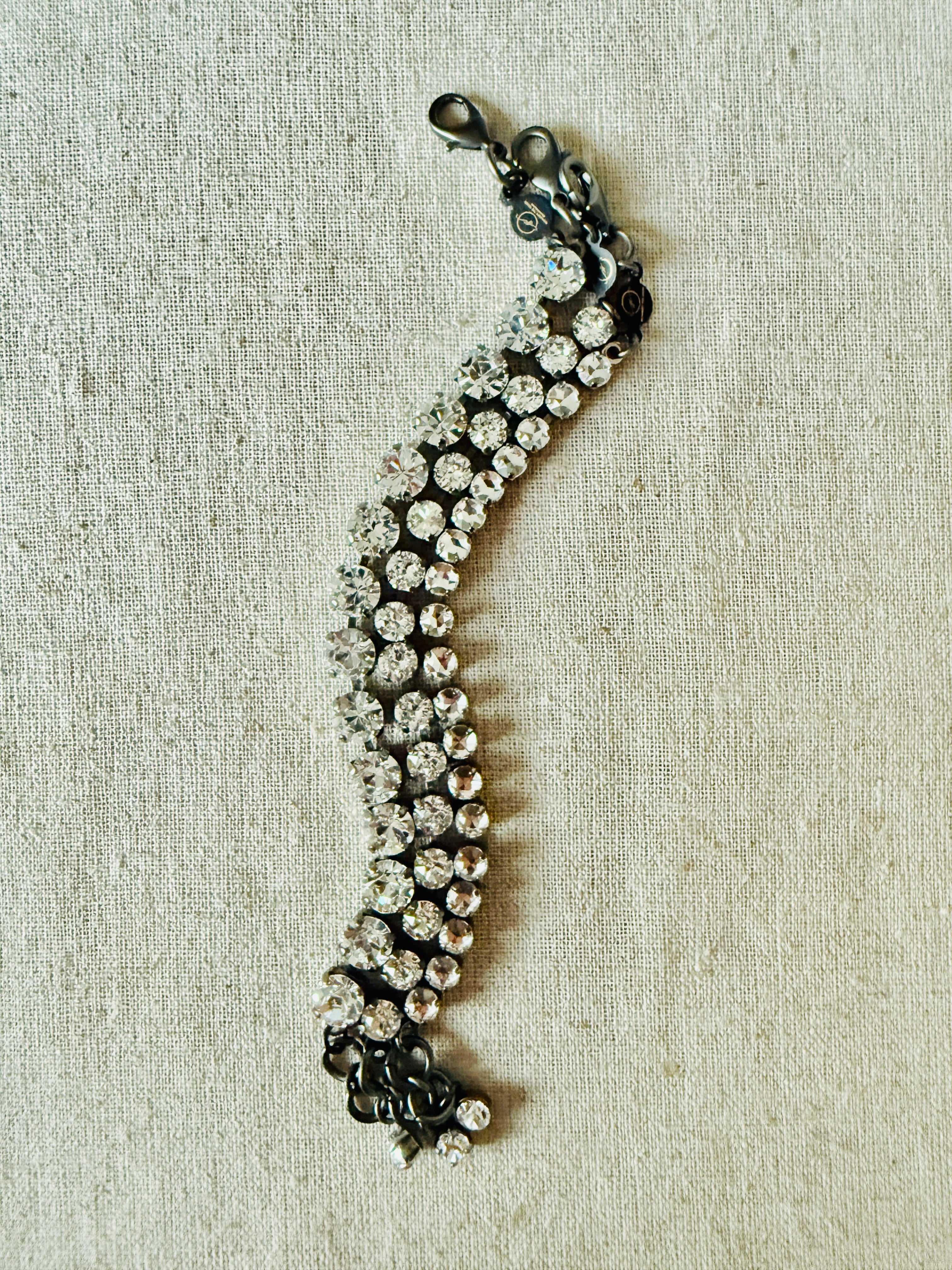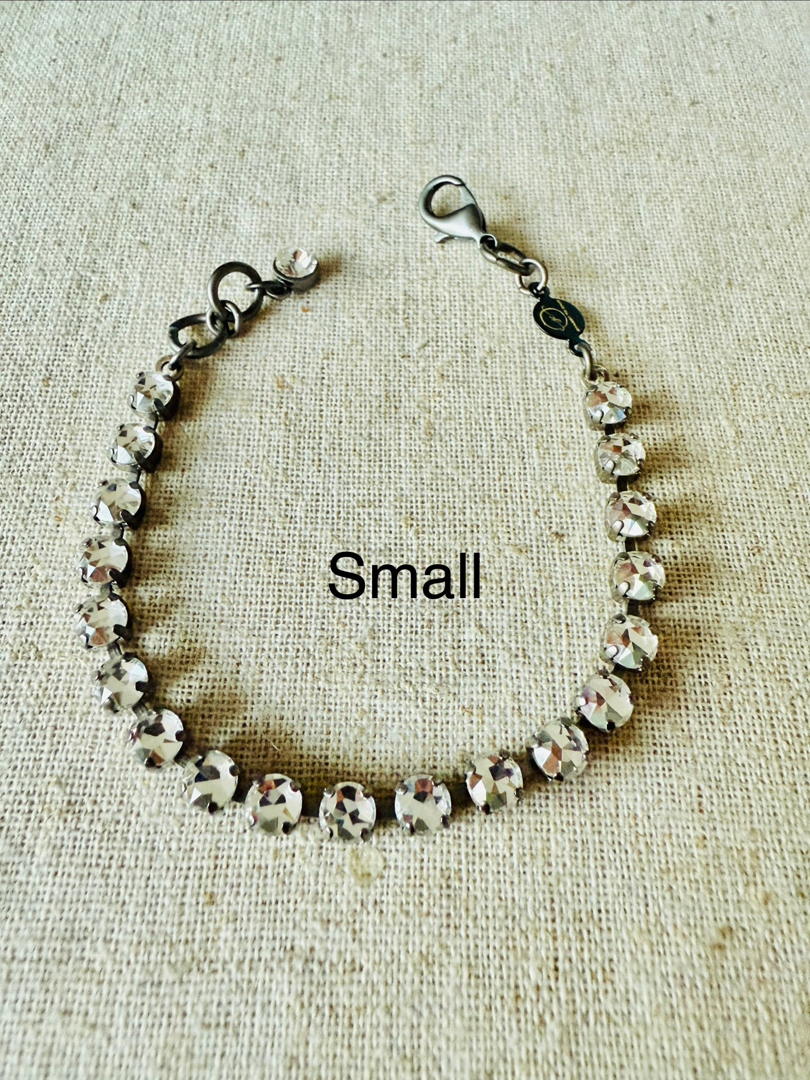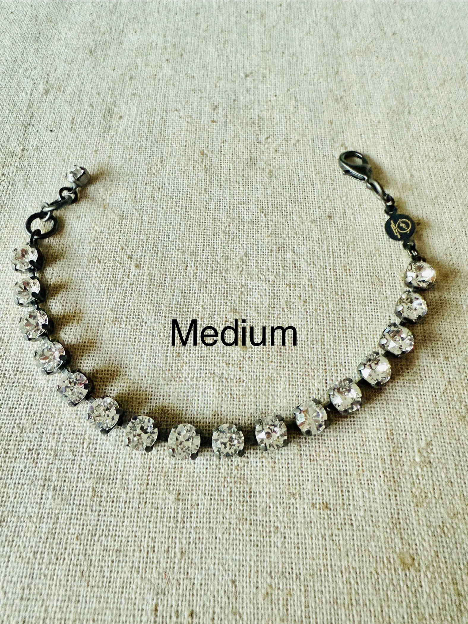 Raven crystal tennis bracelets have a dramatic flair with the deep contrast between the clear Australian crystals and the dark hematite finish of the setting. each bracelet is complete with a logo charm, crystal end charm, lobster claw clasp, and extender chain for perfect sizing.