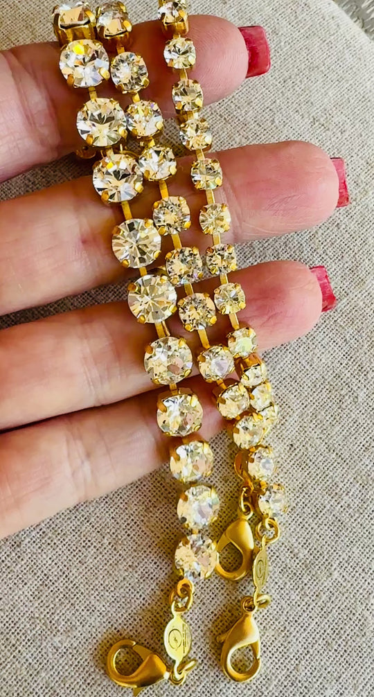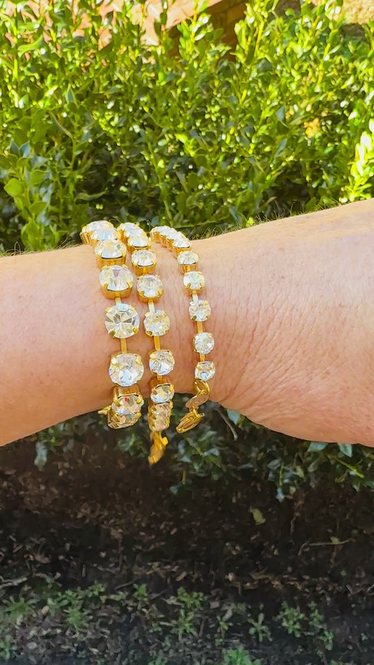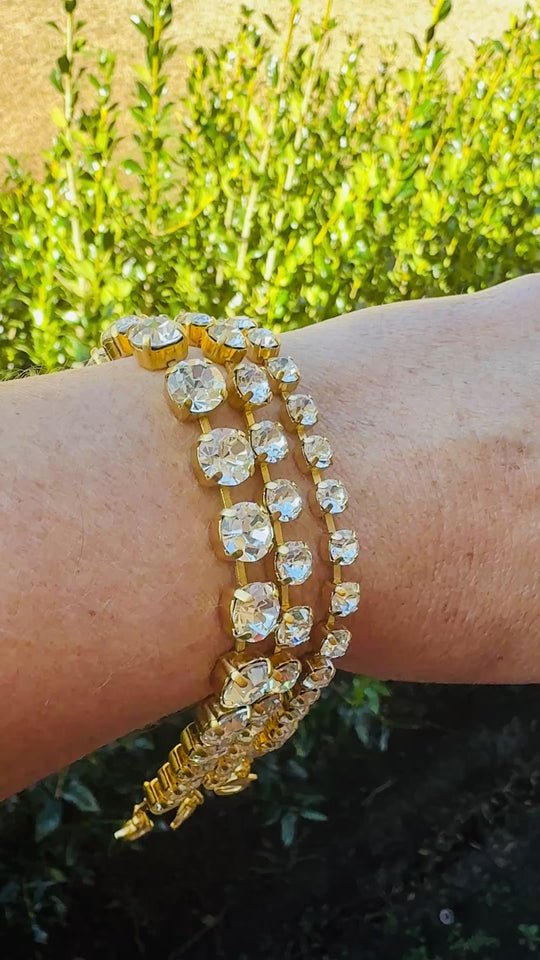 Crystal clear crystal perfectly aligned in a tennis bracelet that is fit for a queen! Set in the richest gold finish. This beauty is available in 3 different sizes (see pictures for reference) Complete with lobster...Regular price From $40.00 -
