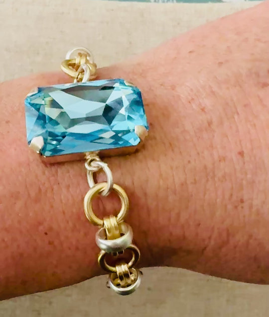 Introducing Leah - This light blue rectangle cut crystal bracelet features a mix of gold and silver finishes, a lobster clasp closure, and a charming chain detail with an end charm and logo disc. Adjustable sizing...Regular price $82.00 -