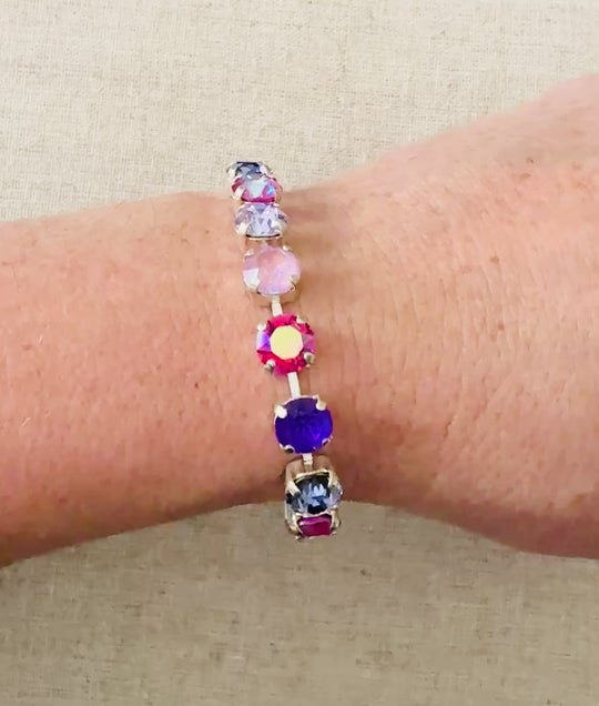 Experience the stunning beauty of Ellie, a crystal bracelet boasting a dazzling array of colors including fuchsia, periwinkle, and lilac. Finish: Matte Silver Crystals: Purple, Fuchsia, Lilac (8mm) Shape: Round Clasp: Lobster Claw Unless otherwise...Regular price $55.00 -