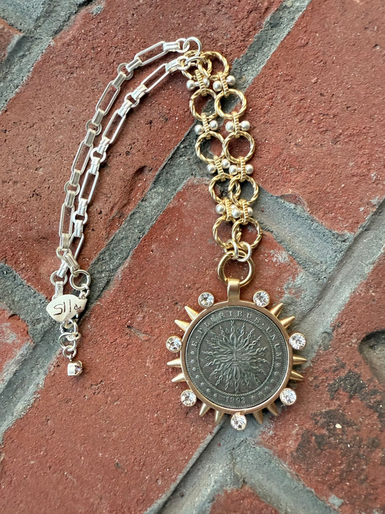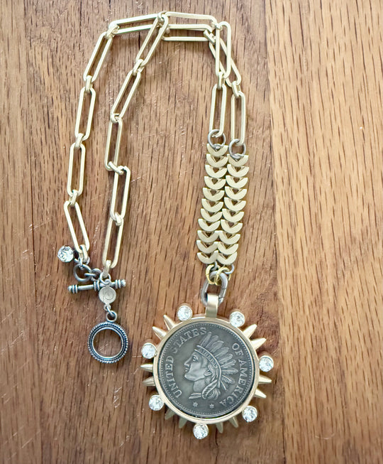 This stunning pendant necklace features mixed metal finishes and a native medallion coin replica in a luxurious matte gold finish. Coordinating chain has matte gold finishes. Sparkling clear crystals and delicate spike accents add a touch...Regular price $120.00 -