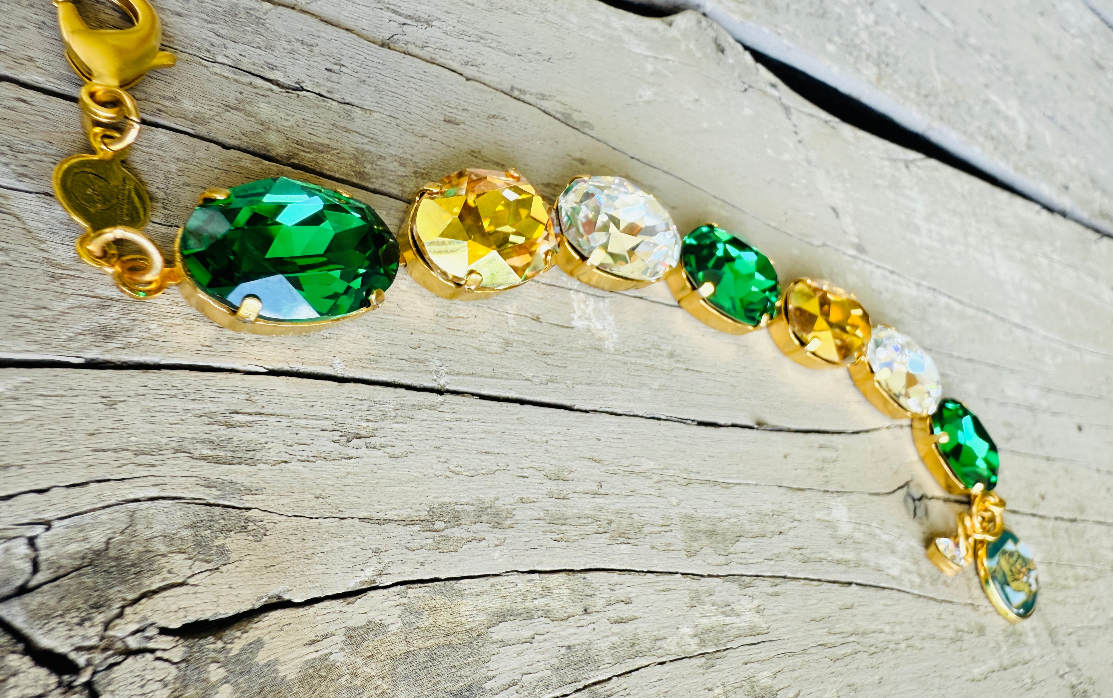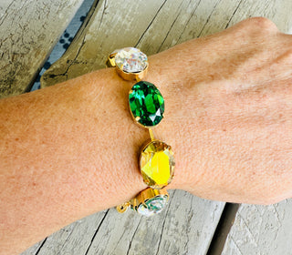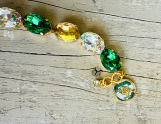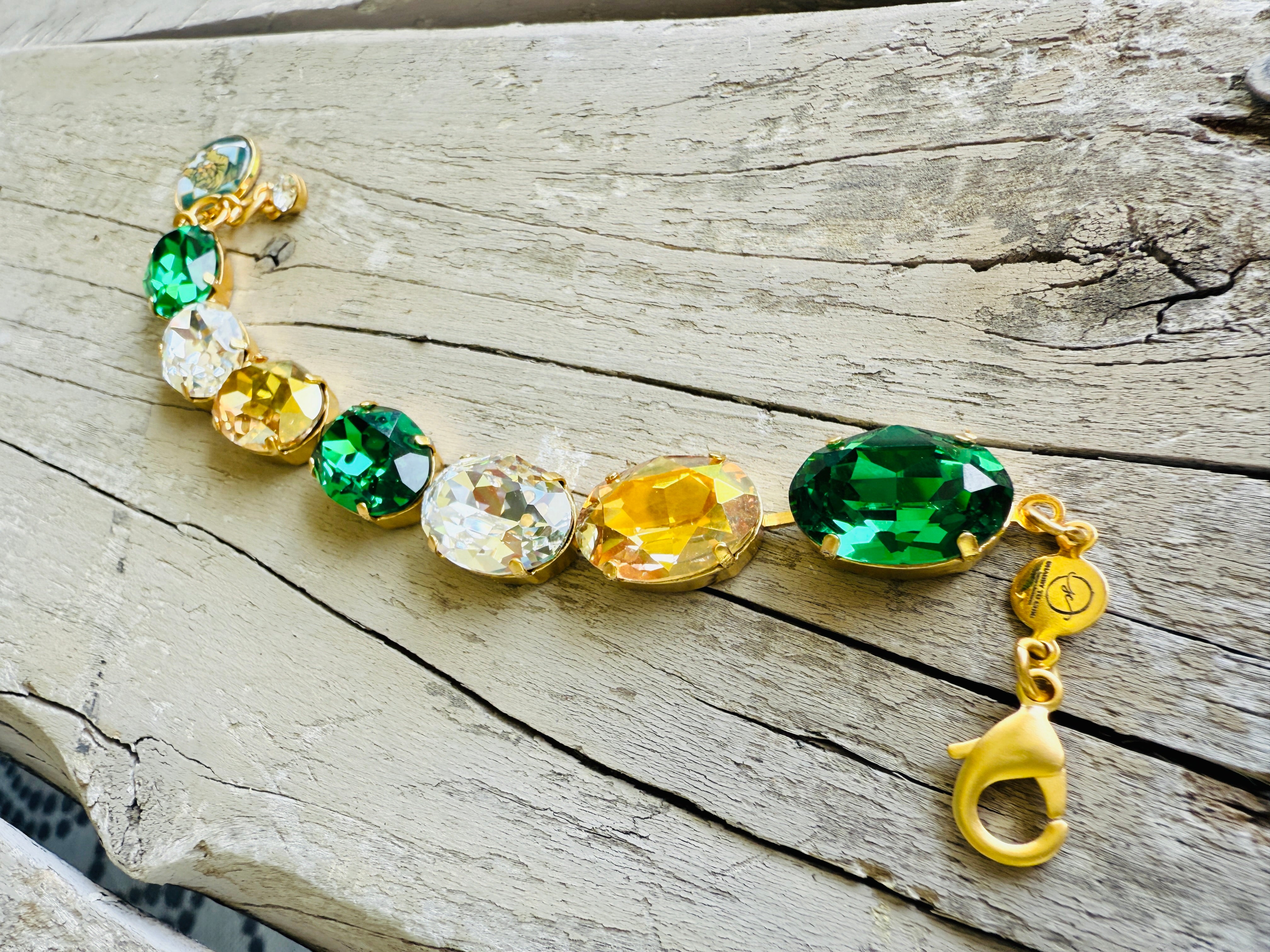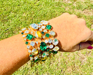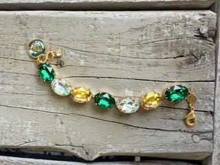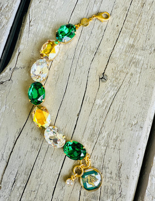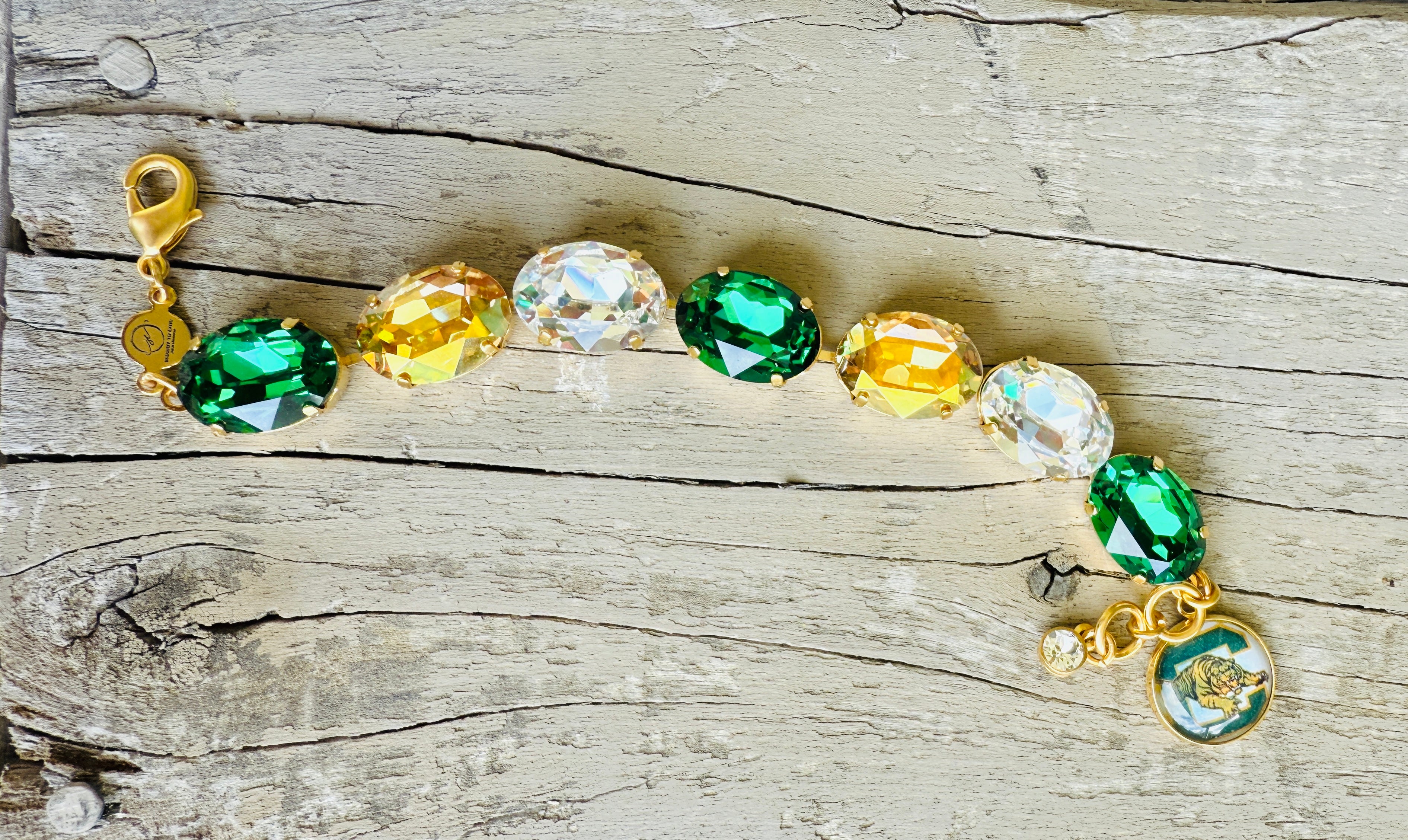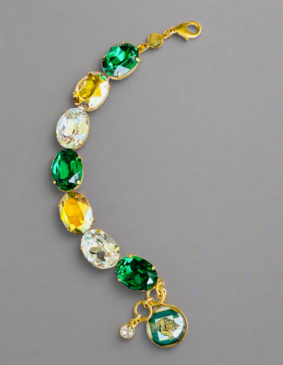 Elevate your support for the home team Tigers with added sparkle! This oval cut crystal bracelet is a must-have for your game day outfit. Featuring gold, crystal clear, and emerald green hues, in a luxurious satin gold finish.