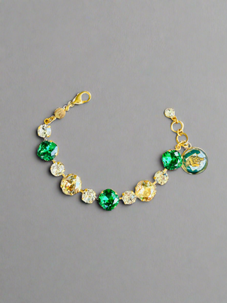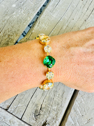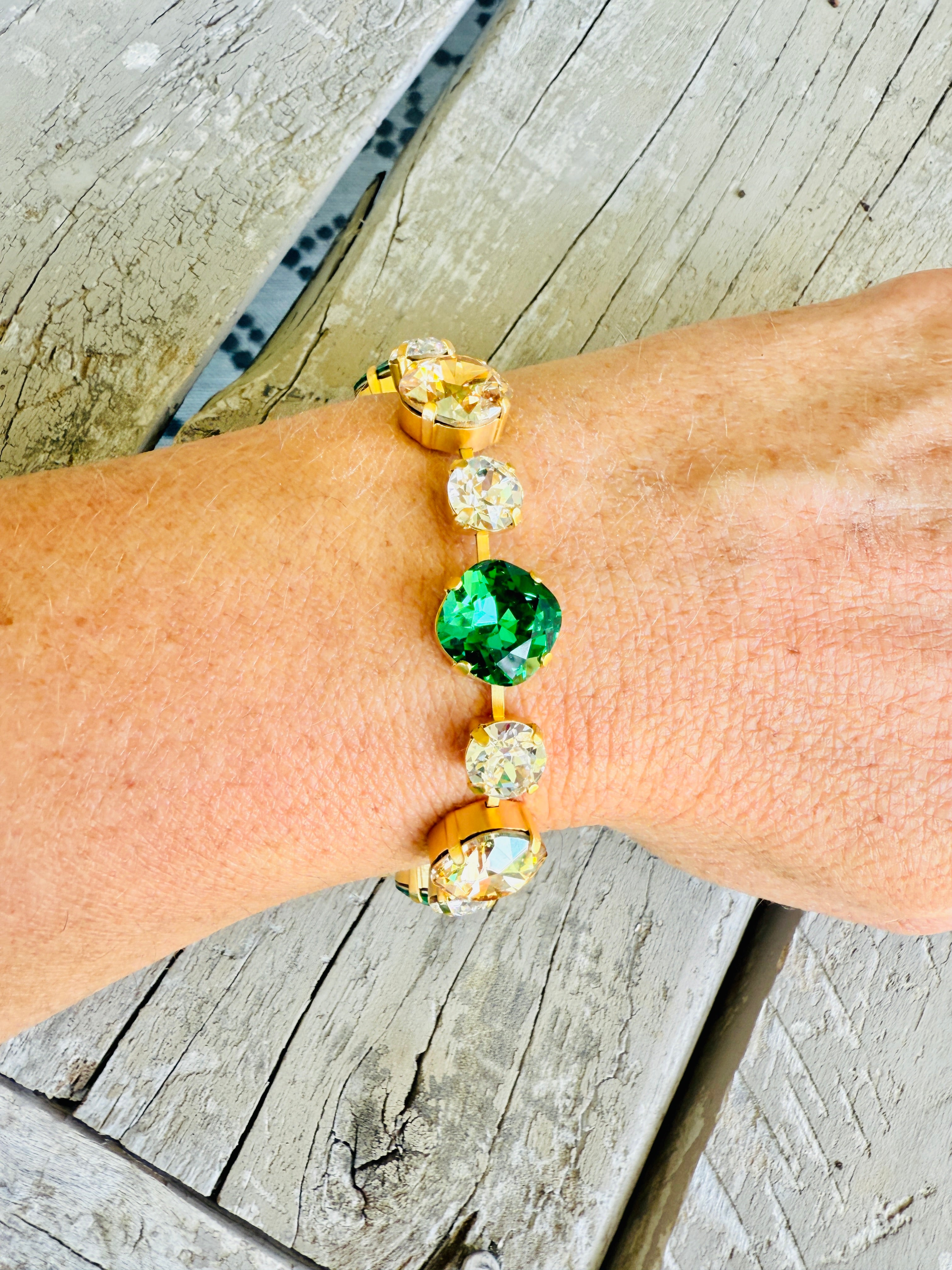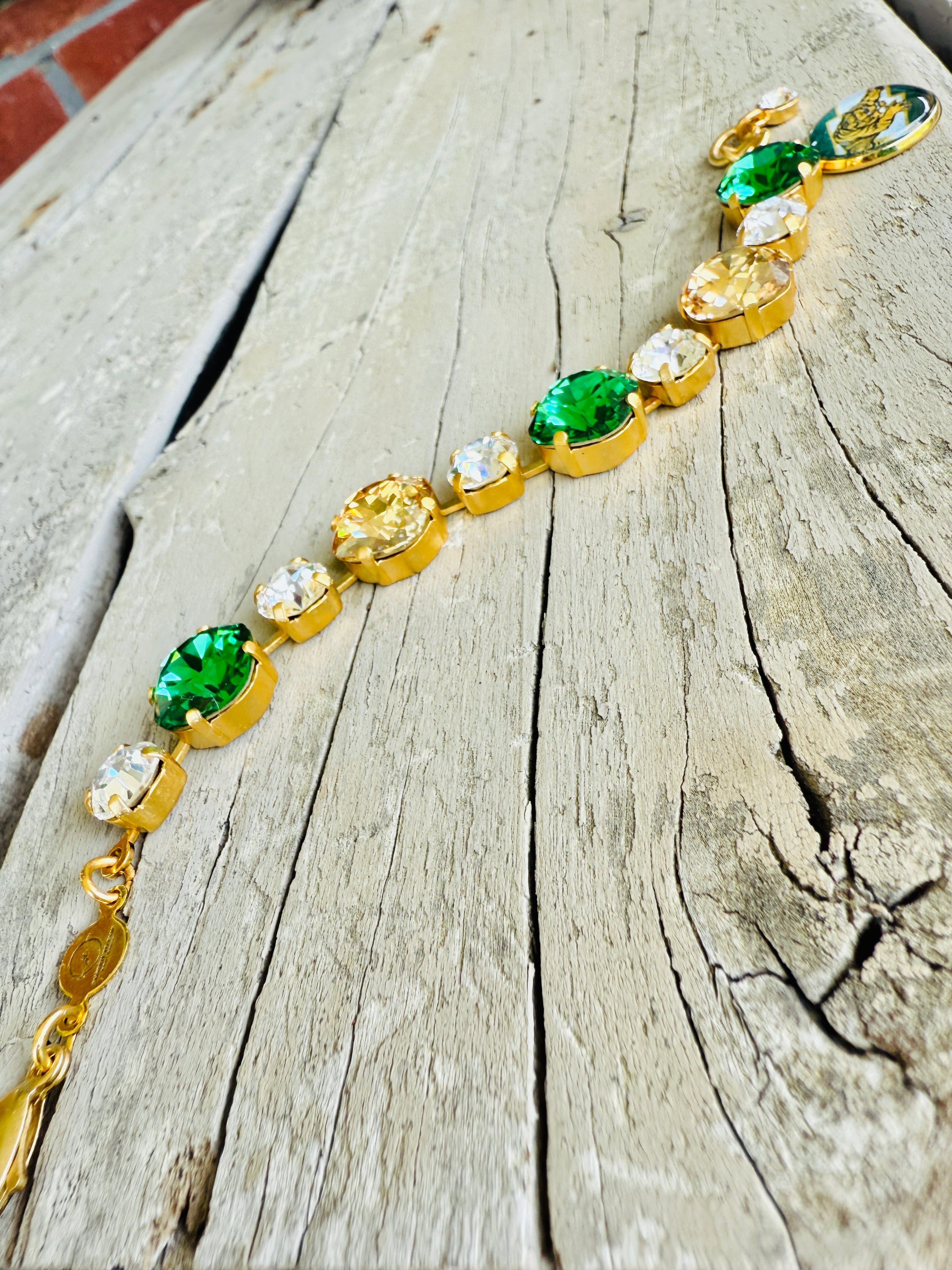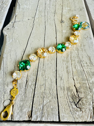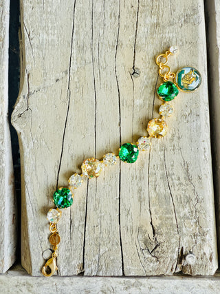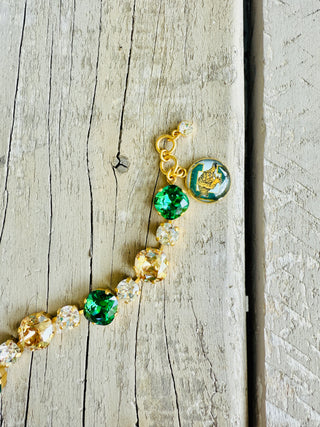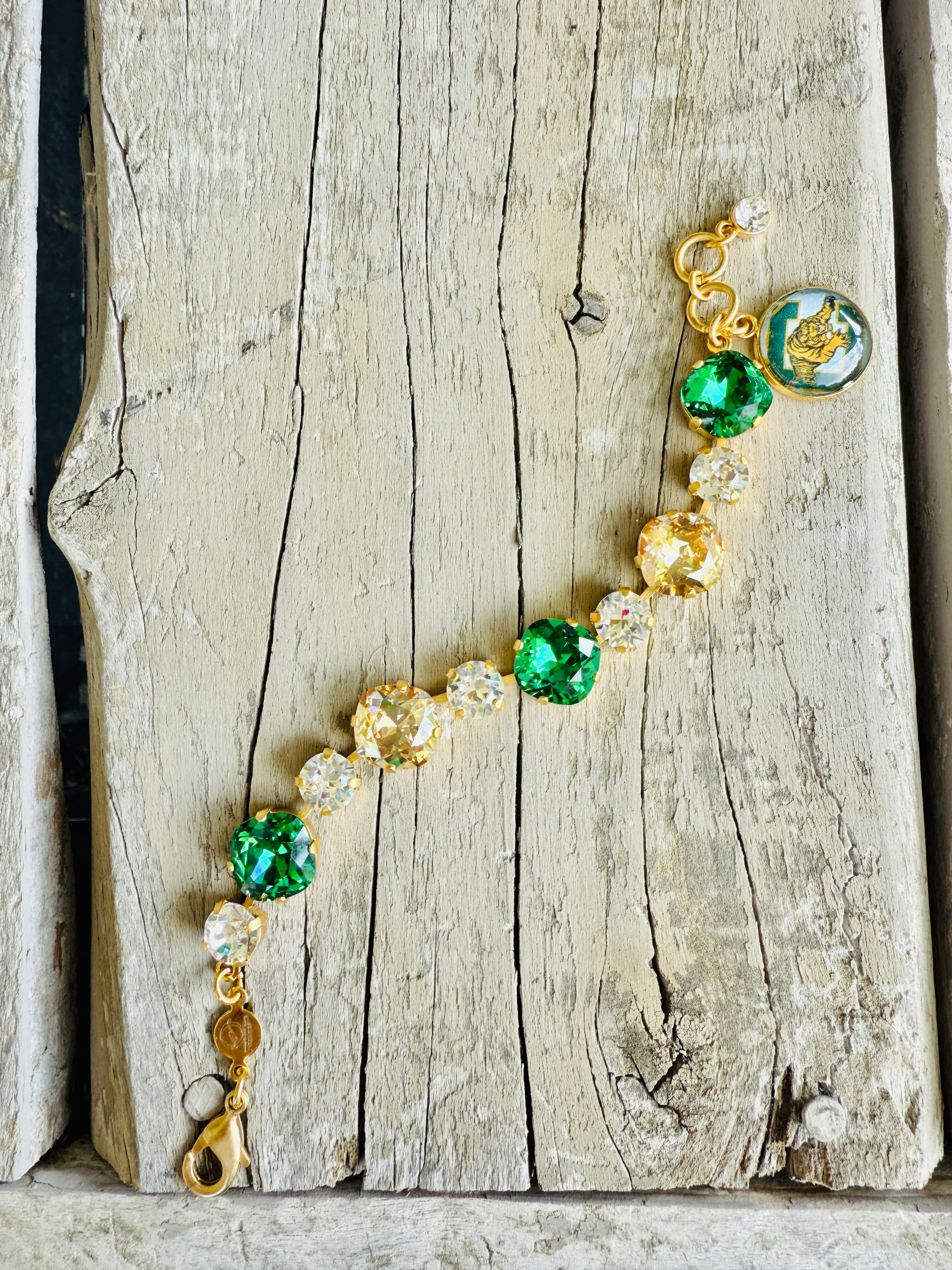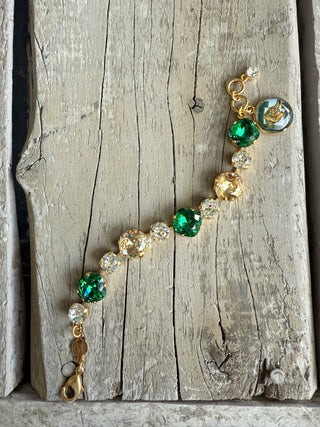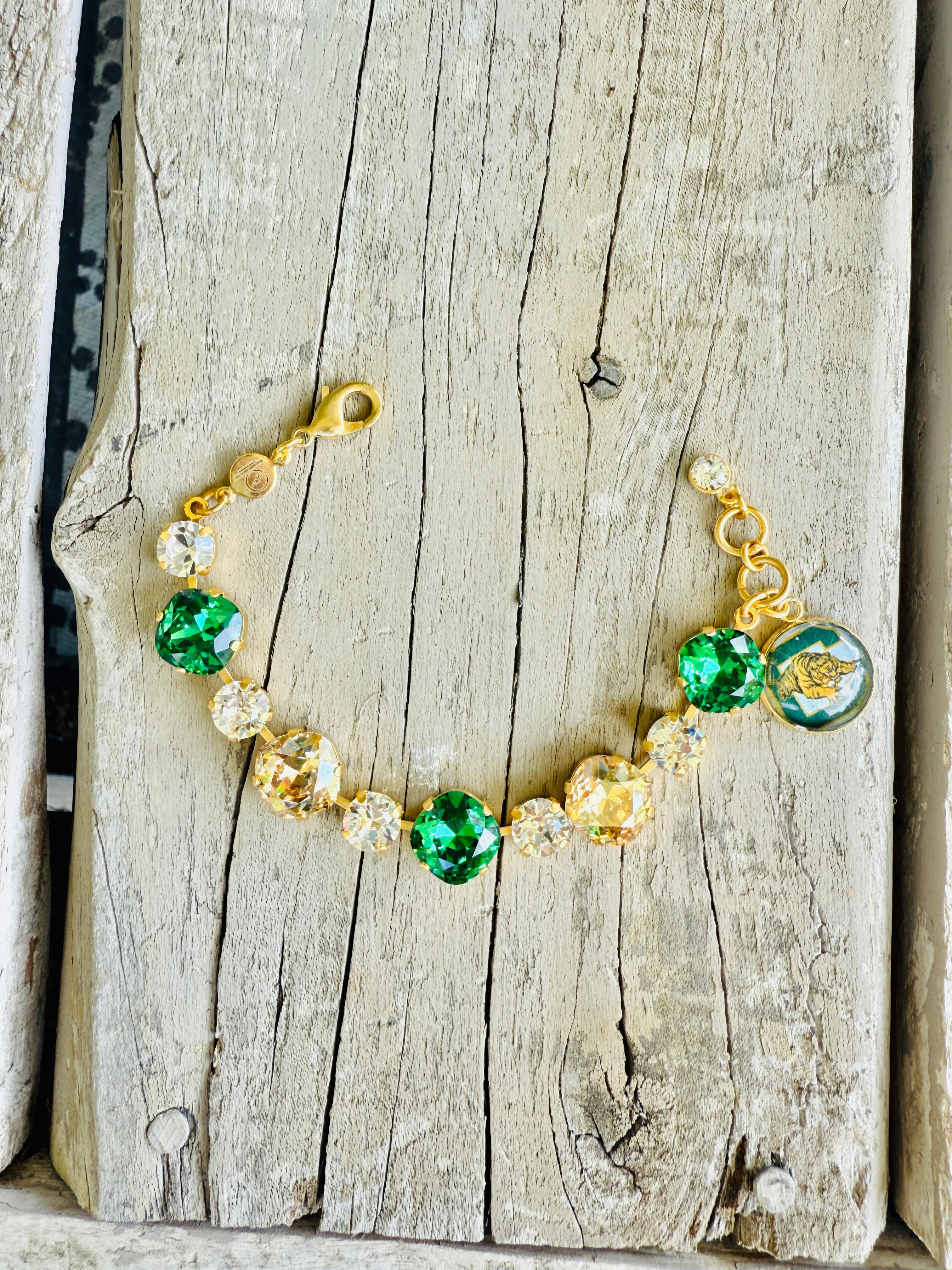 Get ready to support your Conway Tigers in style with this stunning crystal tennis bracelet. Featuring alternating shades of green, gold, and clear crystals, you'll dazzle the crowd as you cheer on your team. The bracelet has a beautiful matte gold finish and includes the CHS logo, a lobster clasp, an extender chain, and an end crystal charm. Show your team pride with this sparkly and fashionable accessory!