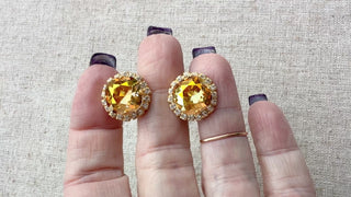 The Amelia earrings feature a cushion cut square crystal at the center, creating a dazzling sparkle. Additionally, the center stone is framed with pave-style crystals, adding an elegant touch. These earrings are designed to be lightweight for maximum comfort.