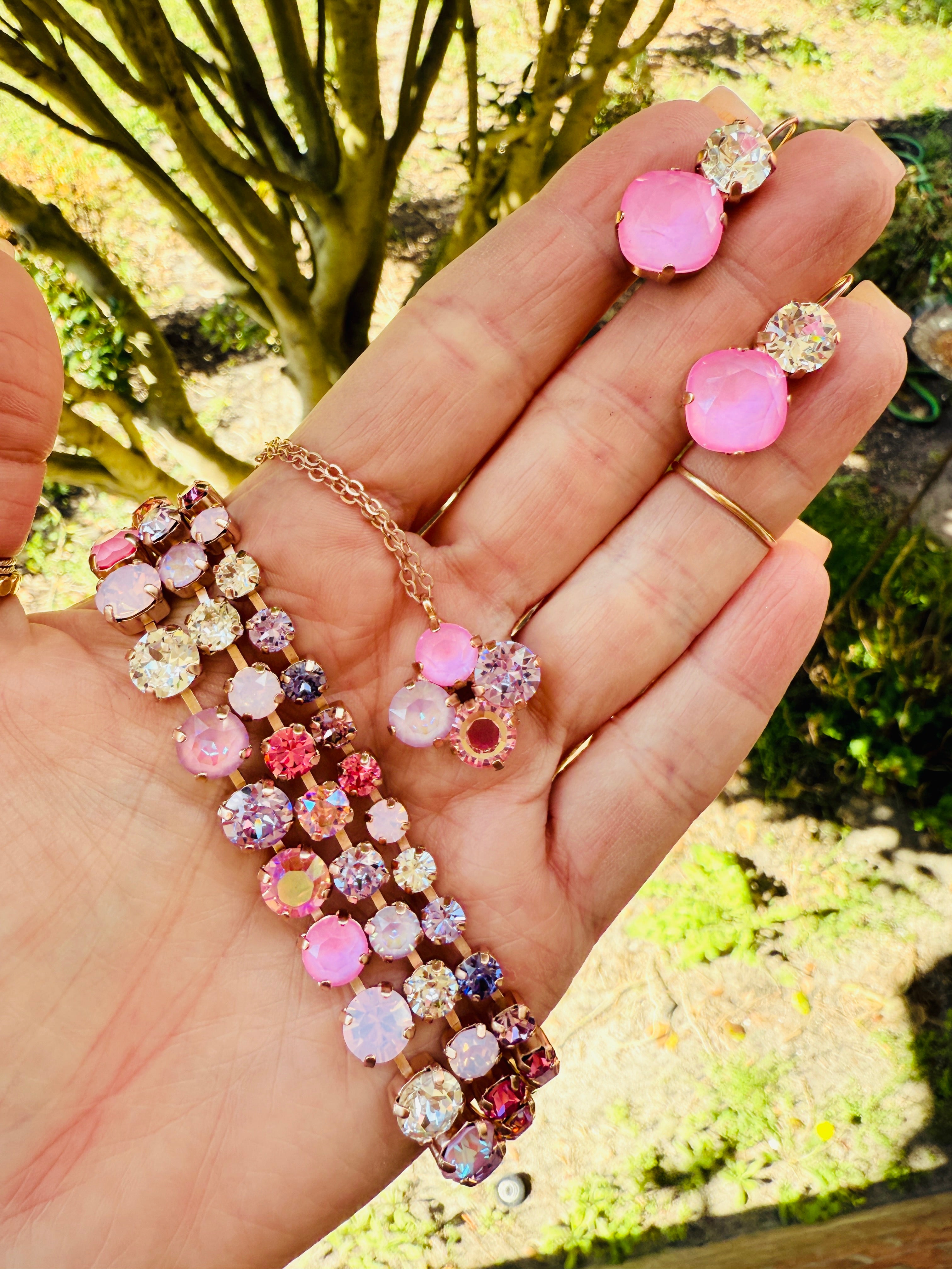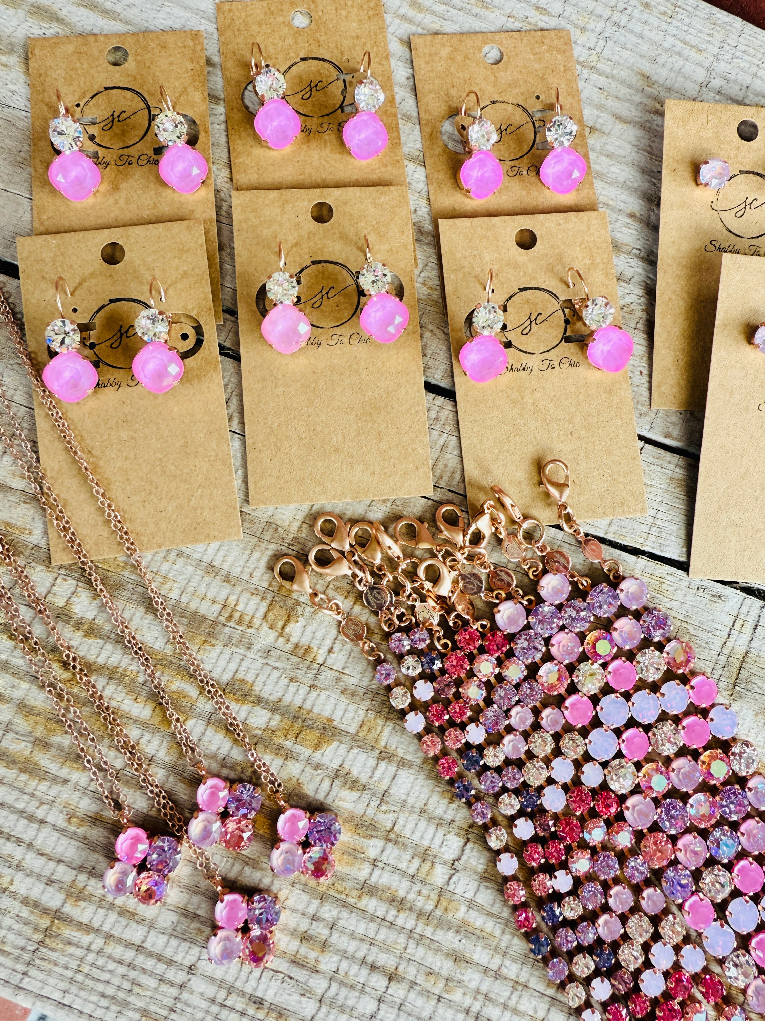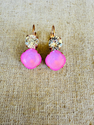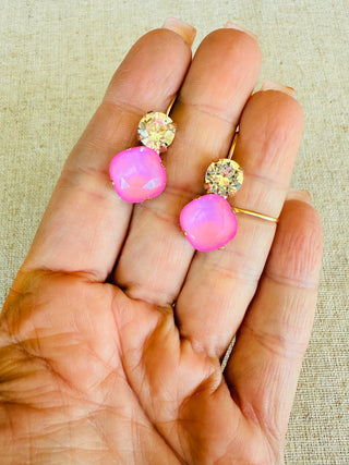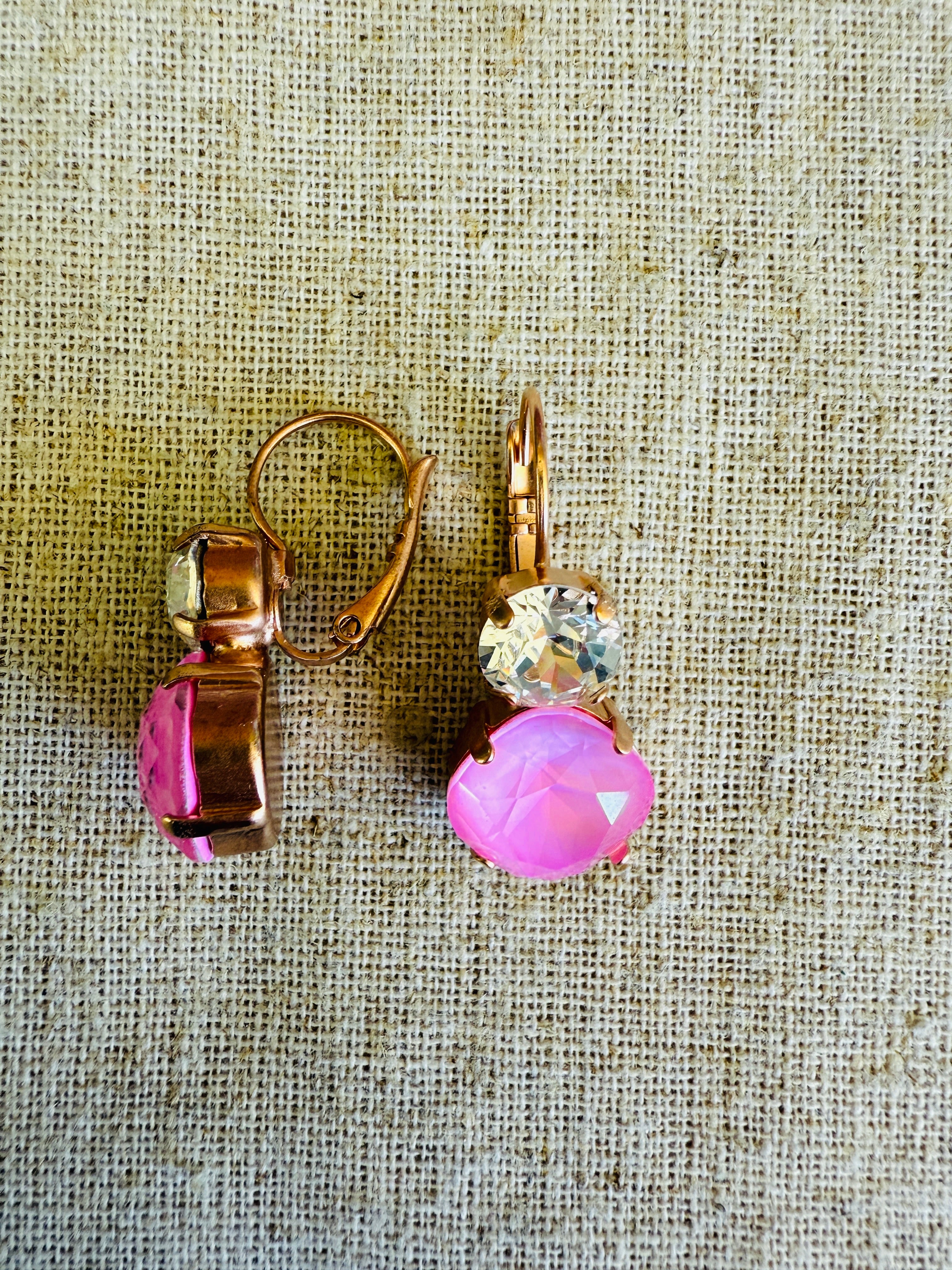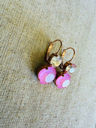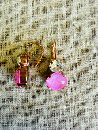 Two tone crystal dangle earrings in the perfect shade of pink and finished in a satin Rose Gold. Dangle style, lever-back closure for easy on/off and comfortable all day wear. Lead and nickel free.