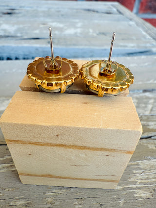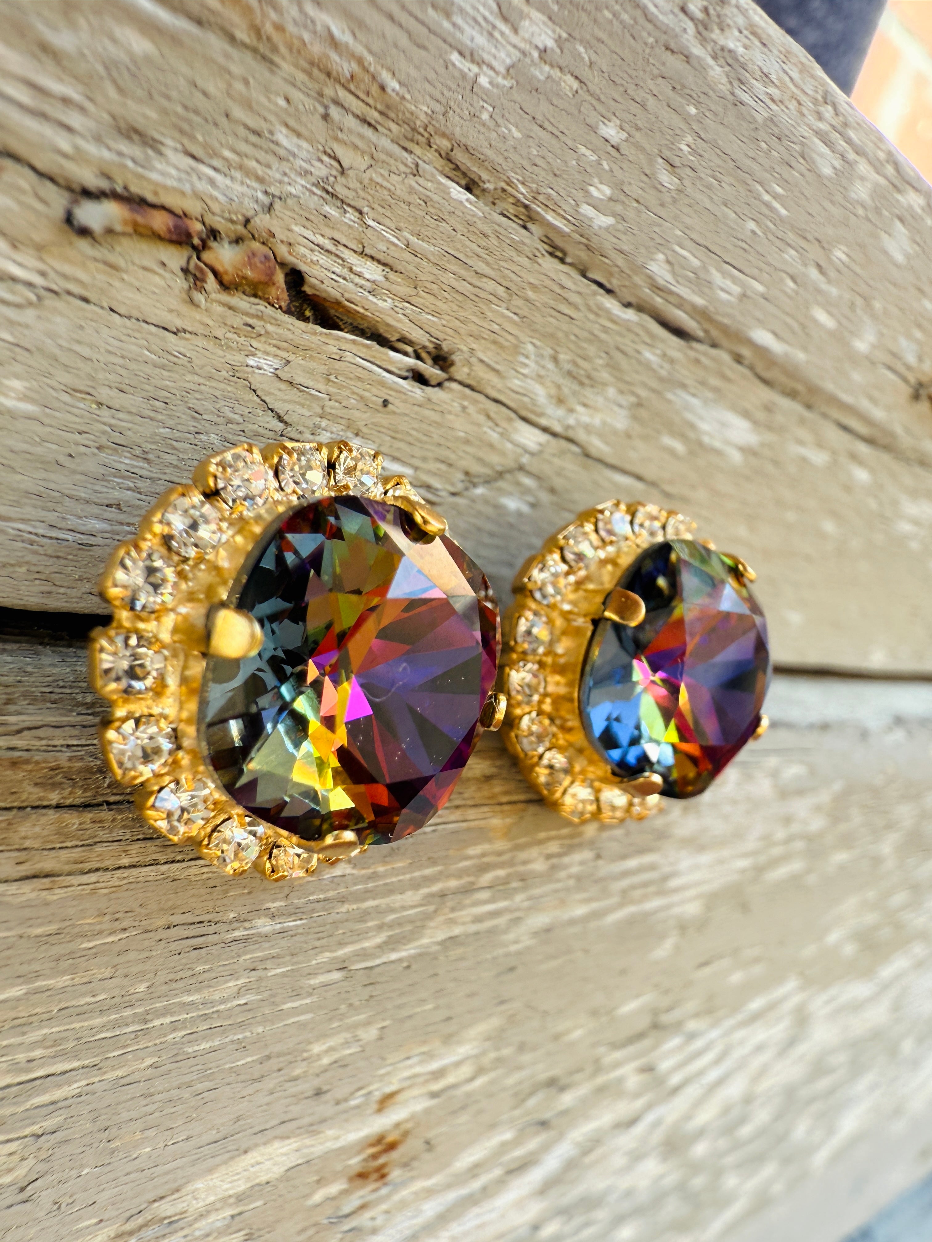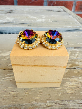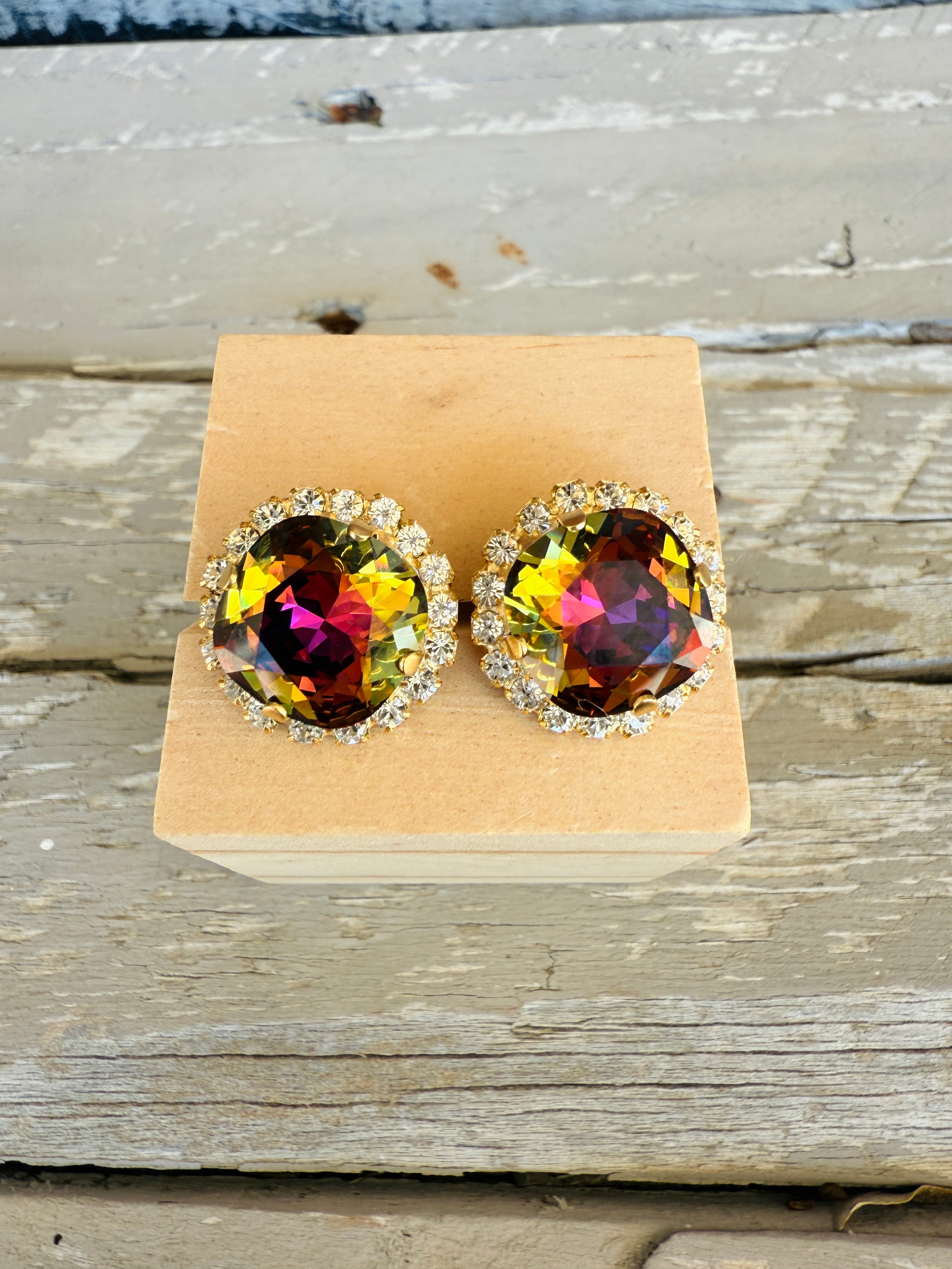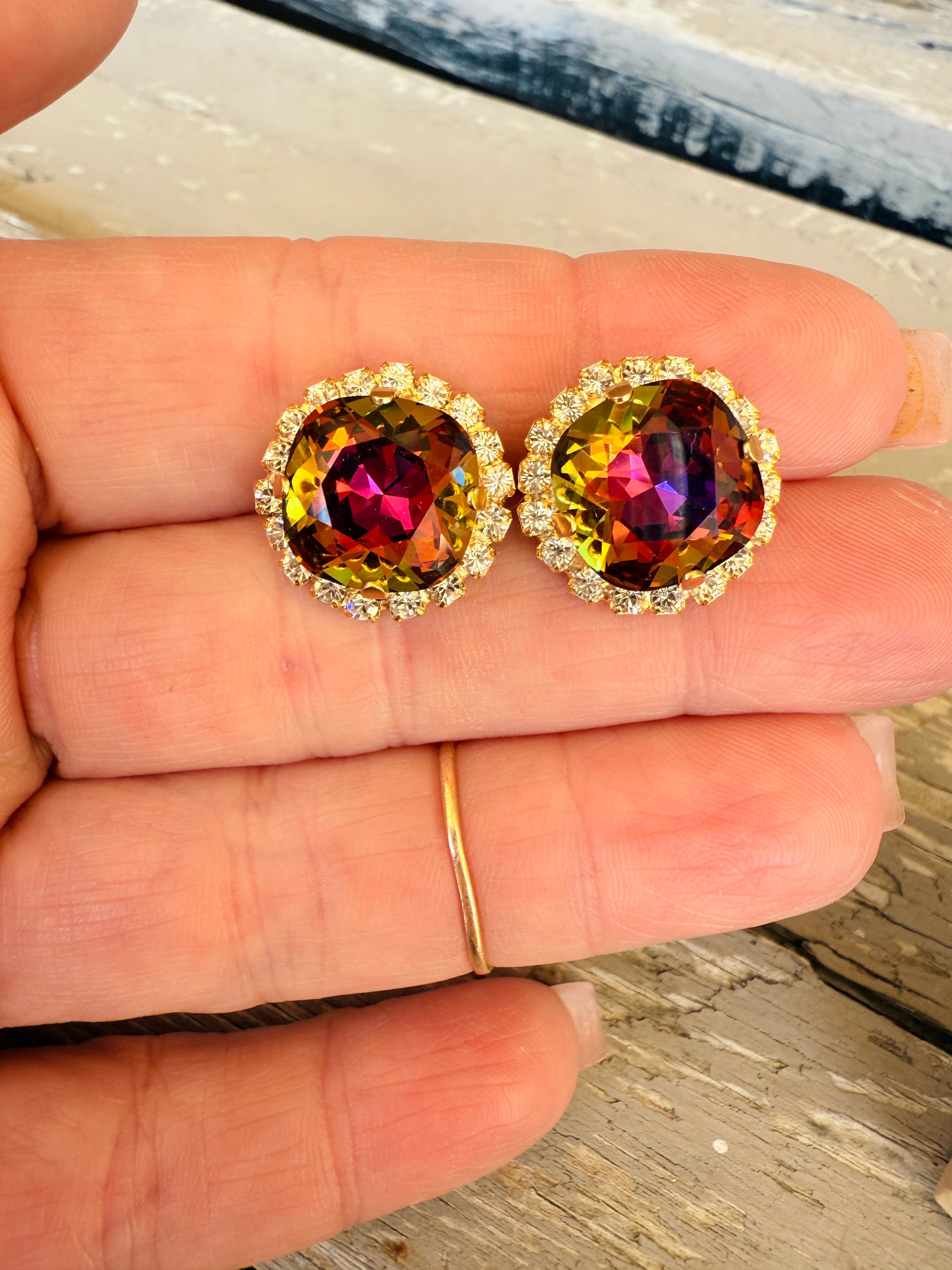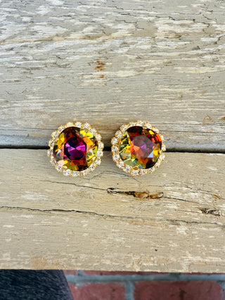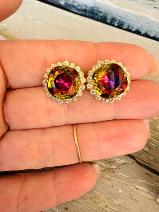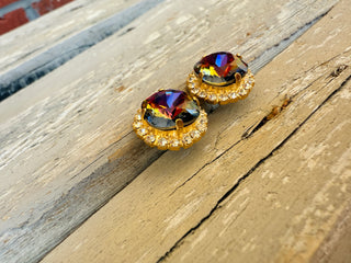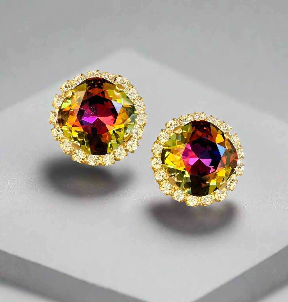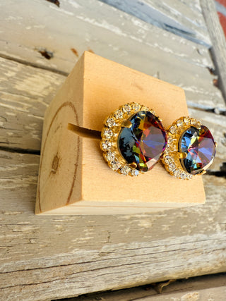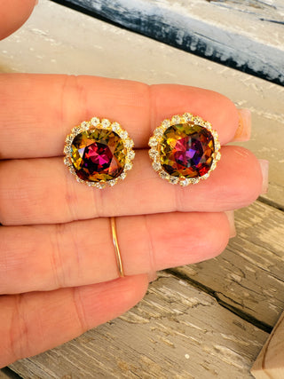 Crafted with precision from high-quality 12mm crystals and featuring a stunning pave crystal halo, these stud earrings boast a matte gold finish for a sleek and elegant look. Perfect for adding a touch of sophistication to any ensemble. These vibrant and eye catching crystals catch an array of warm hues tomcolor shift between shades of amber, purple, golds, and browns. Truly unique!