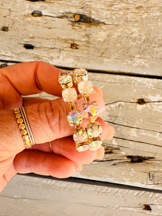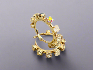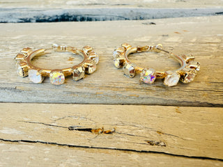 Neutral crystals nestled in matte silver hoops. Lever-back closure, available in five different finishes.