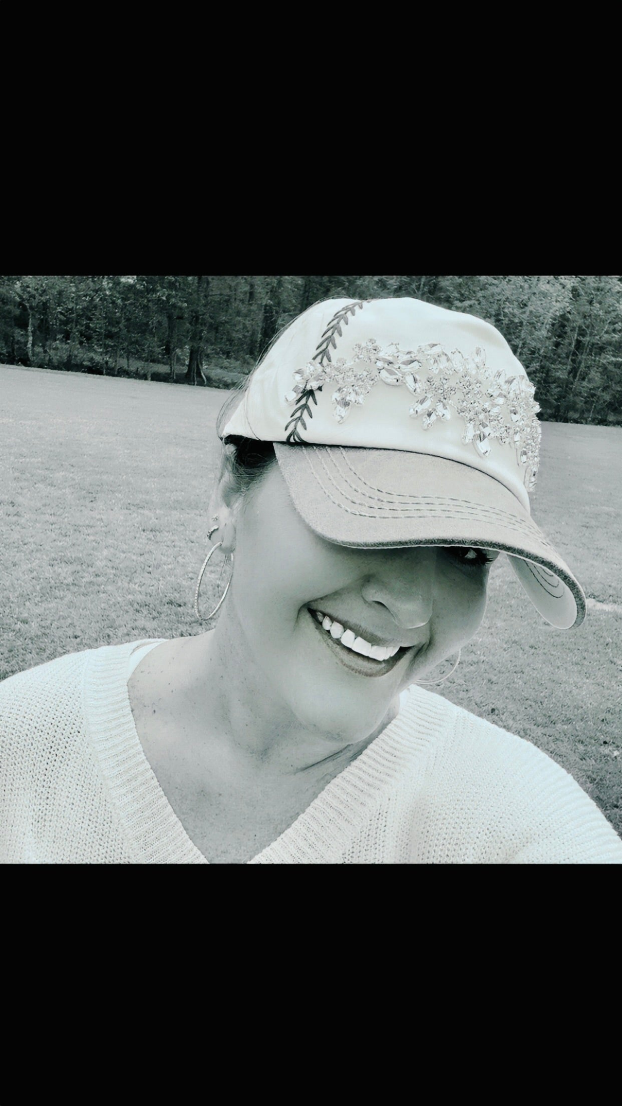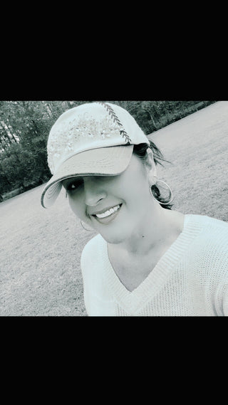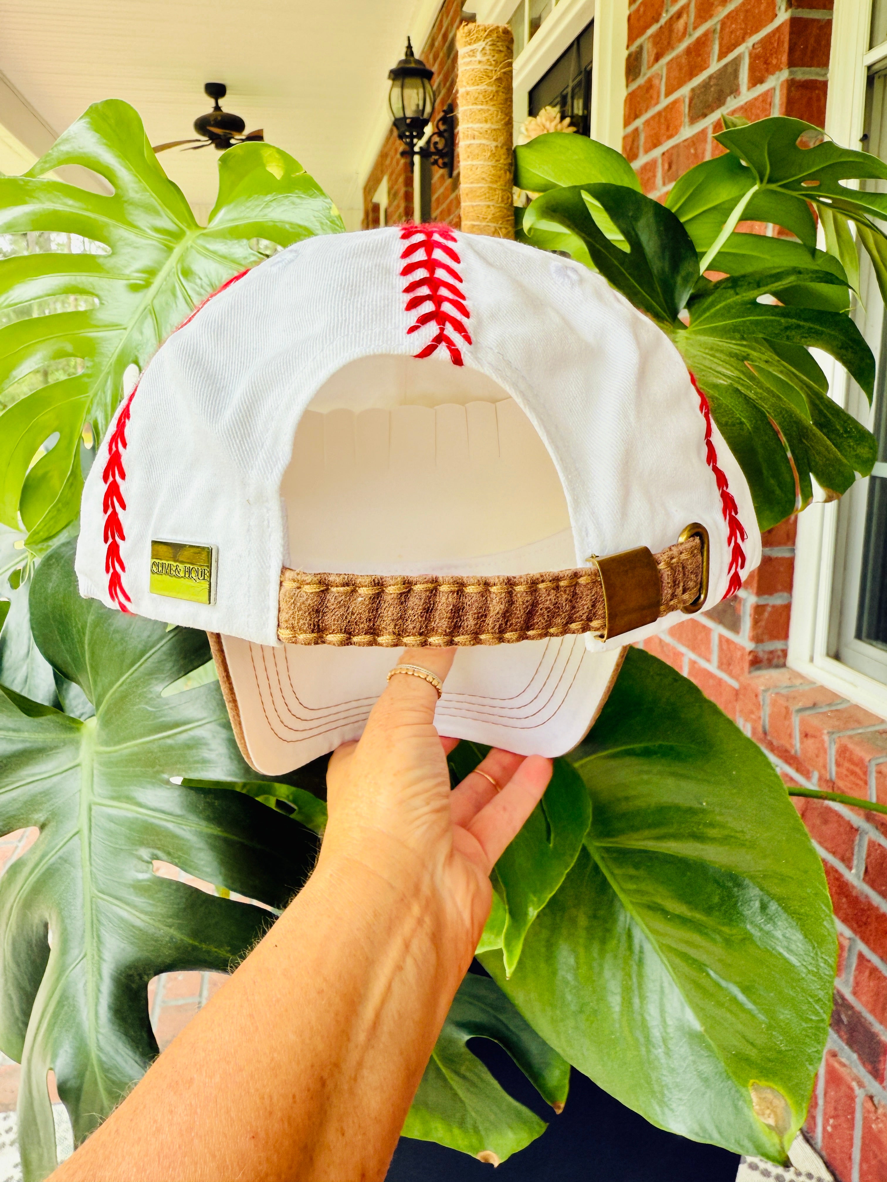 White canvas twill hat base with red contrast baseball stitiching. Leather like bill and matching button cap to give the perfect contrast. Clear crystals adorn the front of the hat to catch every glimmer of sunlight. This style can be customized to your team colors, just send us a message. Adjustable leather sliding closure for the most comfortable fit. Opening for ponytail. One size fits most.