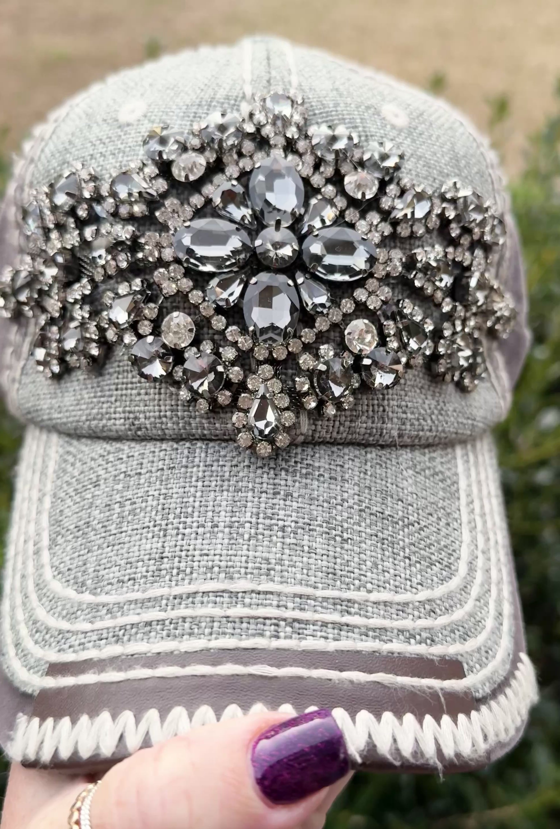 Embroidered with crystal clear rhinestones centered in the front of the hat. Back of hat is cotton twill. Hat base is a cotton twill material, gray in color
