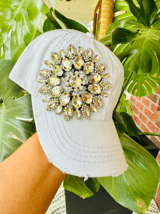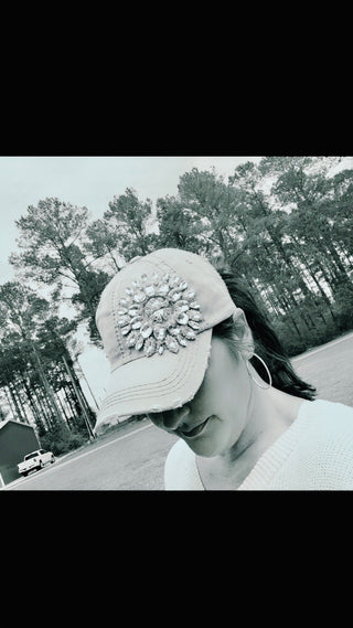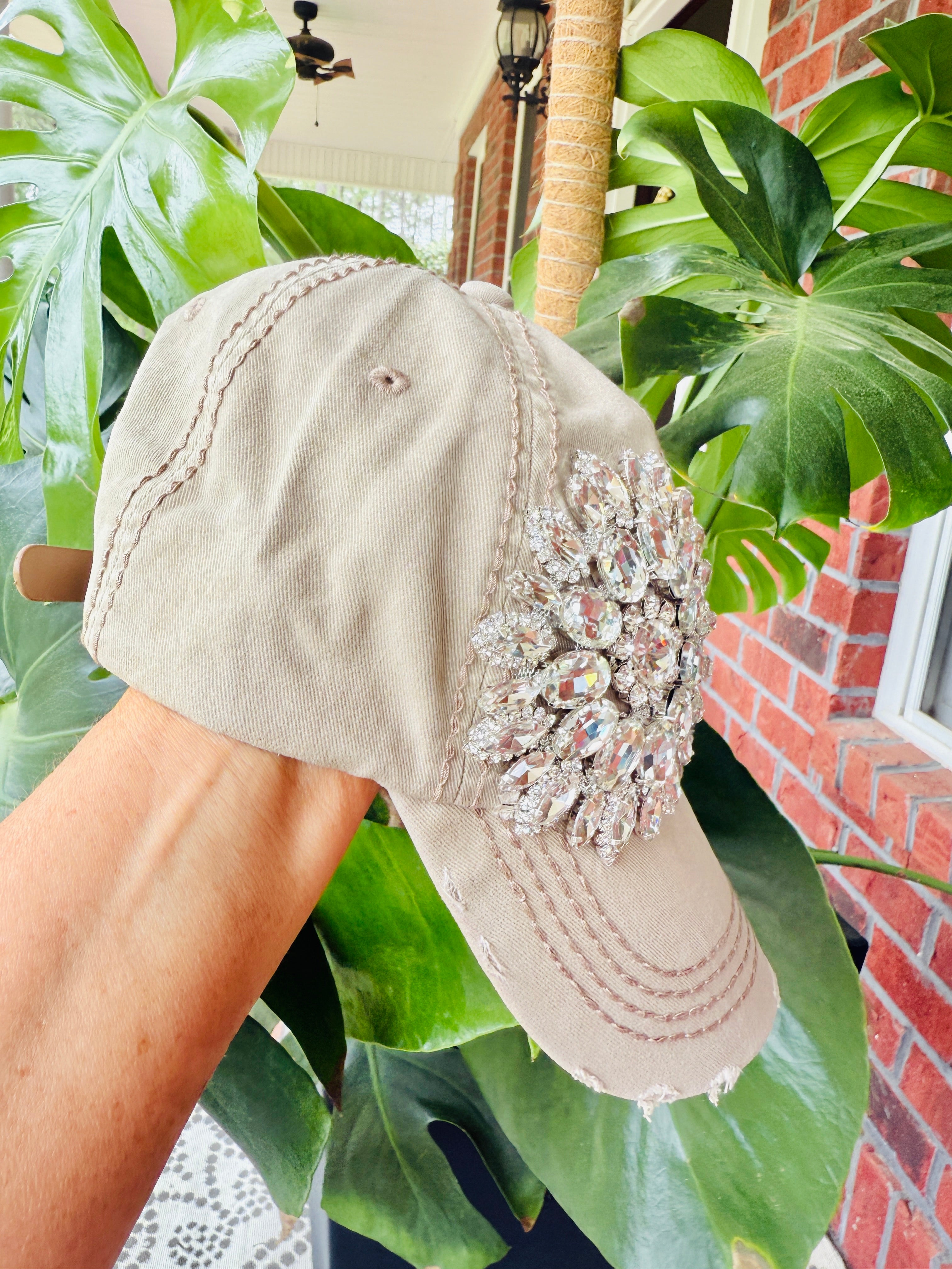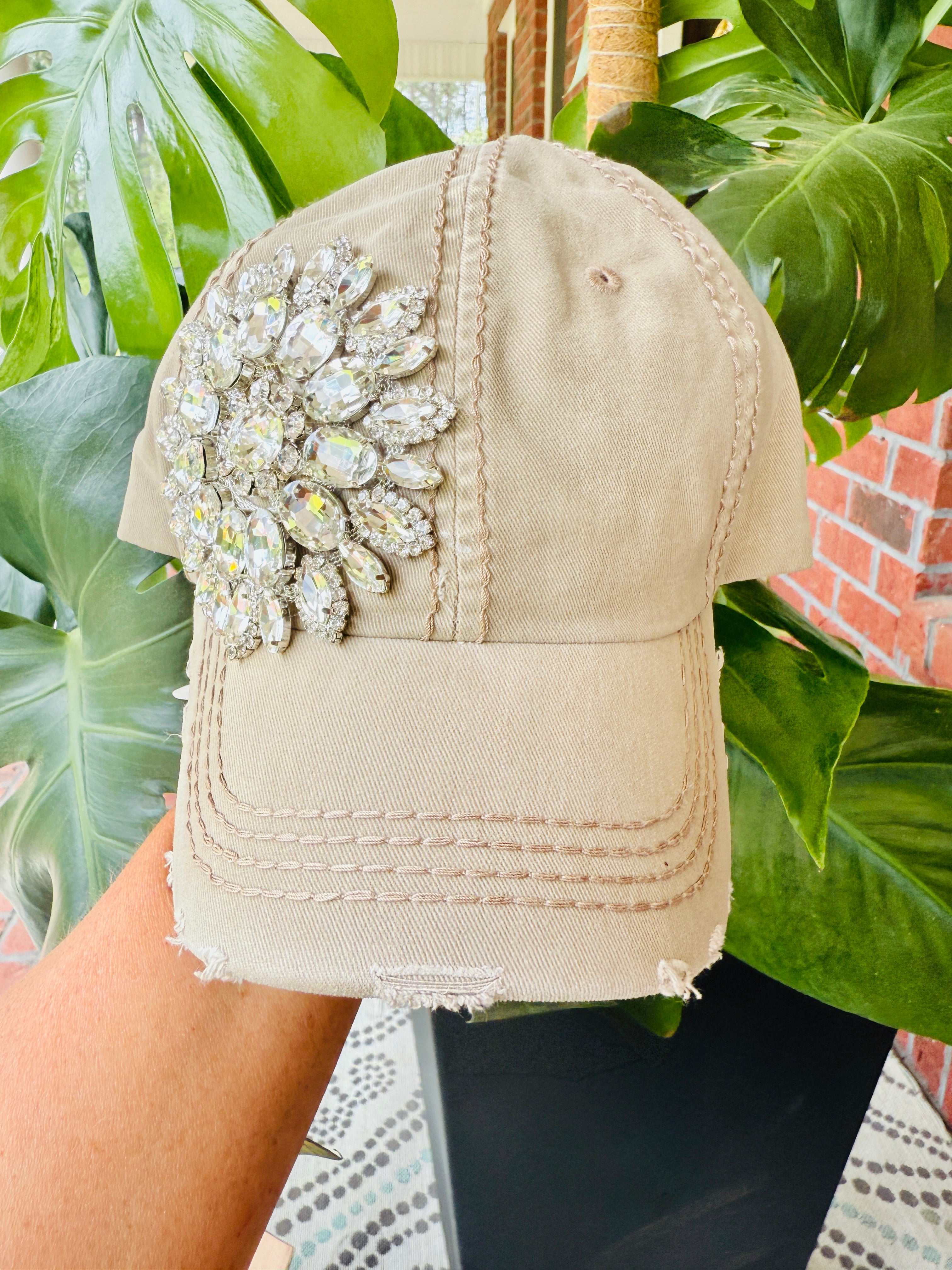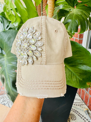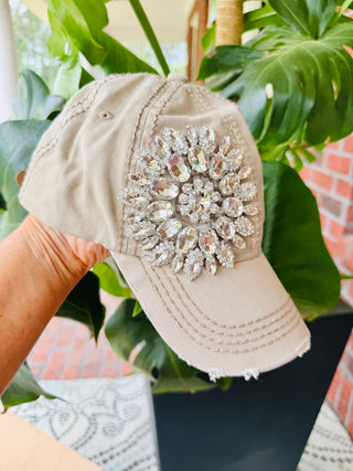 Cotton twill blend. Complete with perfectly placed sunburst pattern of crystals to accessorize any outfit. Khaki cotton twill material, and clear crystal rhinestones.