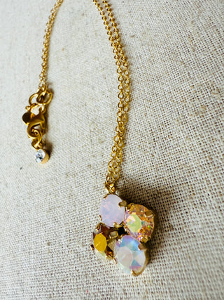 Warm beige, Amber gold, blushing pink, and flecks of iridescent blues collide into the most breath taking display of colors. Packing a sparkle punch but neutral all at the same time. Clover style pendant with four 8mm crystals.