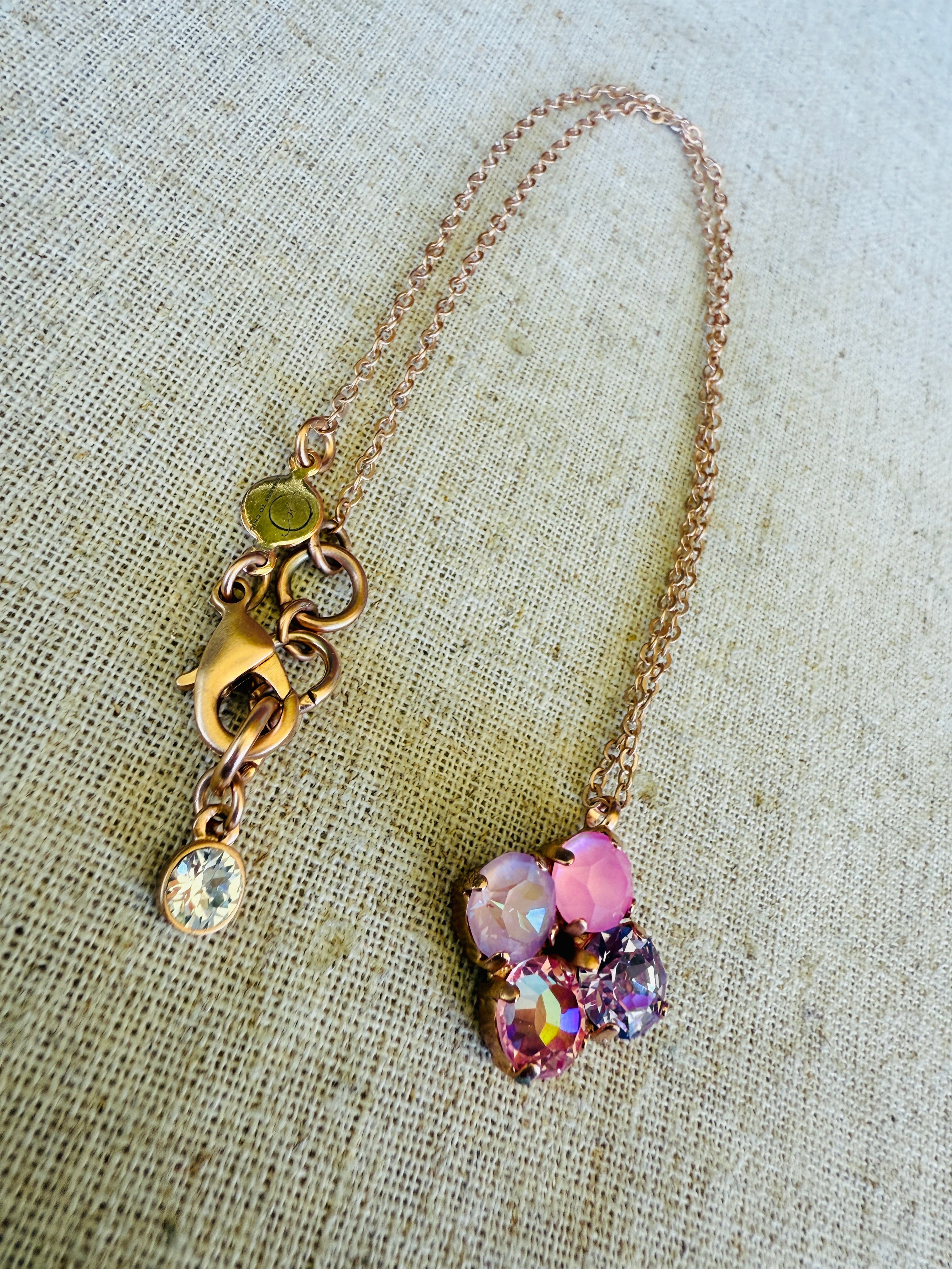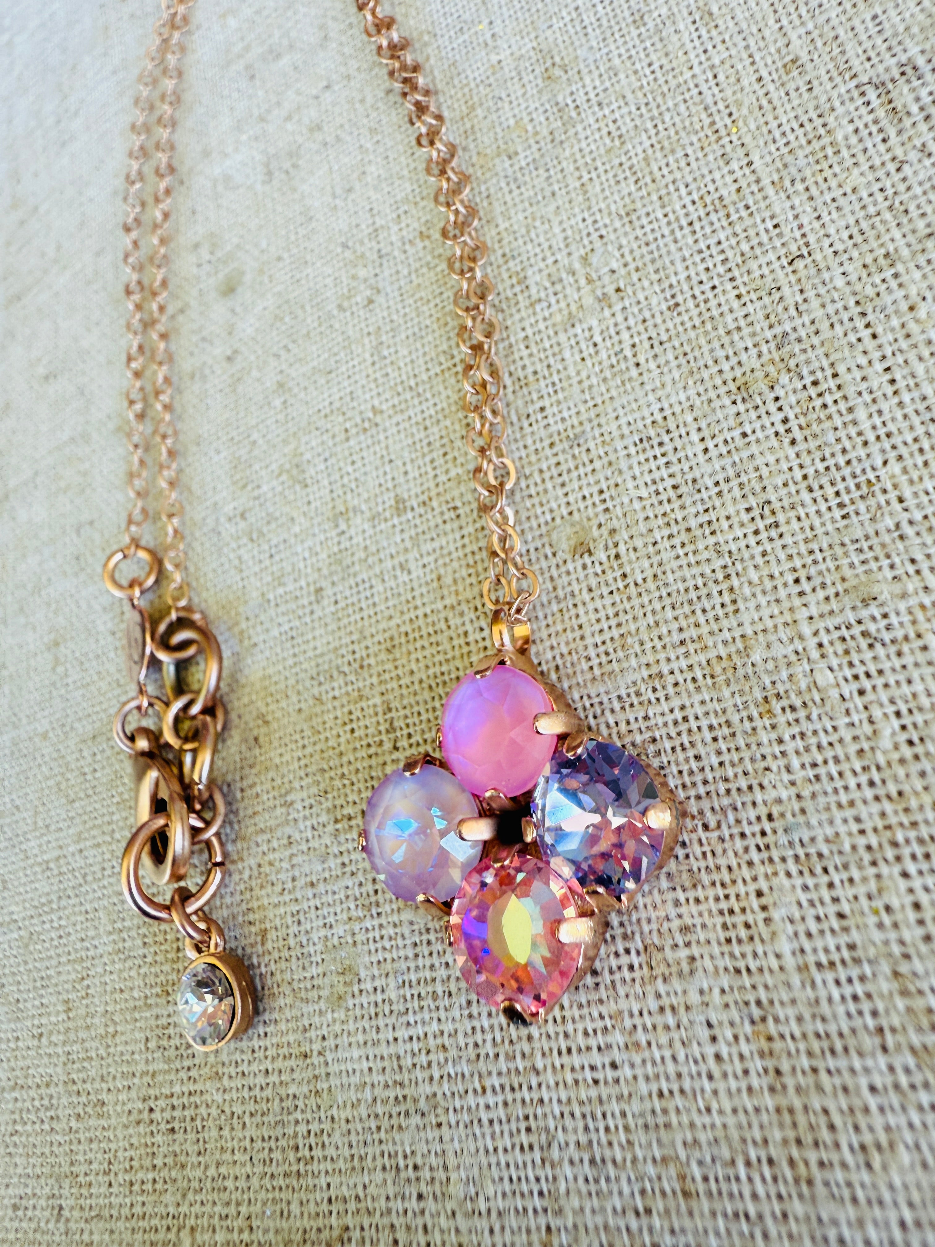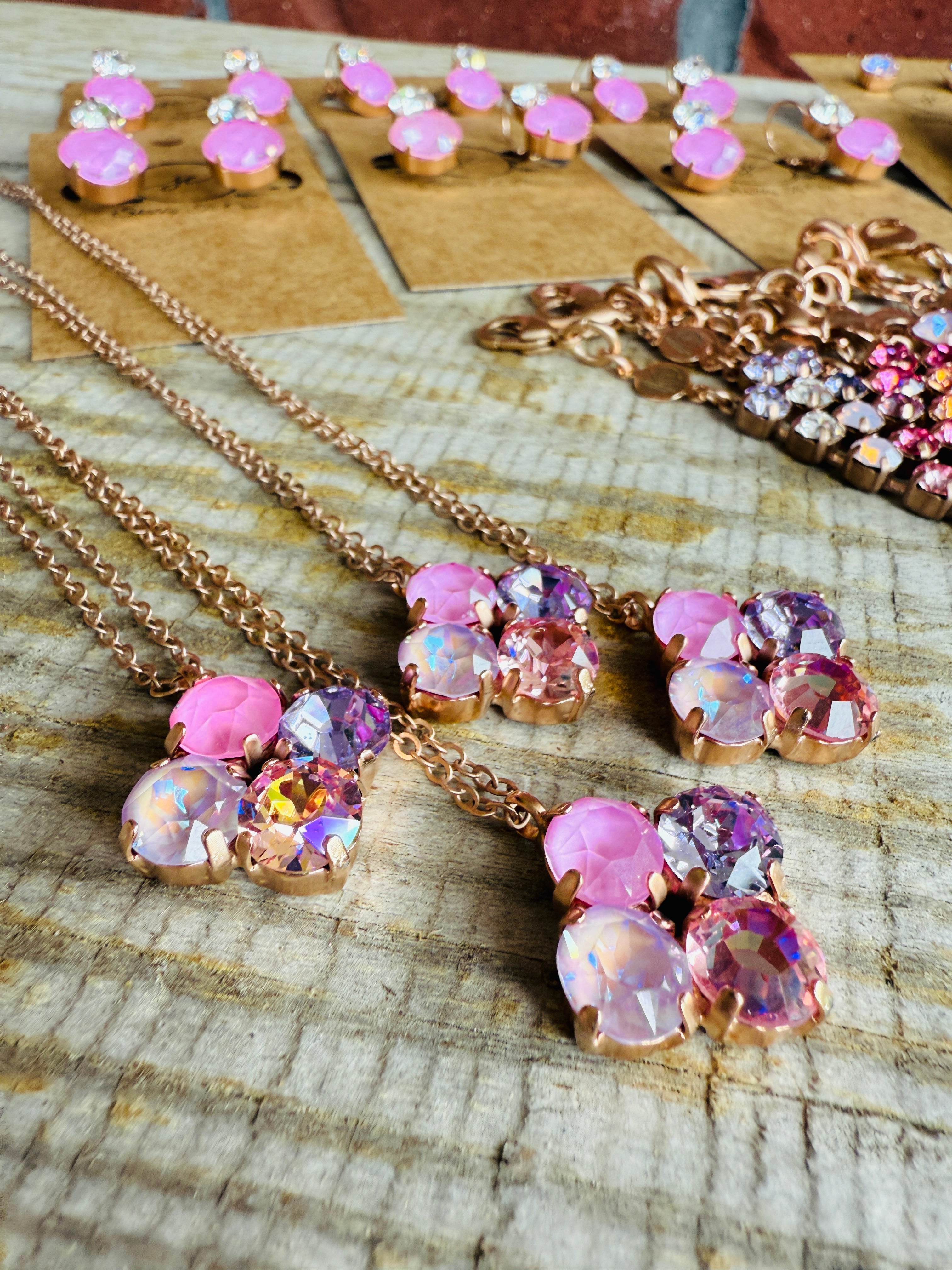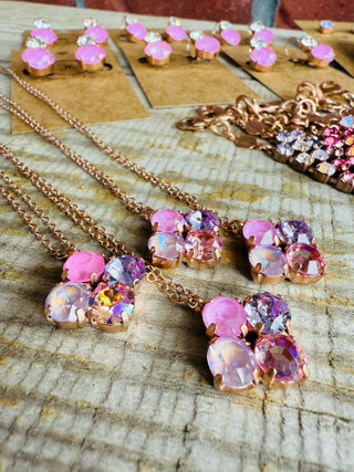 Soft pinks and Lilacs pair beautifully together in this quad style pendant. Packing a sparkle punch but neutral enough to wear with all your favorite outfits.