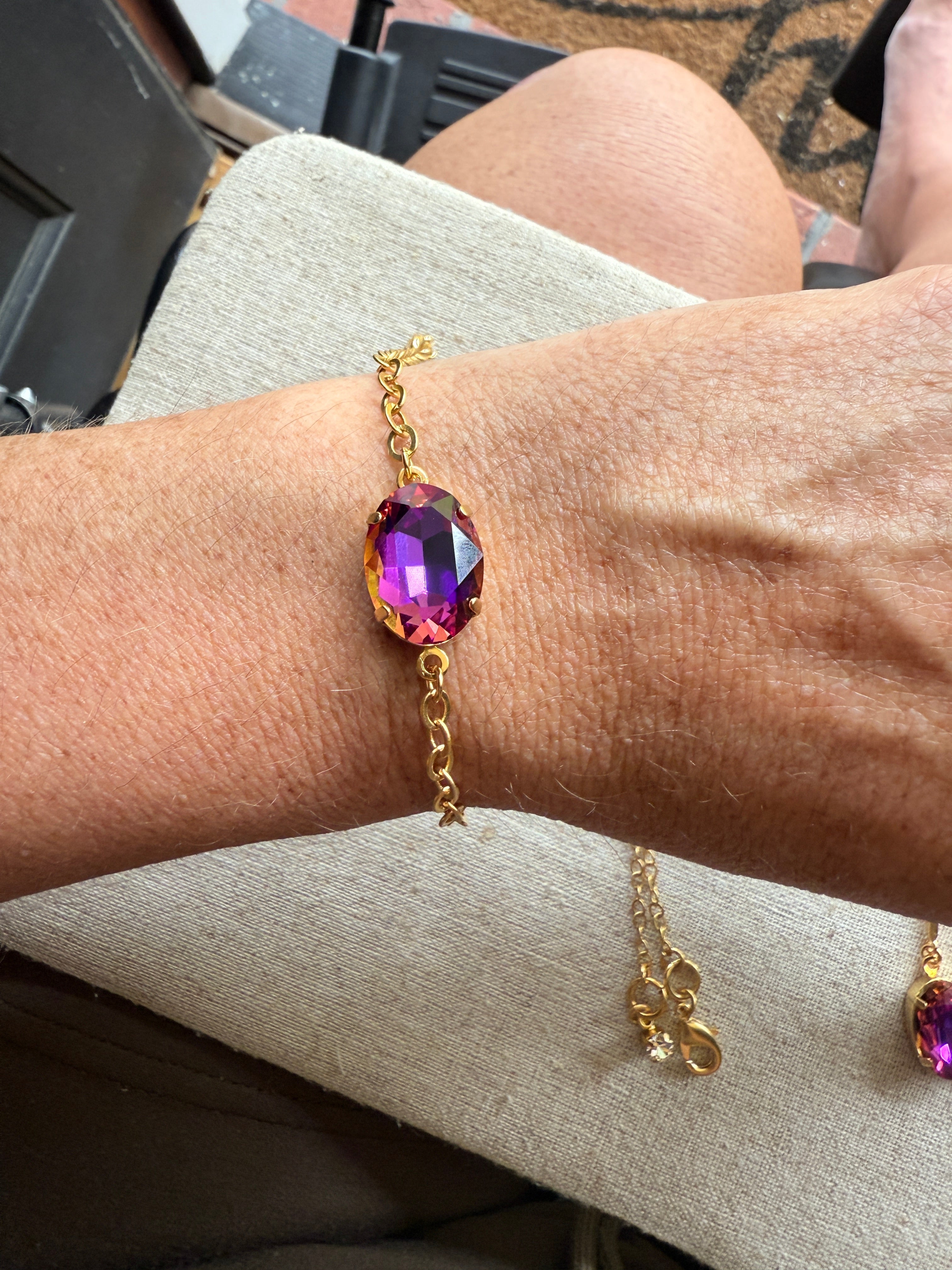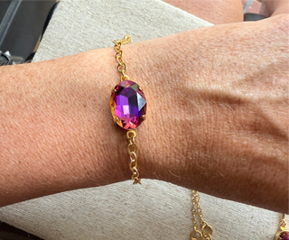 Bracelet: 18mm oval crystal center set with oval link chain, end charm, lobster clasp, and extender chain. Adjustable between 7"-7.5"