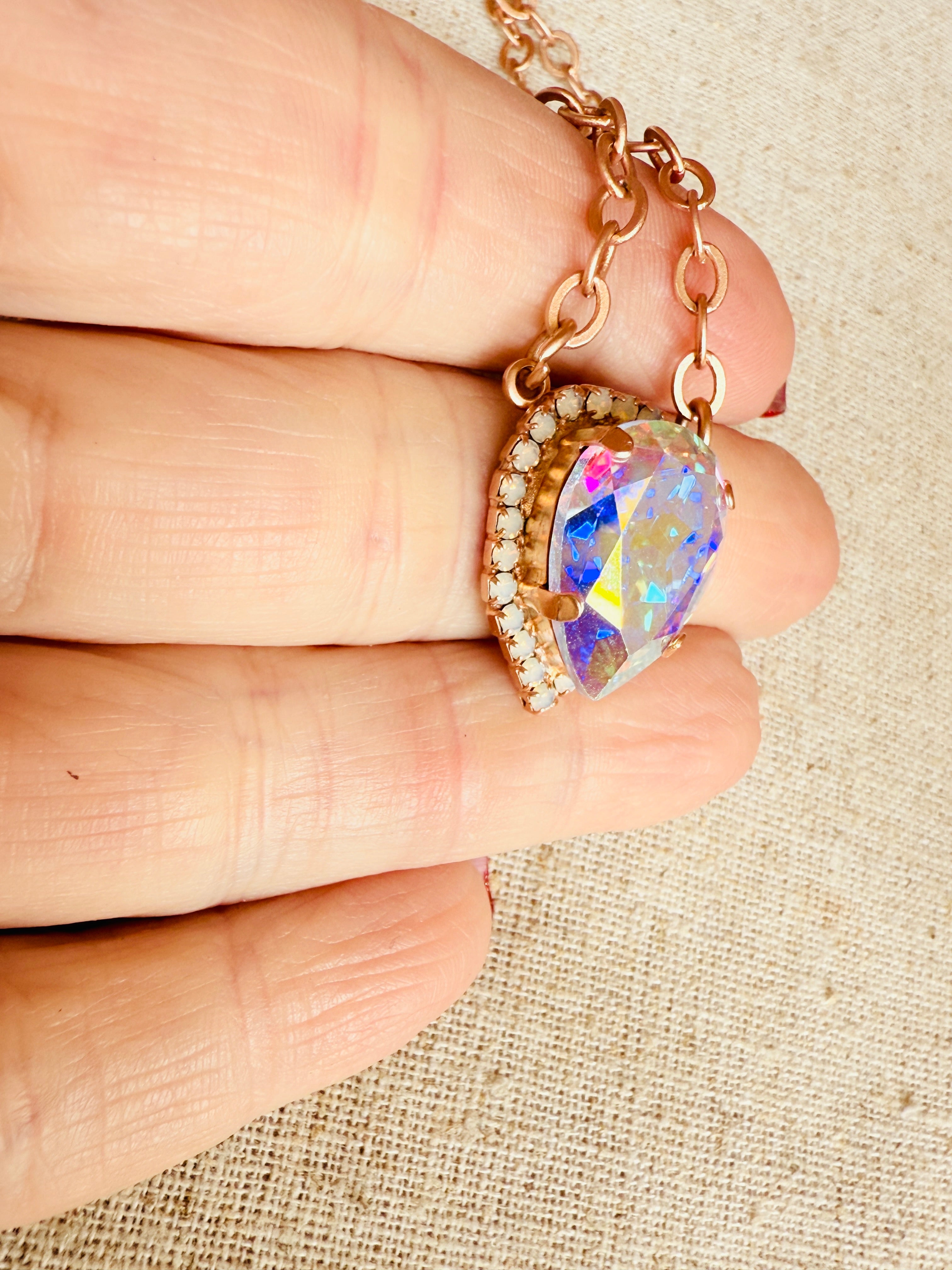 The Selena necklace has a pear shaped pendant centered on a rose gold chain. The setting is a sleek 18mm pear shaped pendant crystal, framed with a delicate halo of white opal crystals. 16" in length and complete with a extender chain, elegant dangle charm, charming logo disc, and secure lobster clasp.