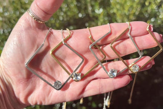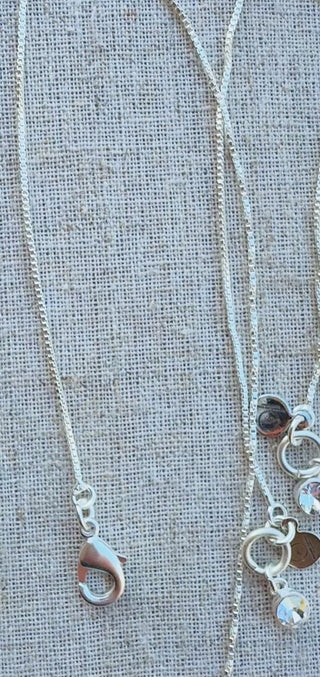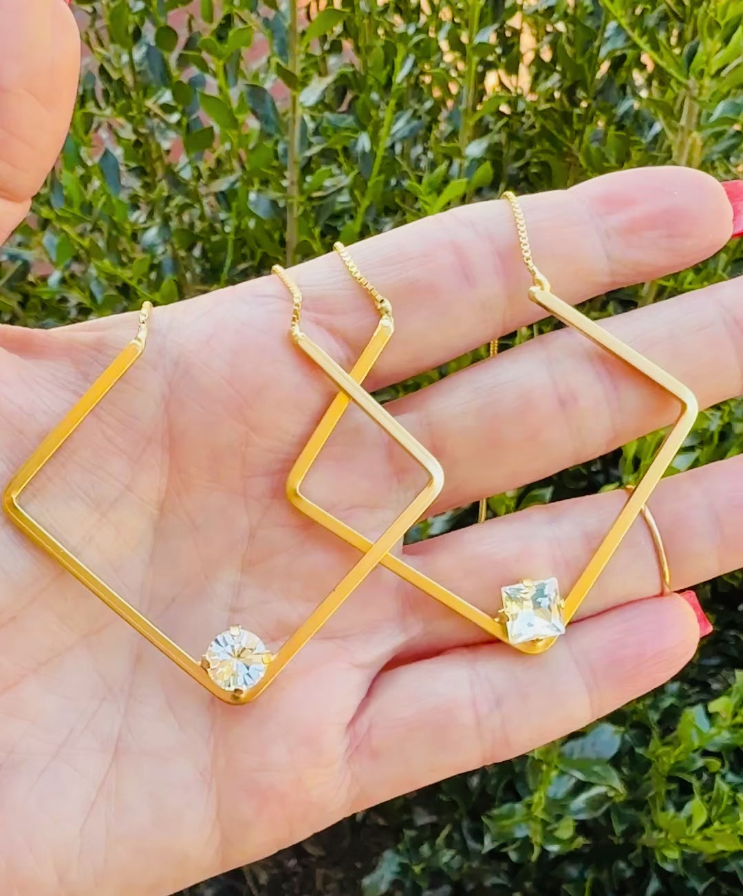 Geometric dreams do come true! Blair is a beautiful rhombus shaped pendant with a clear crystal accent (round and square) complete with a box chain, lobster claw clasp, logo disc, and crystal end charm.