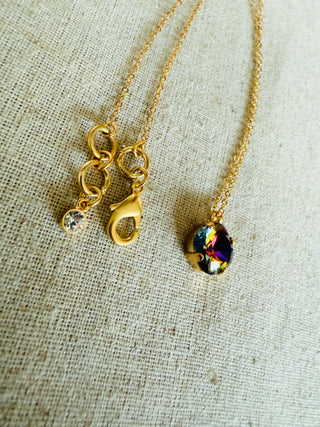 This stunning 12mm cushion cut crystal holds shimmering hints of every color you could wish for. It’s beautifully framed in a satin gold setting and comes with a matching chain, secure lobster clasp, and a delicate end charm for a truly elegant finish. 16" length