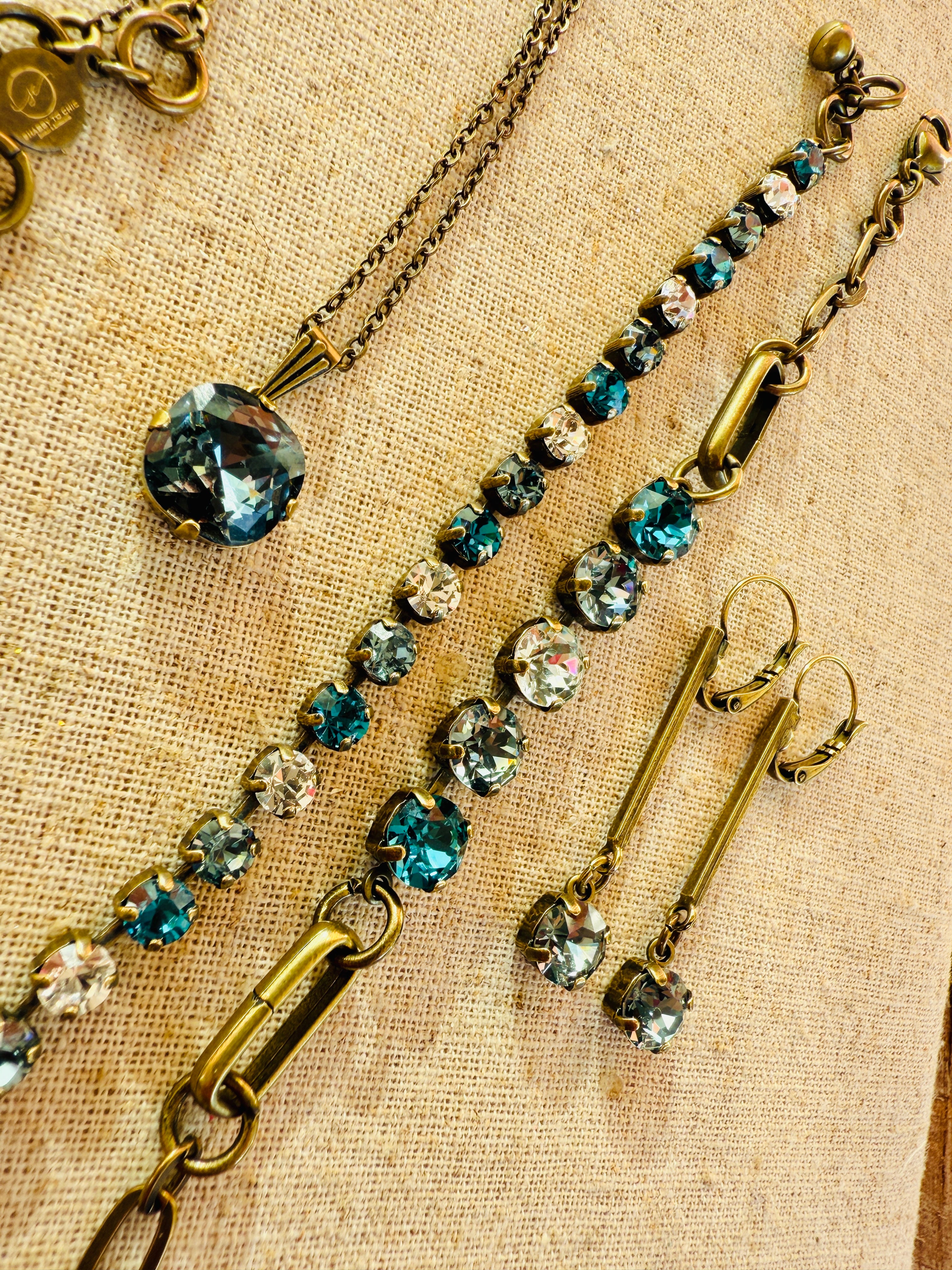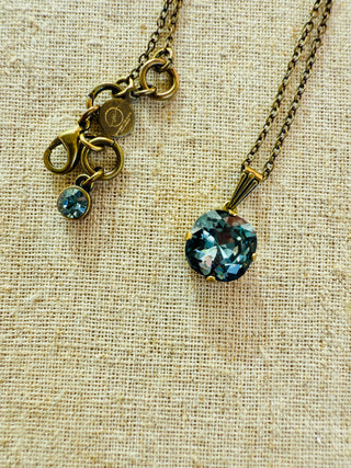 The perfect shade of dusky grey blue. This will be your favorite fall accessory. Square cushion cut crystal, 12mm in dusk blue, Antique gold finish.