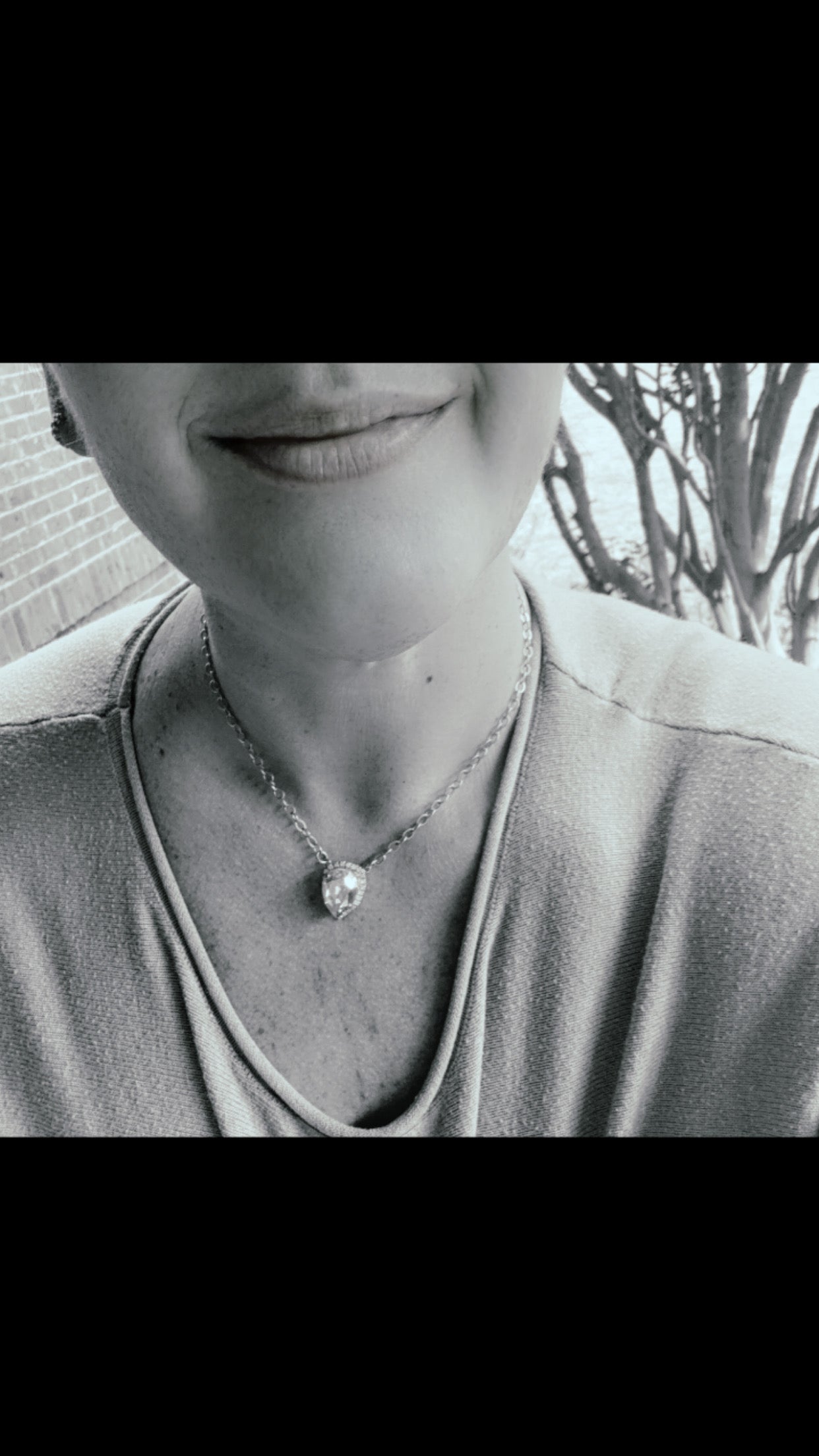 The Selena necklace has a pear shaped pendant centered on a rose gold chain. The setting is a sleek 18mm pear shaped pendant crystal, framed with a delicate halo of white opal crystals. 16" in length and complete with a extender chain, elegant dangle charm, charming logo disc, and secure lobster clasp.